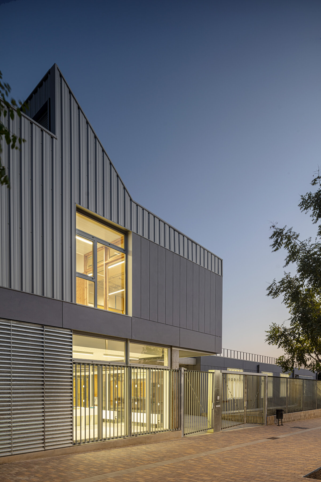 – Contrôle du rayonnement solaire et de l’éclairage naturel. Simulé avec Design Builder, l’angle d’inclinaison des toits en pente est spécialement gradué pour permettre au soleil de pénétrer dans les classes maternelles et le couloir seulement en hiver pour éviter l’effet d’éblouissement. Les ouvertures sont protégées par des persiennes motorisées et réglables.