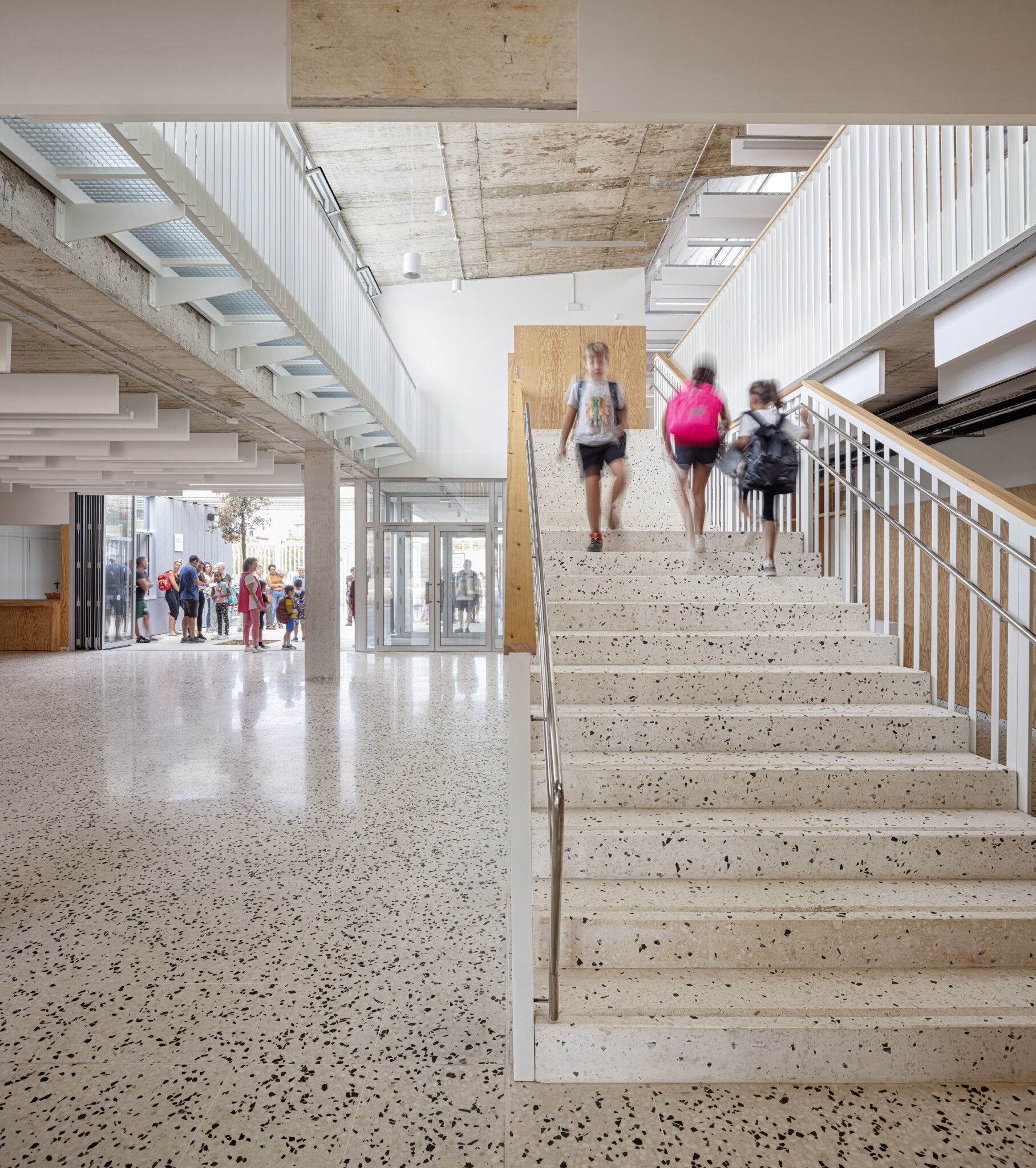 – Matériaux. Nous avons cherché à minimiser l’empreinte de CO2 avec un bilan écologique presque nul. La structure est en béton et durable et toutes les cloisons intérieures reconfigurables en plaques de plâtre stratifiées entre salles de classe et en bois naturel dans les couloirs. L’absorption acoustique est assurée par un matériau en fibre de bois 100 % organique.