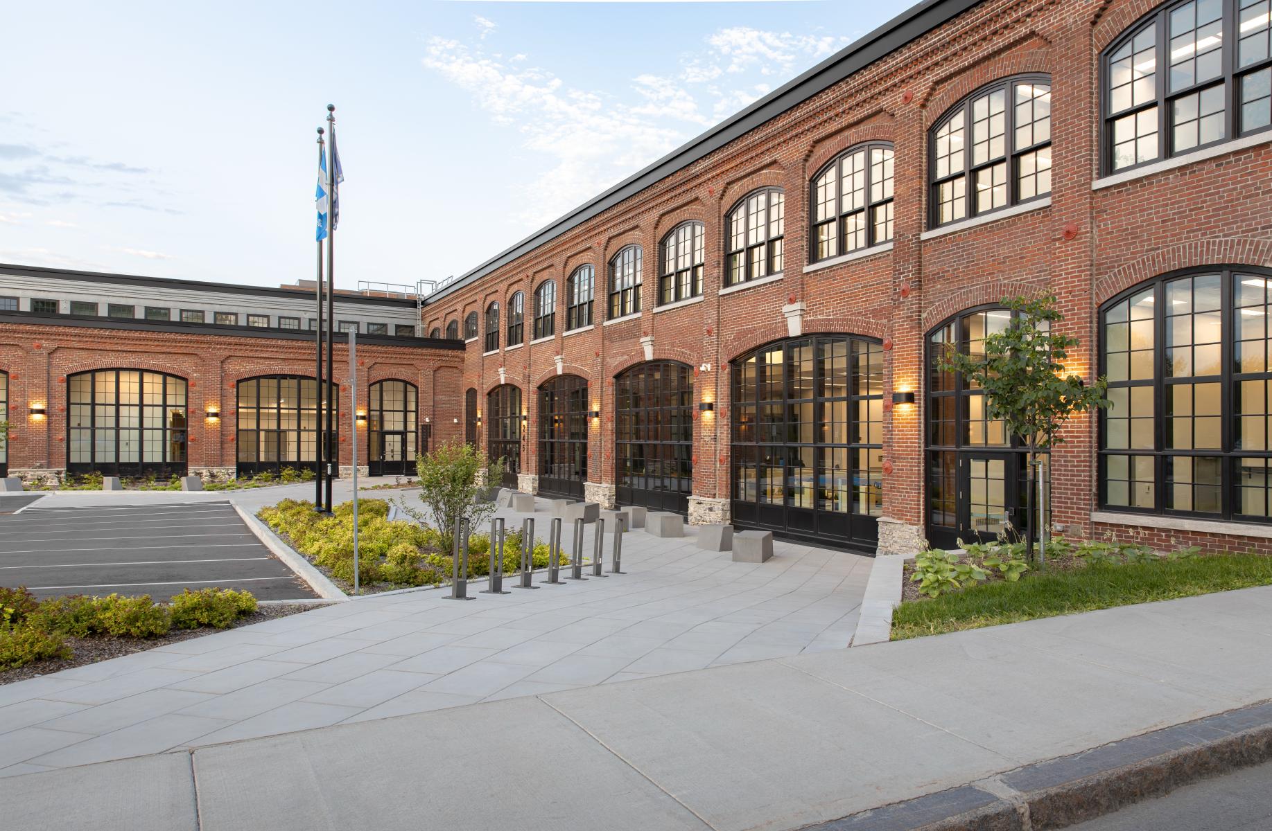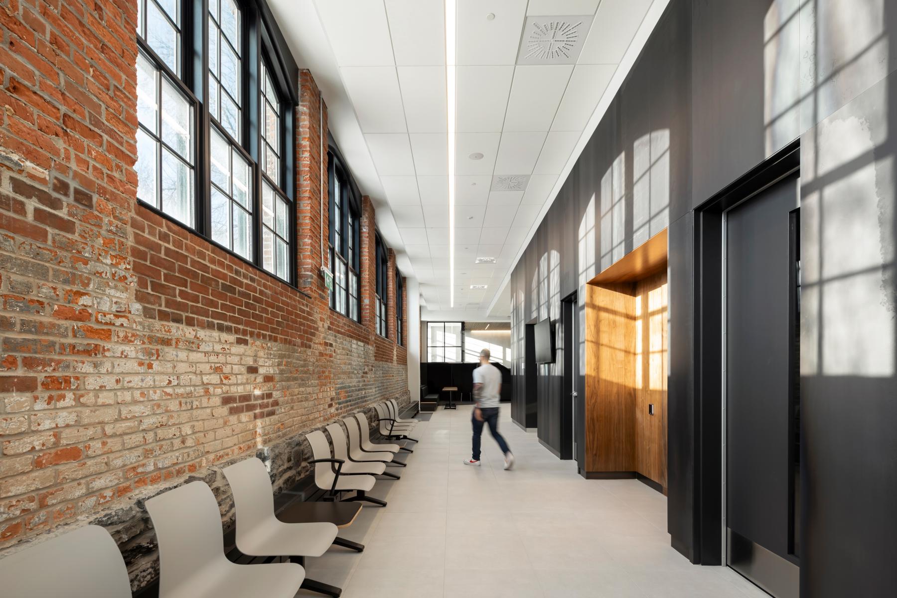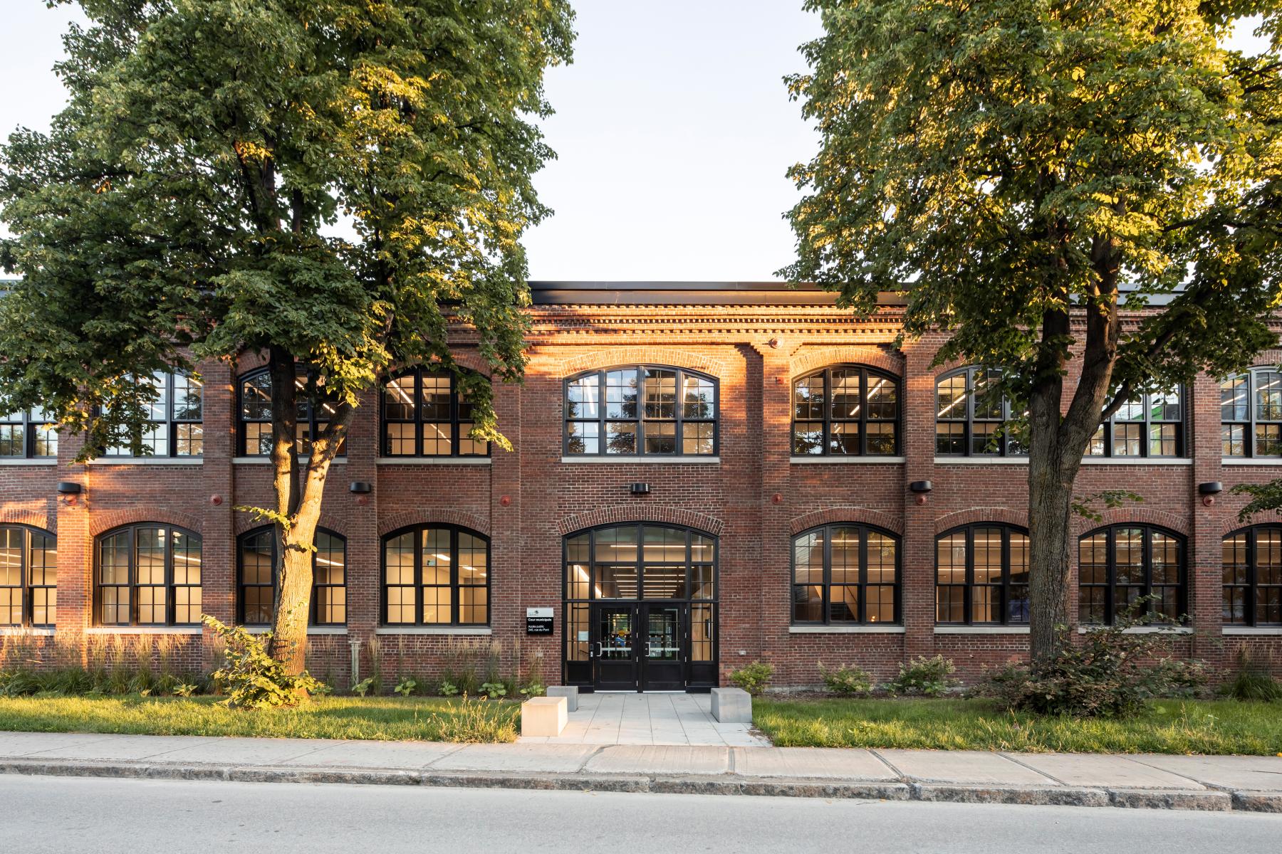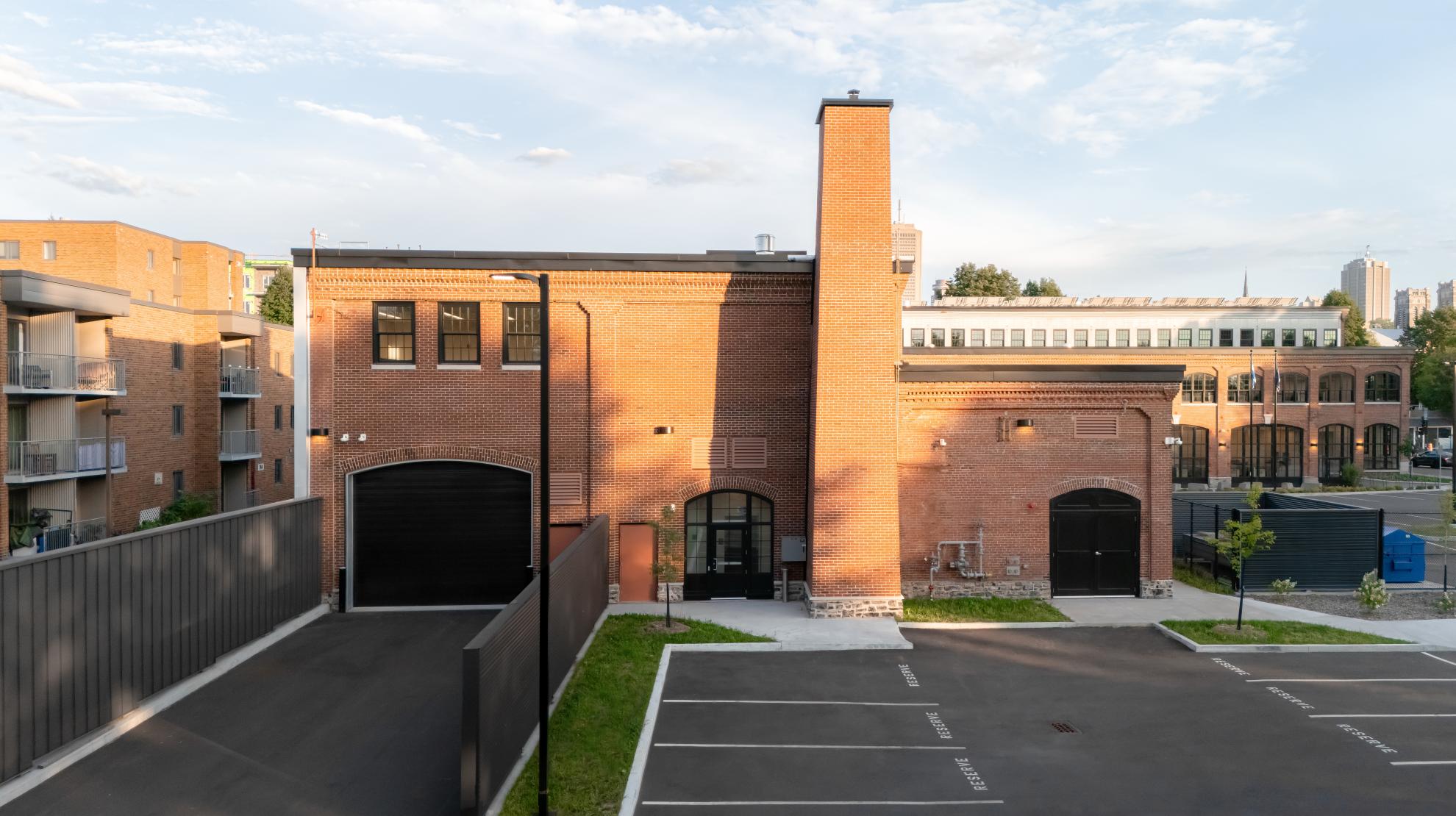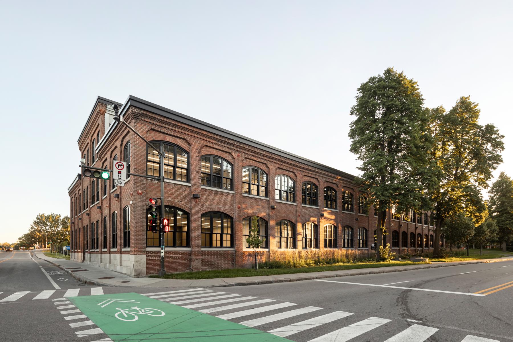 Construit entre 1907 et 1909, le bâtiment F.X. Drolet témoigne de l’architecture industrielle de l’époque avec ses façades en brique rouge, ses grandes fenêtres de bois cintrées, sa structure en maçonnerie massive et sa toiture en structure de bois. La réhabilitation a cherché à préserver ces caractéristiques tout en assurant une mise aux normes fonctionnelle et énergétique. L’intervention architecturale a notamment porté sur la restauration des façades, le nettoyage et la réparation des murs de brique, ainsi que le remplacement des fenêtres en bois pour allier performance énergétique et authenticité. La charpente en bois massif a été mise en valeur dans les espaces publics, et certains détails historiques, comme des rails de chemin de fer retrouvés au-dessus des fenêtres, ont été intégrés au design intérieur.