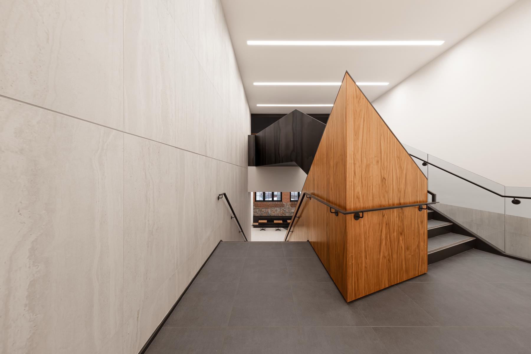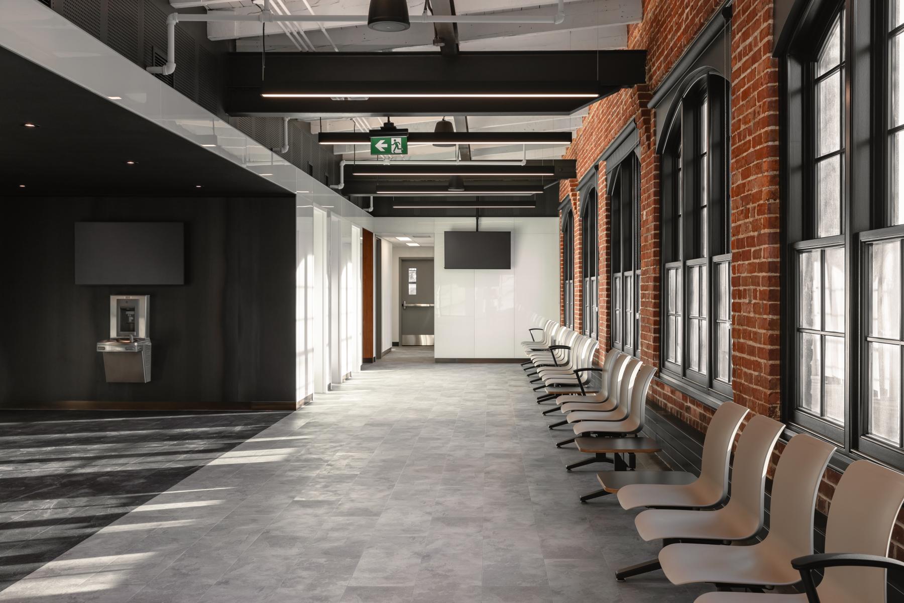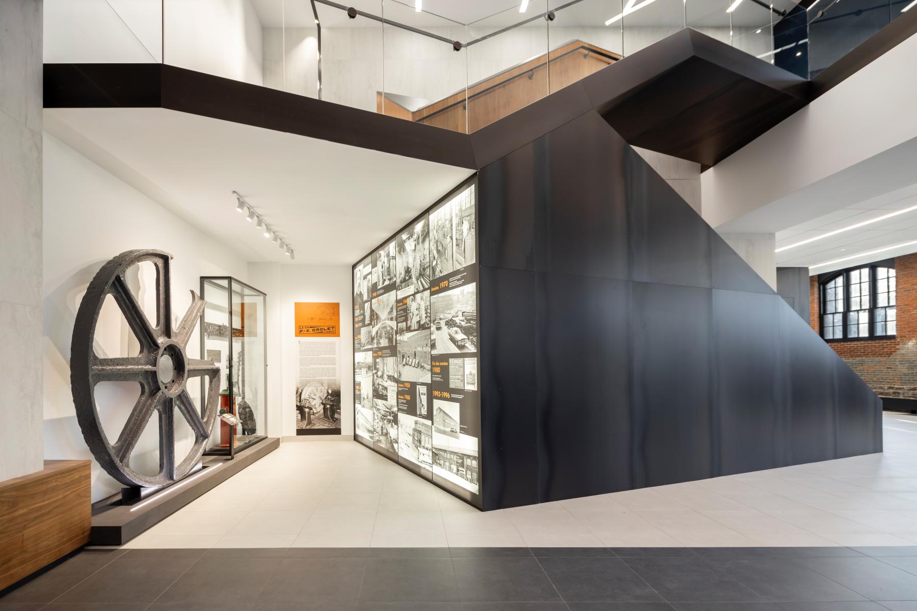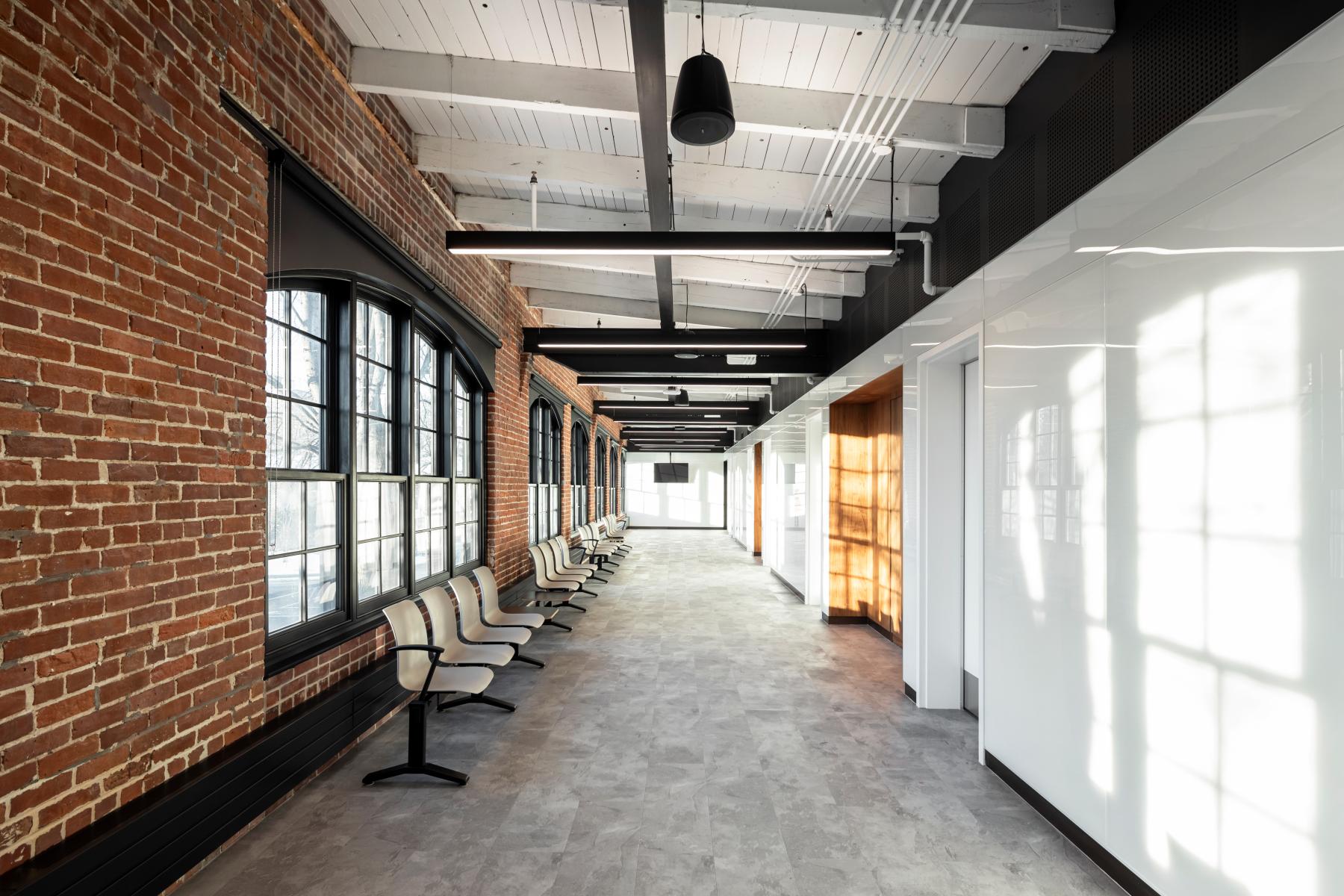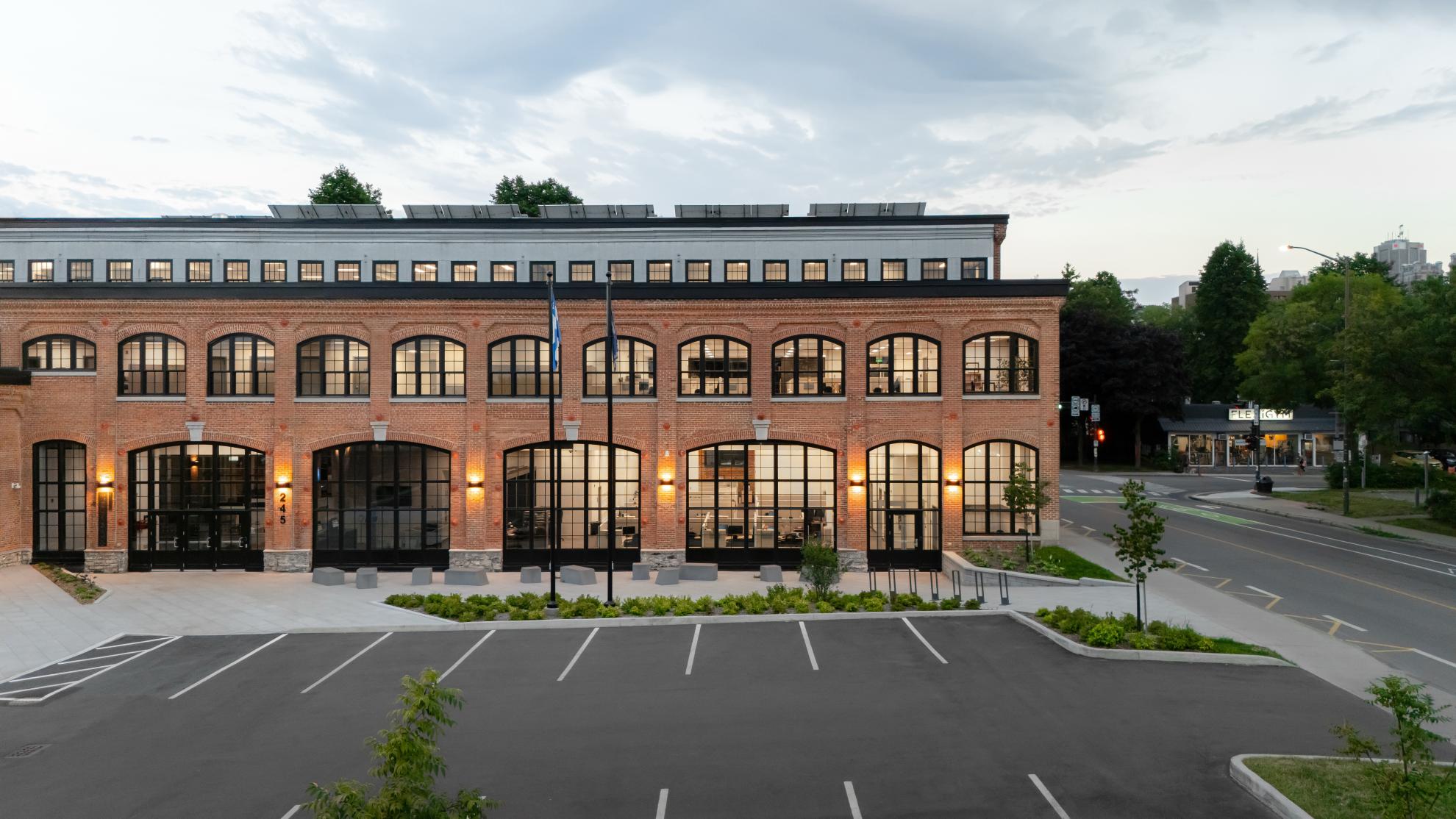 Construit entre 1907 et 1909, le bâtiment F.X. Drolet témoigne de l’architecture industrielle de l’époque avec ses façades en brique rouge, ses grandes fenêtres de bois cintrées, sa structure en maçonnerie massive et sa toiture en structure de bois. La réhabilitation a cherché à préserver ces caractéristiques tout en assurant une mise aux normes fonctionnelle et énergétique. L’intervention architecturale a notamment porté sur la restauration des façades, le nettoyage et la réparation des murs de brique, ainsi que le remplacement des fenêtres en bois pour allier performance énergétique et authenticité. La charpente en bois massif a été mise en valeur dans les espaces publics, et certains détails historiques, comme des rails de chemin de fer retrouvés au-dessus des fenêtres, ont été intégrés au design intérieur.