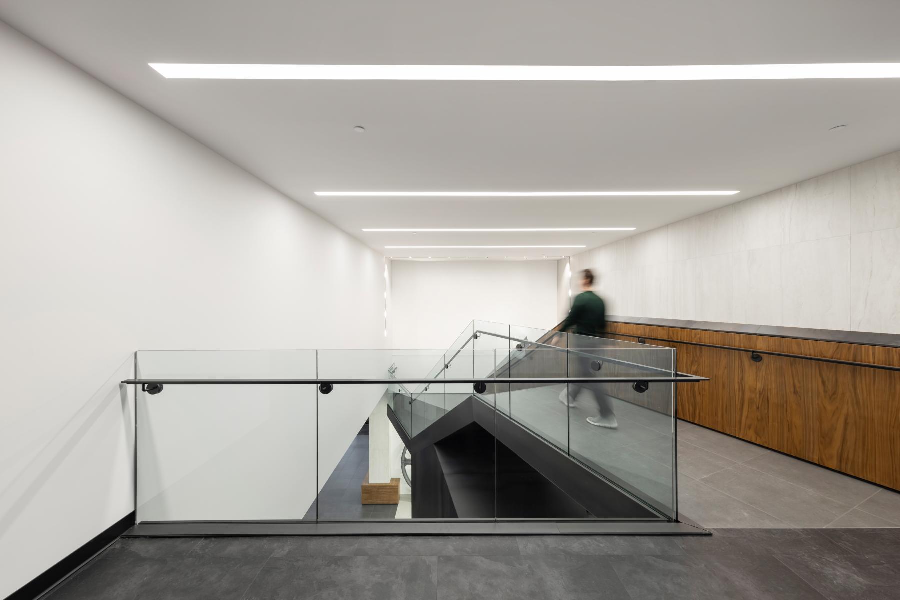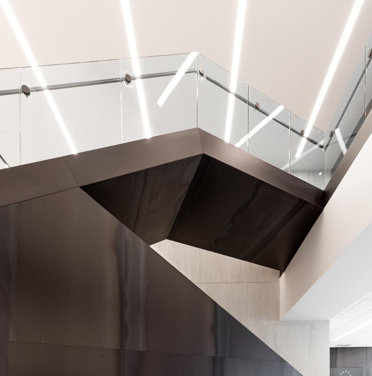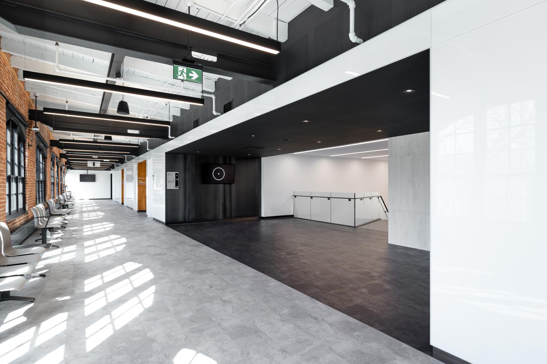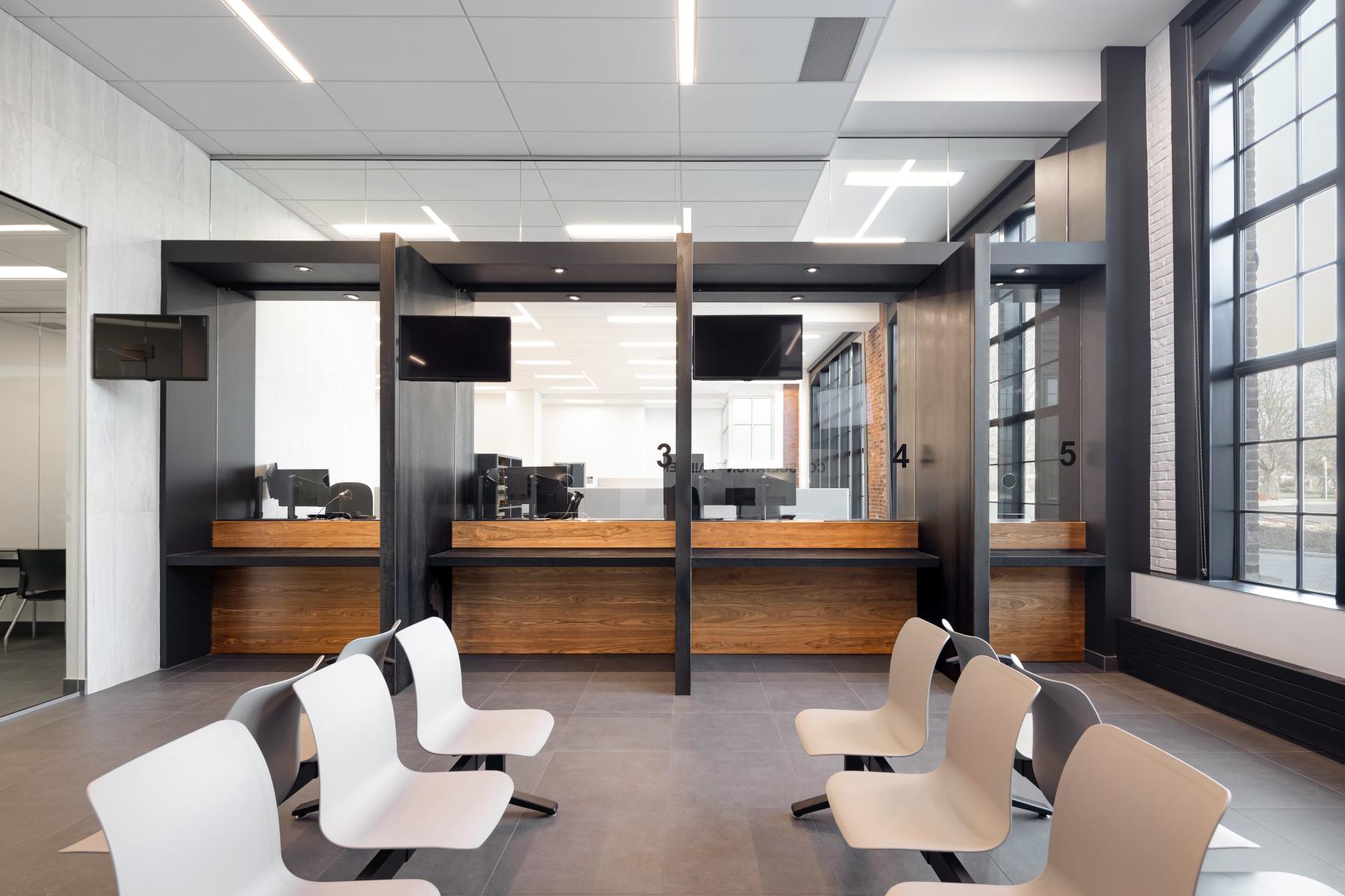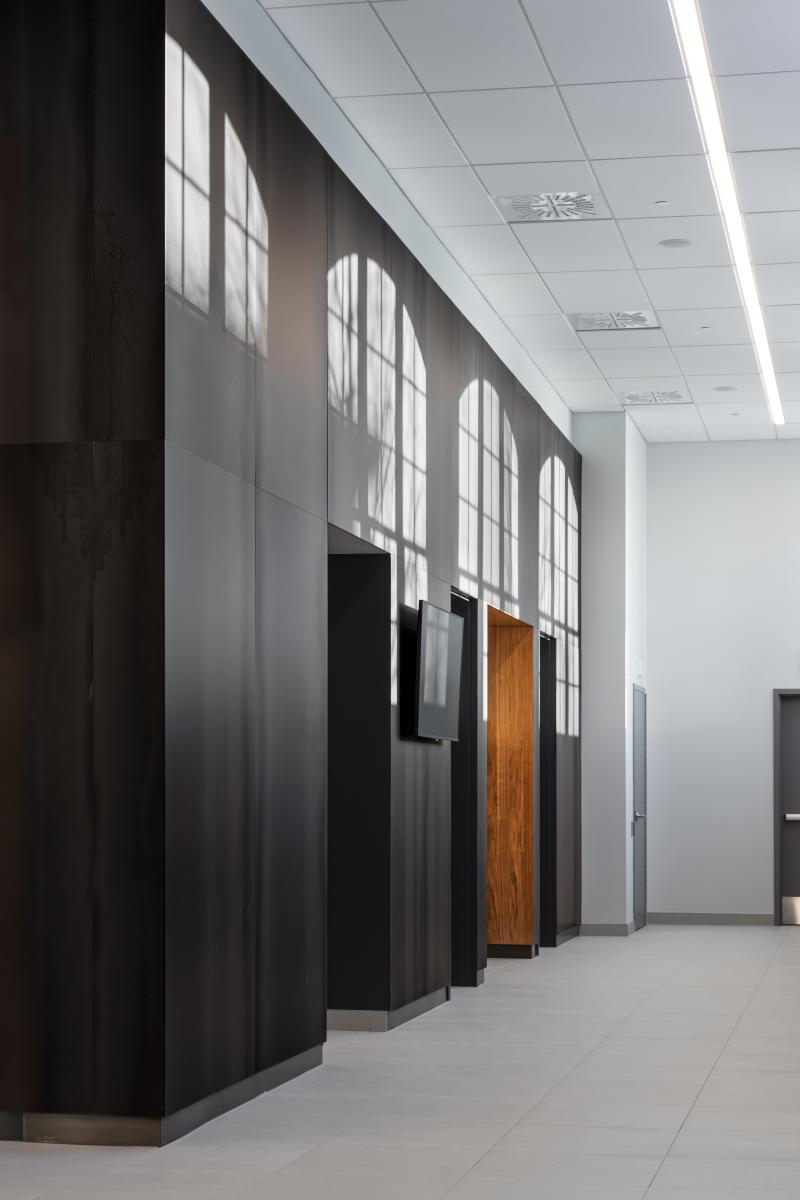 L’aménagement intérieur a été conçu pour maximiser l’apport en lumière naturelle, en libérant les murs extérieurs et en exploitant les grandes ouvertures d’origine. Le programme a été structuré autour de zones ouvertes, notamment un hall lumineux, des salles des pas-perdus et des espaces de travail fonctionnels. L’architecture intègre également des éléments contemporains qui dialoguent avec le passé : des panneaux métalliques bruts évoquant l’ancienne fonderie et des surfaces réfléchissantes contrastant avec la brique.