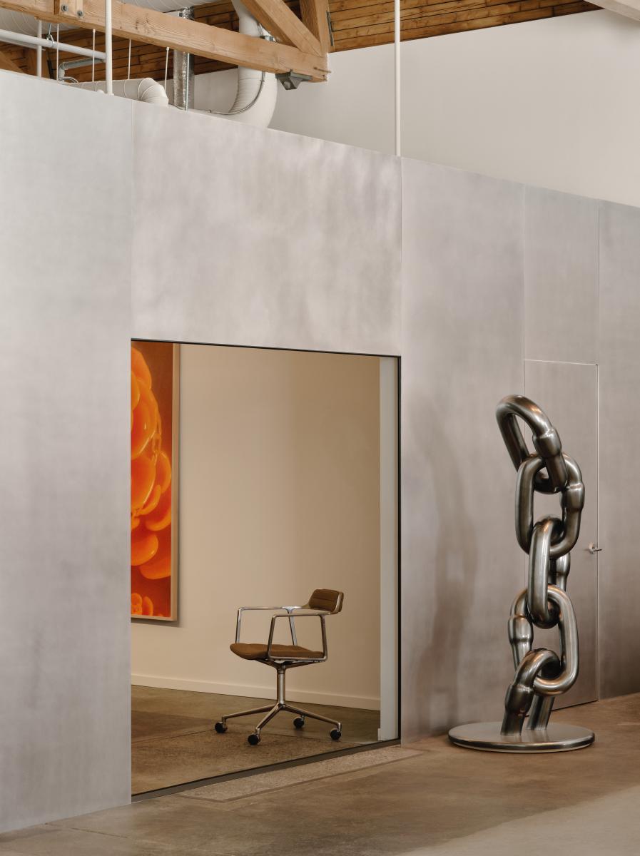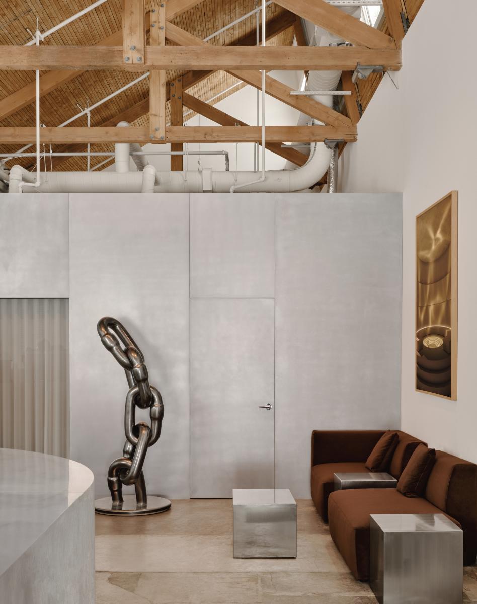 La galerie s’articule autour d’un volume central métallique brossé manuellement. À l’avant, le café lumineux s’ouvre sur le Parc des Gorilles via une grande porte de garage vitrée, accueillant les visiteurs dans une atmosphère à la fois brute et raffinée. Le comptoir minimaliste aux formes douces est recouvert d’un enduit de microciment artisanal. À l’arrière, une salle de projection offre un cadre intime pour les œuvres audiovisuelles. Le mobilier sur mesure du café est conçu par le designer local Raymond Raymond et complète l’aménagement avec une sobriété élégante. Le cube de métal contient un espace de travail et rencontre meublé d’une grande table par l'ébéniste montréalais Essai mobilier et des chaises danoises Vipp.