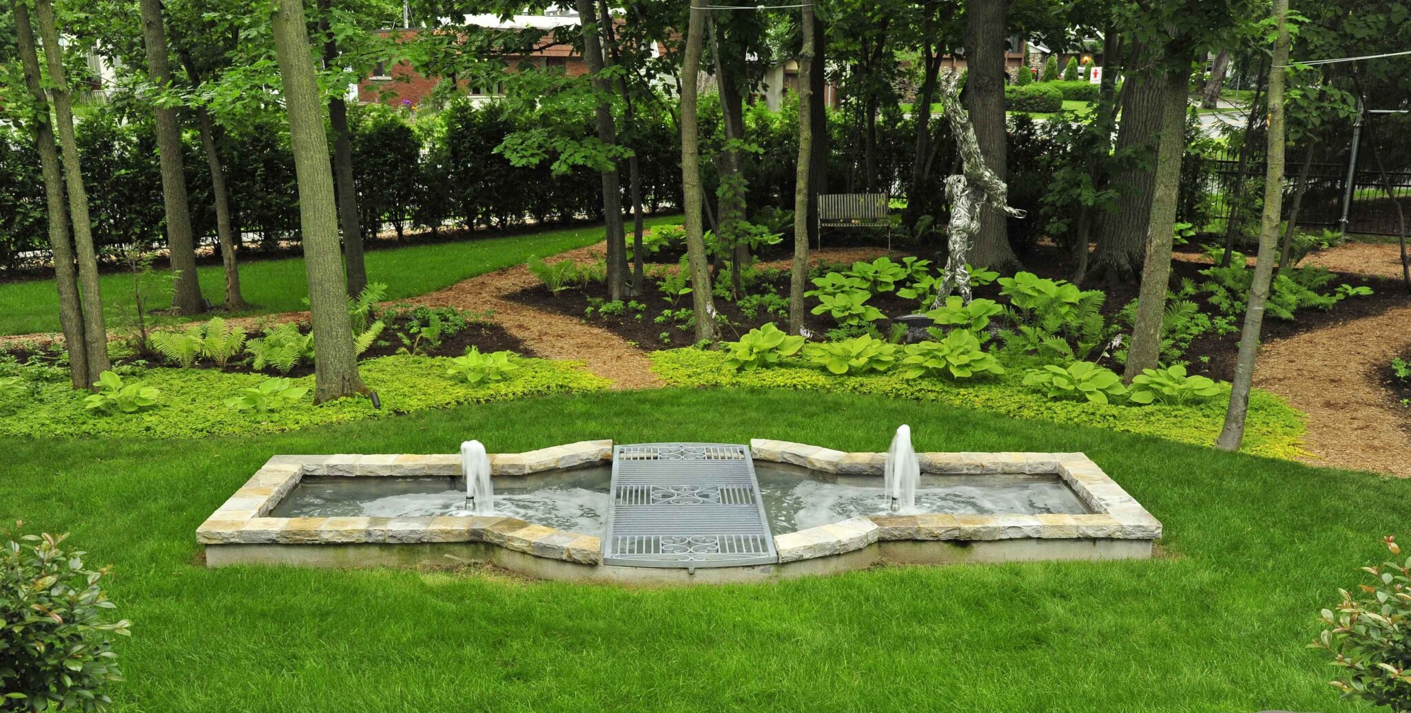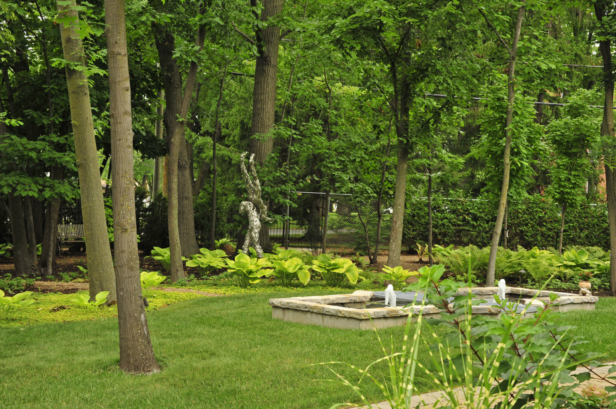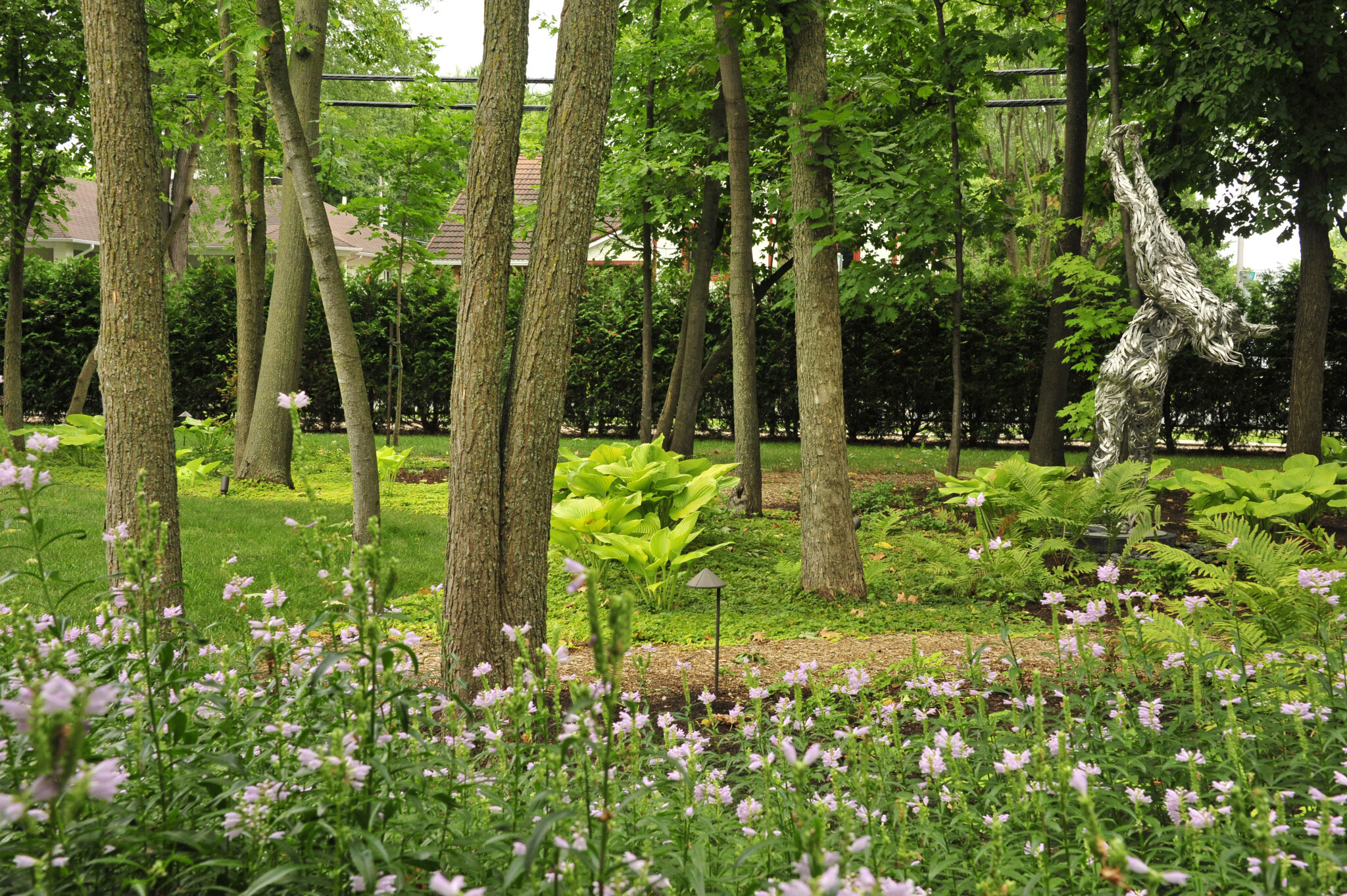 Nous composons ici avec les arbres existants en ajoutant des massifs de végétaux vivaces couvre-sol et arbustifs. Nous avons ici une grande pièce intégrée dans un mini boisé ou la température joue et crée des effets sur l’œuvre d’art au fils du temps et des saisons …