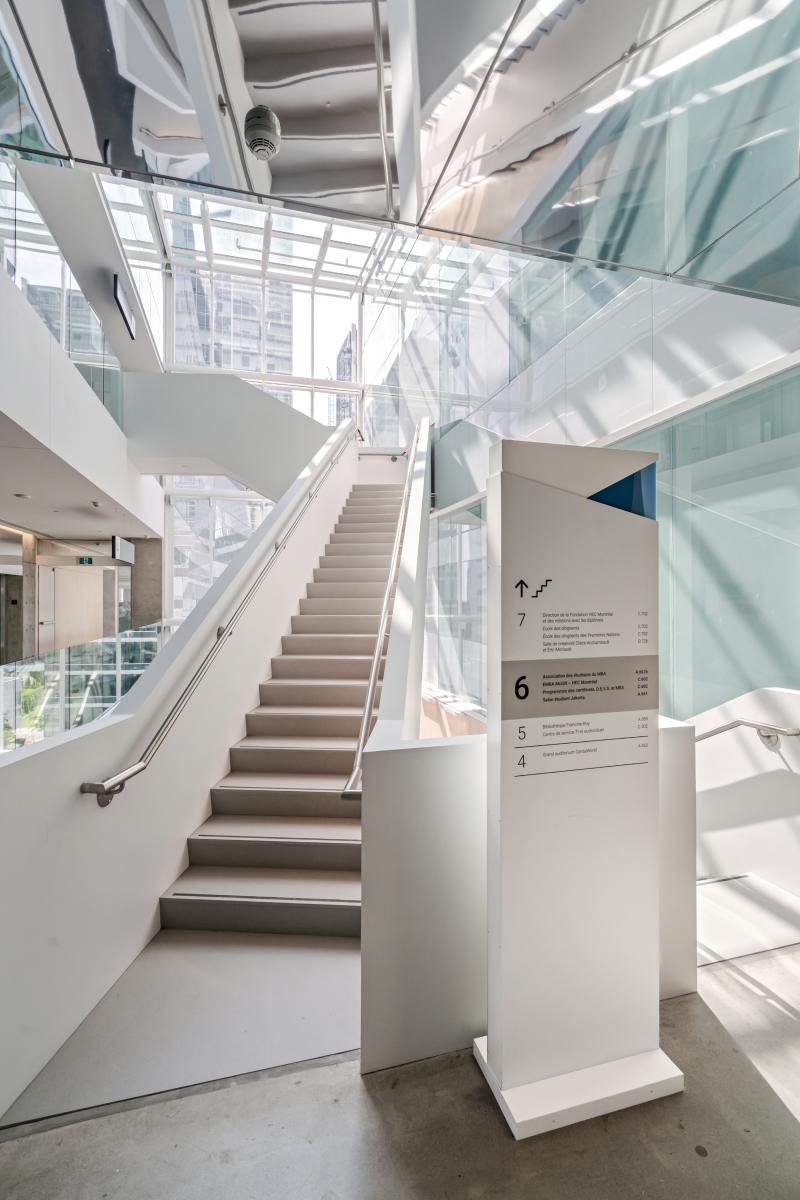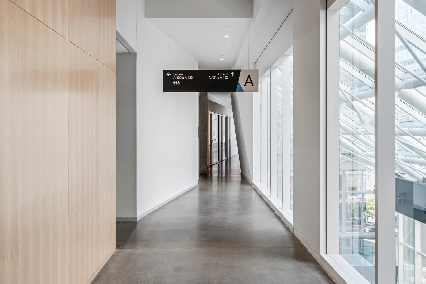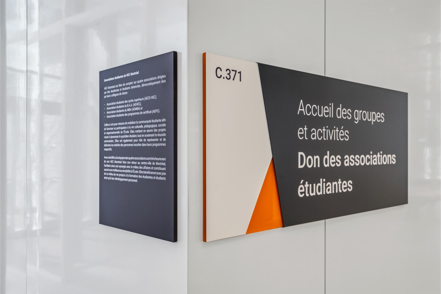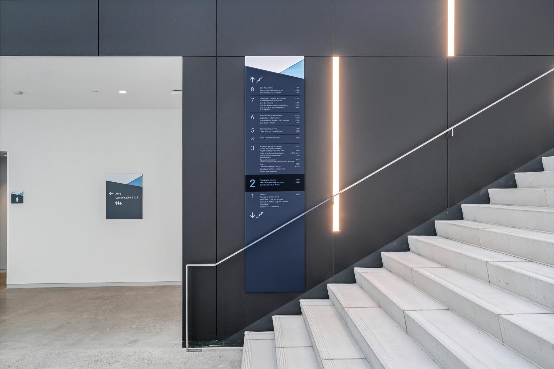 Le projet couvre l’ensemble du bâtiment : accès extérieurs, stationnements, circulations intérieures, espaces d’apprentissage, zones collaboratives et reconnaissance des donateurs. Chaque élément, qu’il soit directionnel, informatif ou narratif, a été conçu pour s’intégrer dans la matérialité des lieux, sans rupture ni surcharge. L’ensemble conjugue éléments statiques et dynamiques dans une logique de cohérence globale.