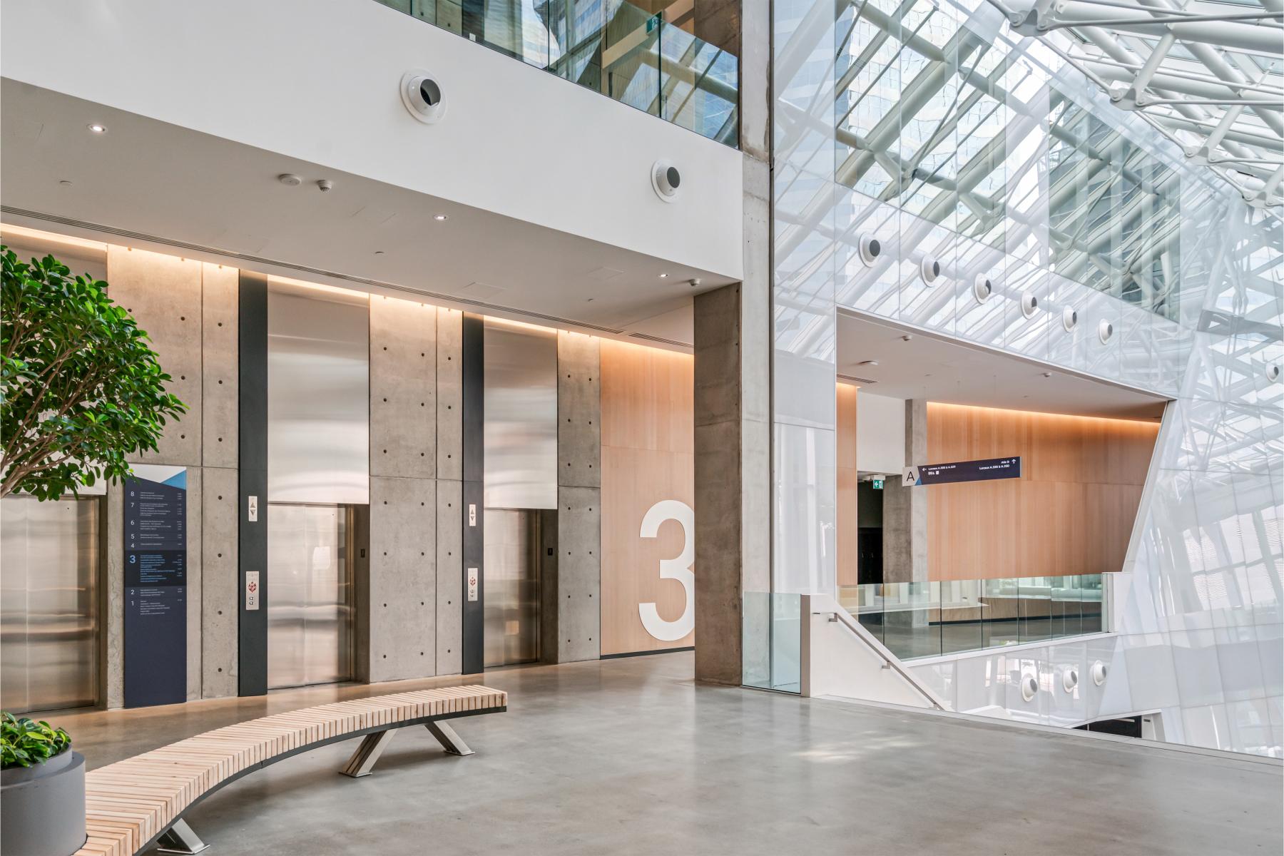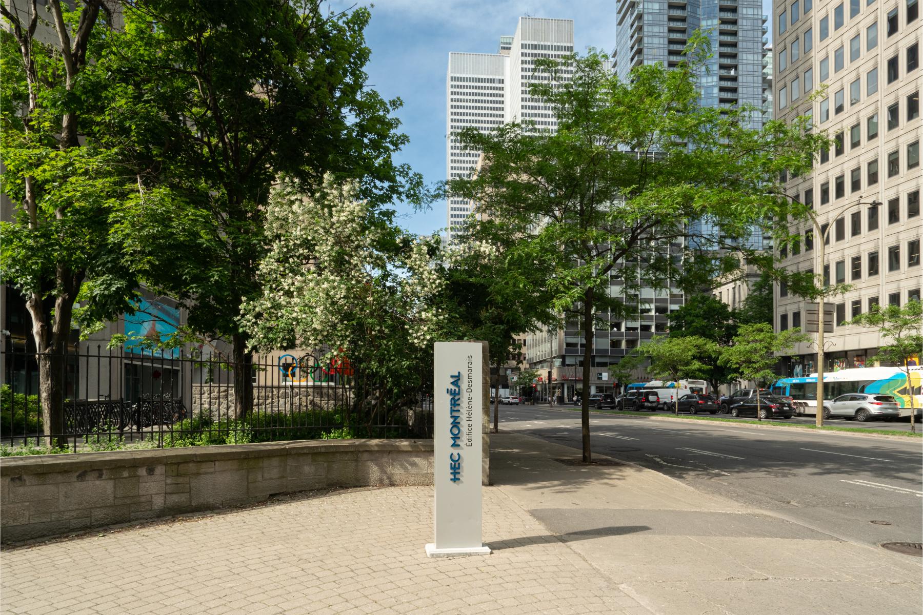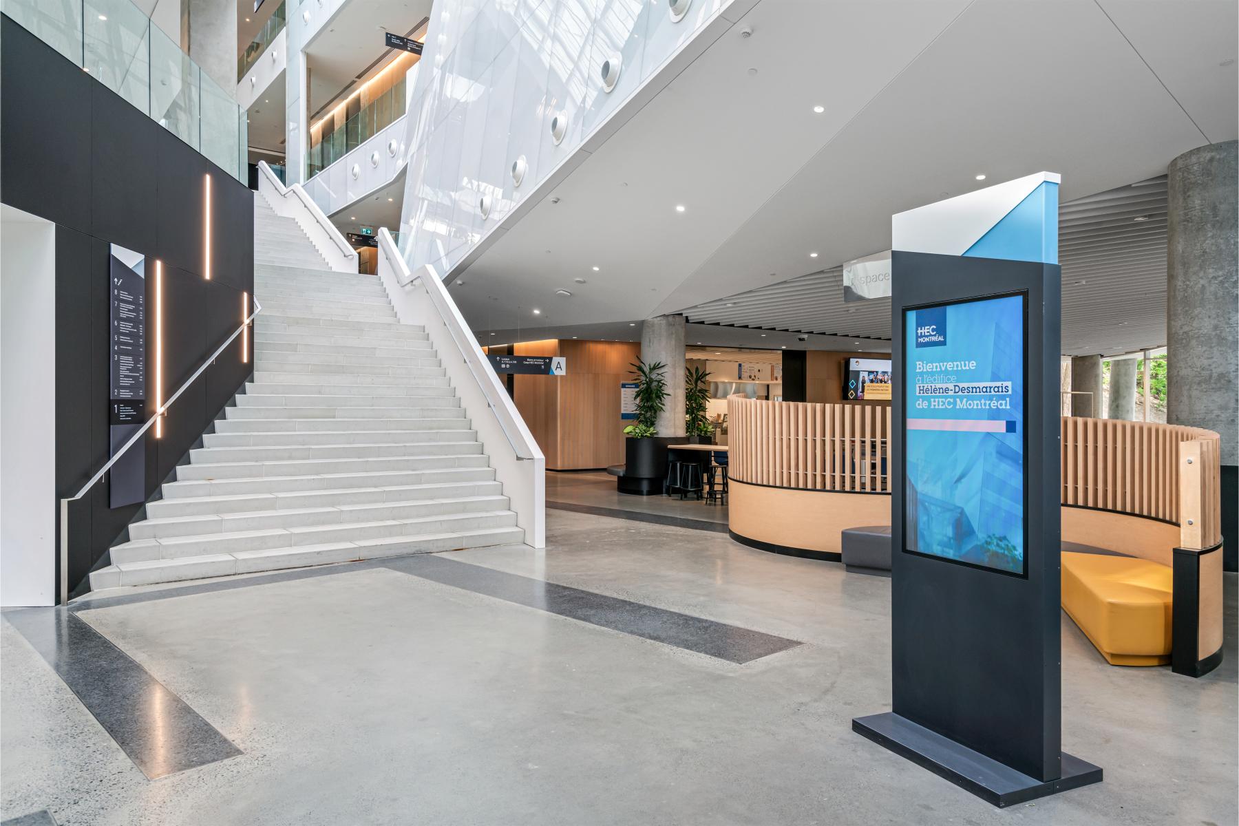 Situé en bordure du quartier des affaires de Montréal, l’édifice Hélène-Desmarais incarne la nouvelle présence urbaine de HEC Montréal au centre-ville. Ce bâtiment de 24 000 m², réparti sur huit niveaux, propose une expérience spatiale résolument contemporaine : volumes ouverts, transparences soigneusement calculées, percées visuelles et espaces baignés de lumière naturelle. L’architecture incarne une symbiose entre les contrastes saisonniers et la lumière du jour.