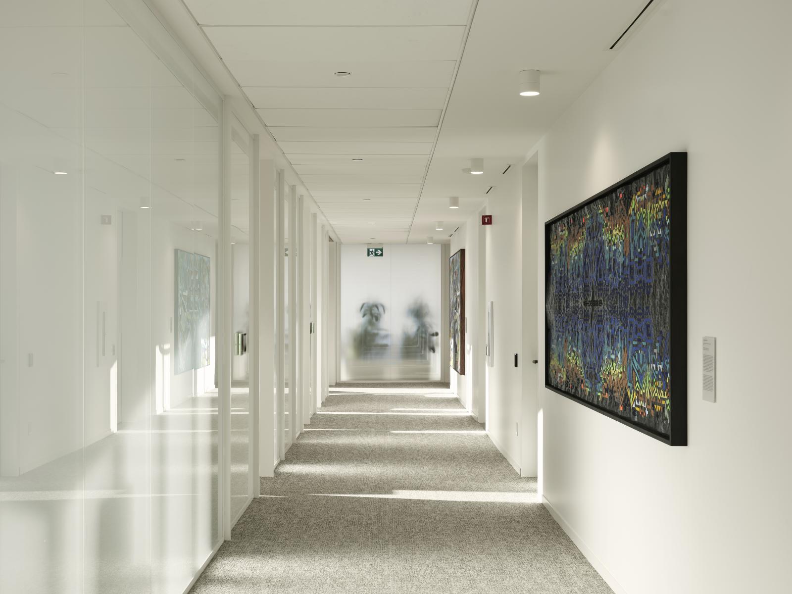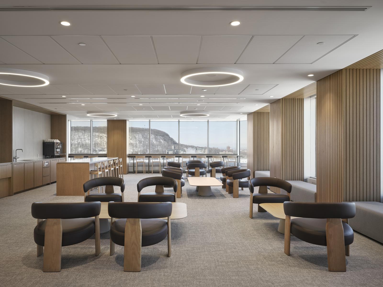 La structure du nouveau programme impliquait la reconfiguration des espaces privatifs de bureaux (passant de 51% à 41%) et des espaces communs (passant de 16% à 29%), permettant d’optimiser l’existant par une hausse du nombre de collaborateurs effectuée sans agrandir la superficie des installations. De plus, une boucle de circulation centrale proposant un éventail d’espaces identitaires (réception, escalier interne, espaces de ravitaillement, salon du personnel, bibliothèque, salons de rencontre, etc.) et permettant l’accès à un poste d’observation extérieure depuis chaque quadrant d’un même niveau a été intégrée à chaque étage. Ces postes offrent à la fois des percées visuelles sur l’extérieur, un apport supérieur en lumière naturelle et des repères d’orientation en fonction des vues sur le paysage montréalais.