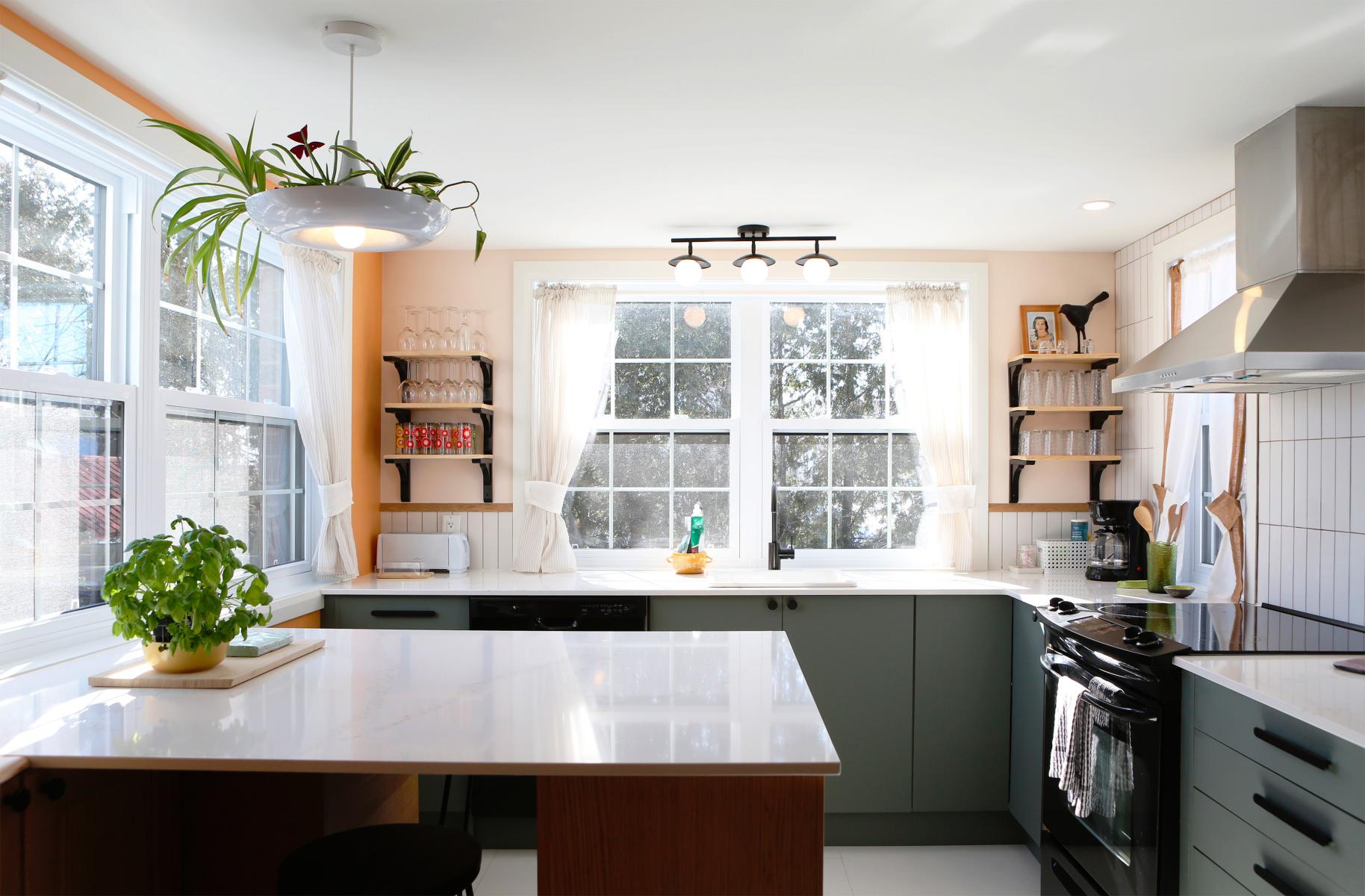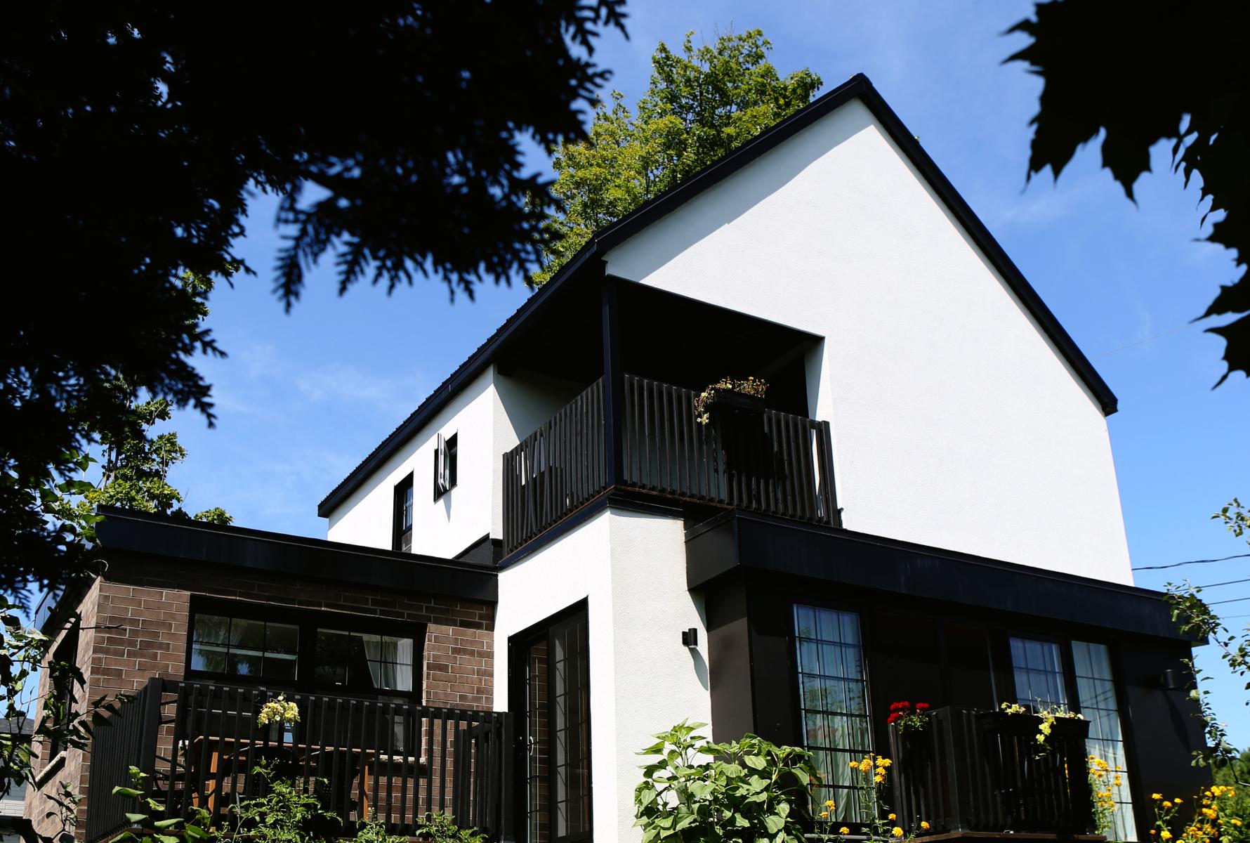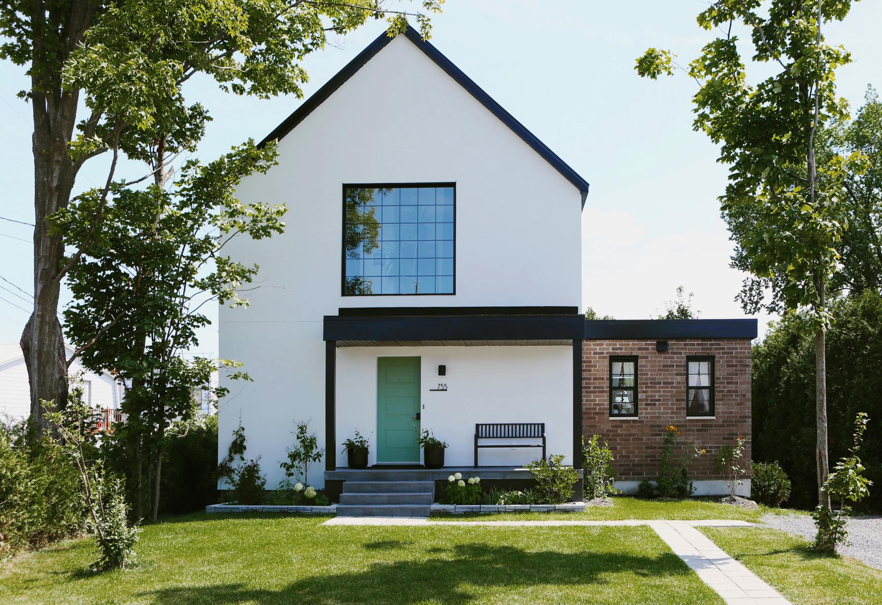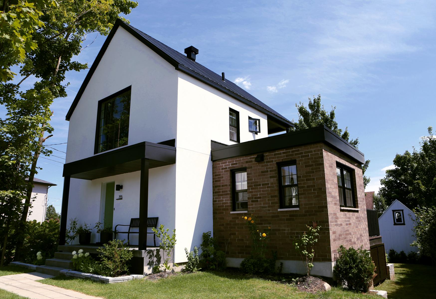 Avec son arche décorative en guise de porte de bienvenue, la cuisine se présente comme une petite alcôve privée invitante. De forme carrée, elle se distingue aussi bien de l’intérieur que de l’extérieur qui est recouvert de brique d’inspiration anglaise, contrastant avec le stuc acrylique blanc et la tôle noire qui recouvre le reste de la maison. Cette cuisine est dotée d’un grand îlot central pratique pour cuisiner ou se réunir en famille ainsi que des armoires qui se caractérisent par un mélange de panneaux de chêne recyclé et de fibres de bois. Comme ailleurs dans la maison, cette pièce possède une fenestration à guillotine abondante sur ses trois côtés, les deux fenêtres qui sont adjacentes à la terrasse d’été favorisent le transfert des plats cuisinés de l’intérieur à l’extérieur, ce qui ajoute à ce lieu un petit côté sympathique et pratique.