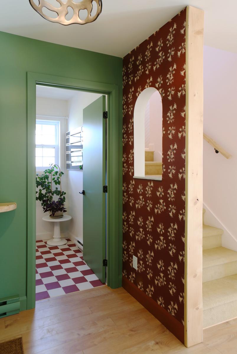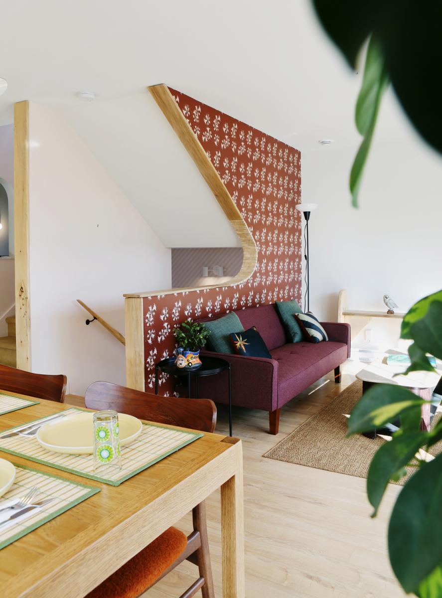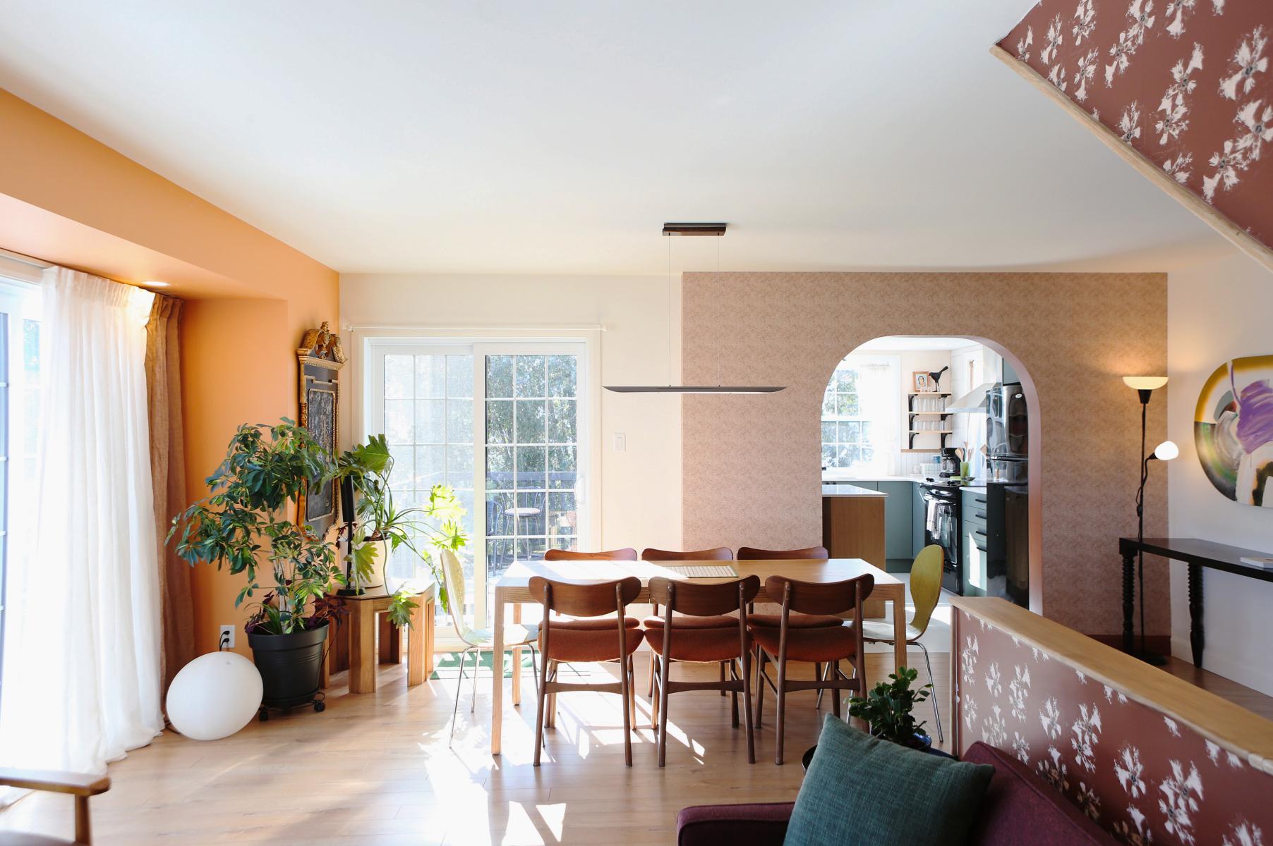 Le mur surplombant la cour arrière est muni de grandes portes coulissantes et d’un balcon Juliette pour admirer le grand pommier qui domine le terrain et faire entrer toute la lumière sans filtre. Au salon, la cloison que partage l’escalier en forme de L et le salon a été allégée grâce à son ouverture arrondie particulière, qui augmente l'effet spacieux de cet espace. Les mains courantes et les rampes ont été fabriquées artisanalement avec du bois d’orme, une matière omniprésente sur chaque étage et qui ajoute un côté naturel brut au décor.