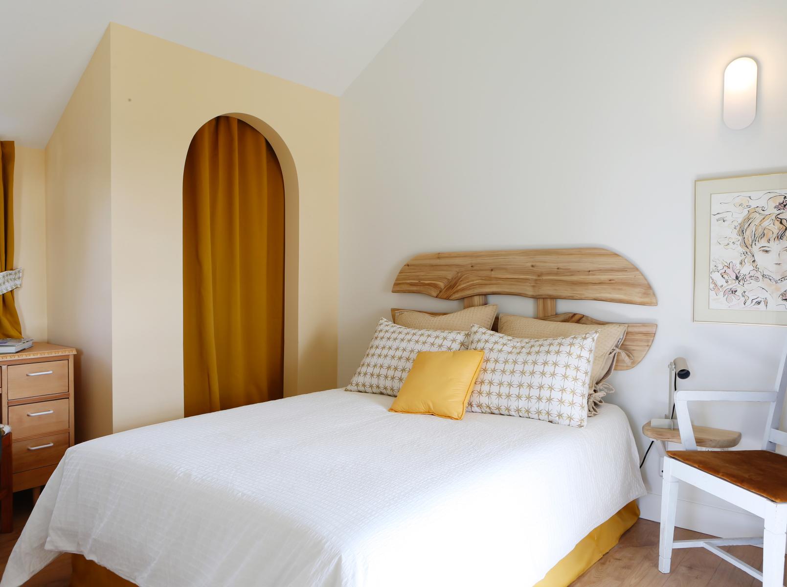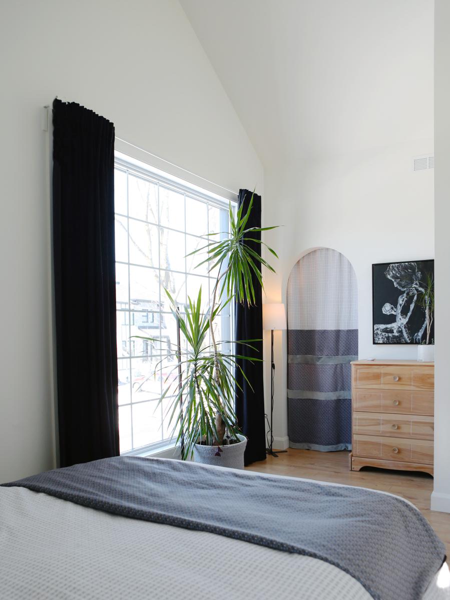 La chambre des maîtres qui s'étale sur 20 pieds de long est spectaculaire grâce à la présence de cette immense fenêtre centrale à carreaux, qui se remarque surtout de l’extérieur, en façade. Les carreaux ont été un choix attribué à l’entièreté de la fenestration de la maison, afin de donner un petit côté campagnard à l’ensemble du projet. Cette chambre possède également une grande penderie, qui peut également servir d'espace de travail. La chambre jaune, qui pourrait aussi servir de bureau, est plus petite mais sa valeur est accentuée grâce à sa grande terrasse privée et sa vue sur la ville de Québec.