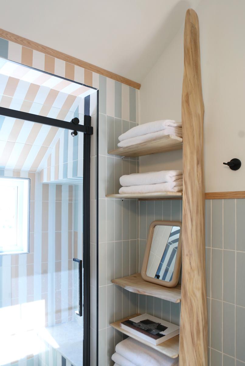 En montant l'escalier recouvert de tapis moelleux qui mène à l'étage, vous serez envahi par un sentiment chaleureux. Le plafond cathédral ainsi que les deux fenêtres panoramiques de cette zone donnent une impression de grandeur. Dans cette montée couverte de papier peint aux lignes obliques rosées, on peut observer plusieurs œuvres originales menant à la salle de bain des maîtres. On ne peut pas manquer l'esthétique surprenante de la douche, qui se distingue par sa mosaïque en céramique aux teintes pastels, son banc intégré et son étagère murale unique qui met encore une fois à l'honneur le bois d'orme.