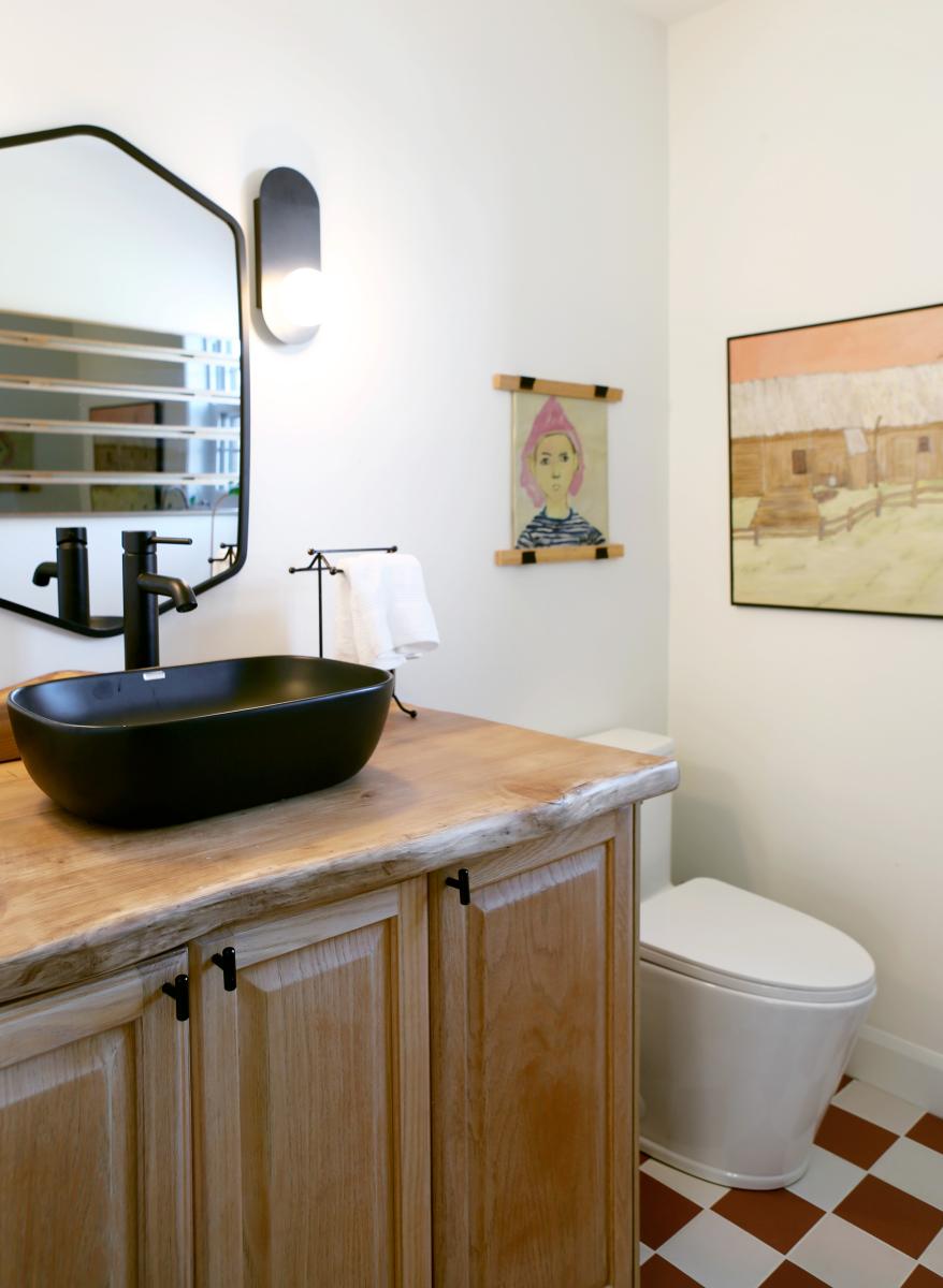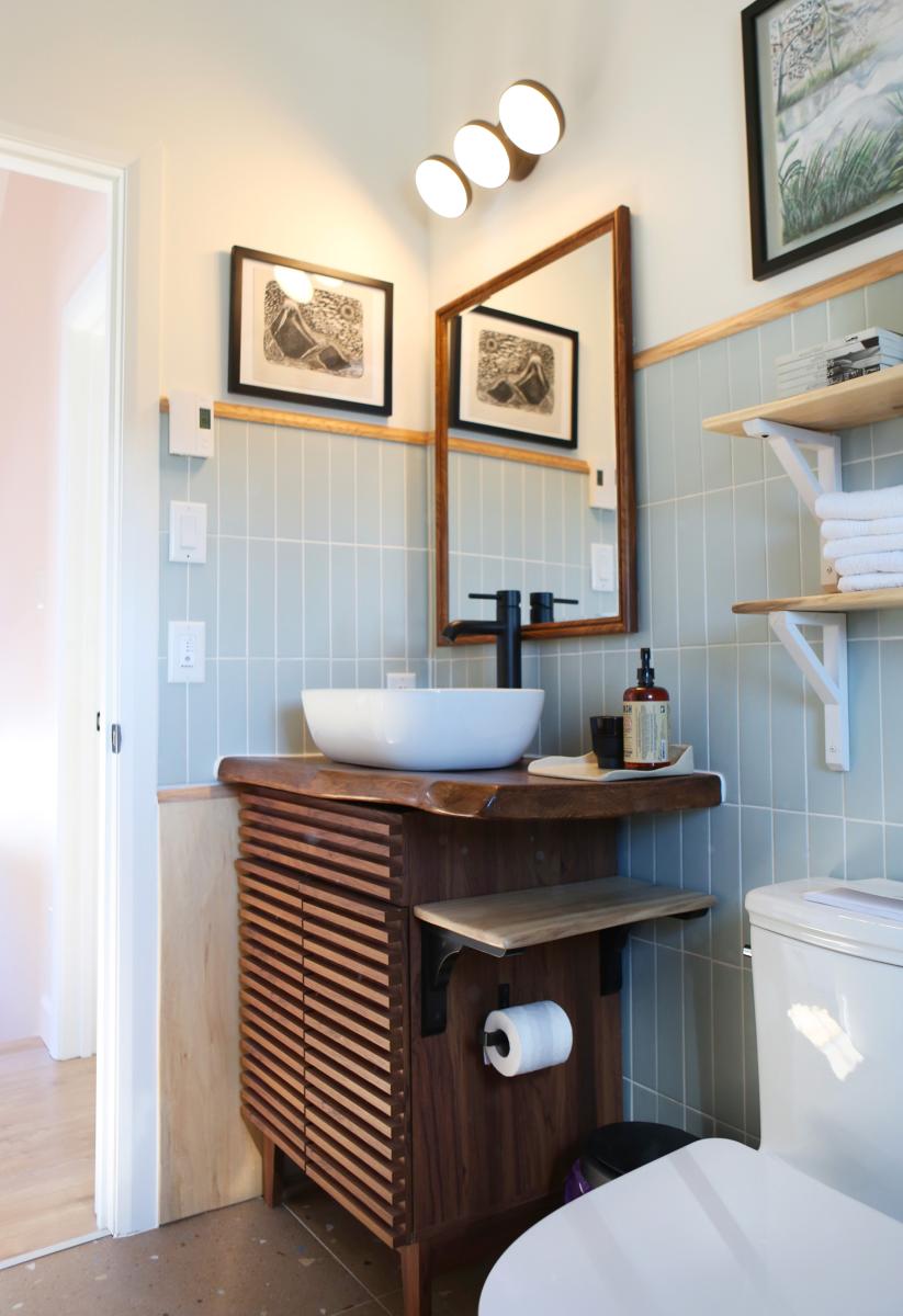 Les deux salles de bains et la salle d’eau du rez-de-chaussée sont également teintées d’originalité, leur comptoir massif en bois sculpté, leur lavabo de forme ovale et leur planchers de tuile de céramique mattes forment un amalgame harmonieux. Il y a aussi de nombreux espaces de rangement dans la maison, qui sont munis de tablettes en bois confectionnées avec soin et respectant leurs courbes originales.
