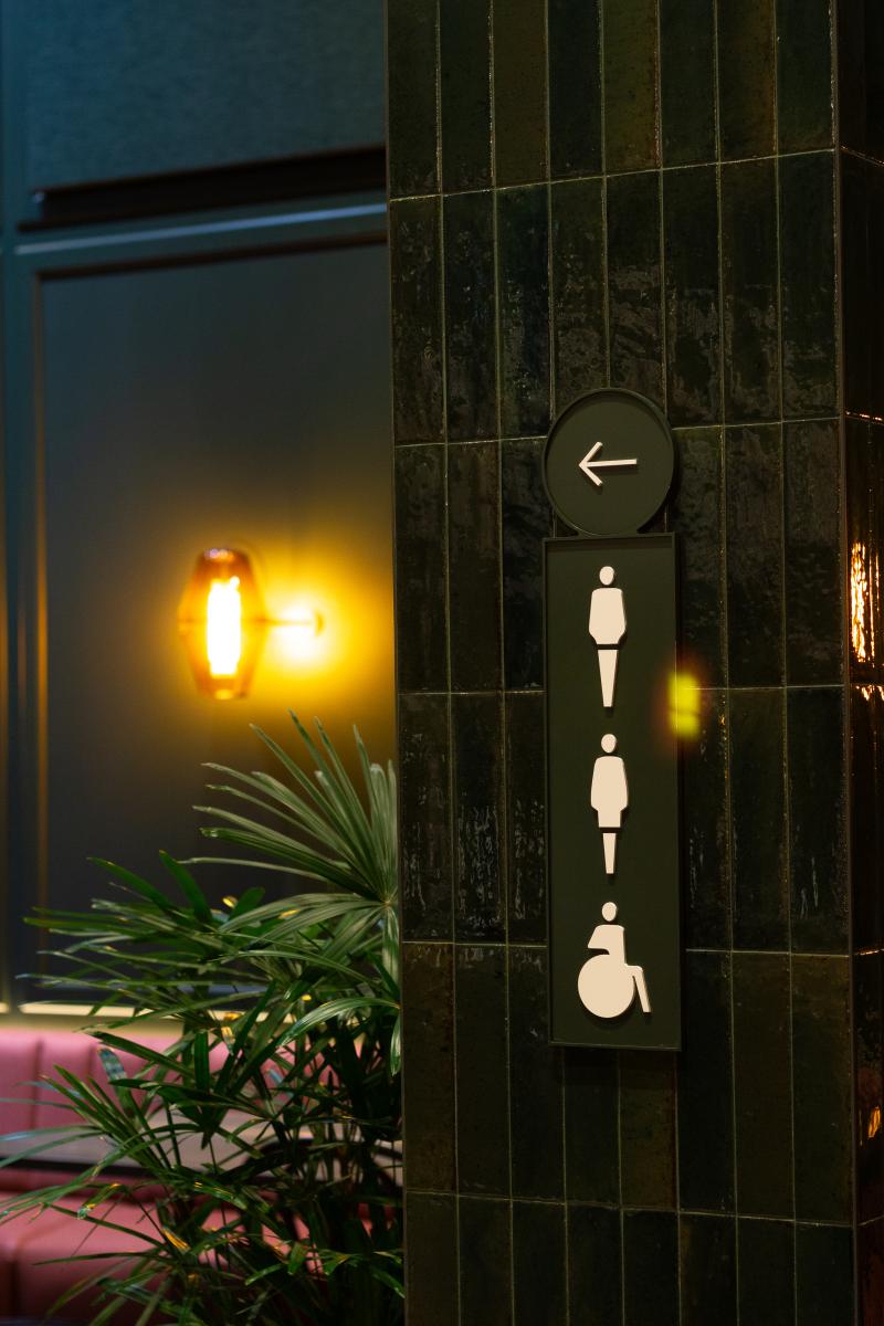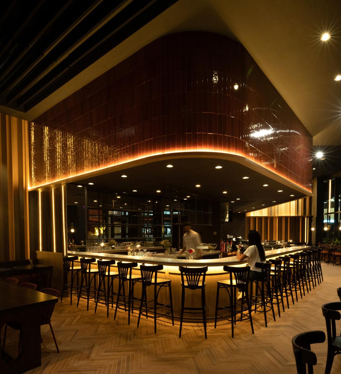 Le béton poli et des éléments industriels posent une base audacieuse, adoucie par des surfaces texturées et des tons chaleureux et terreux rappelant les cafés européens. Des nuances de vert, inspirées des paysages provençaux, insufflent une touche de vitalité, tandis qu’une végétation abondante favorise une connexion biophilique qui enrichit l’ambiance générale. Un éclairage sur mesure, conçu par une entreprise locale, accompagne la transition du jour à la nuit, renforçant ainsi la dualité du lieu.