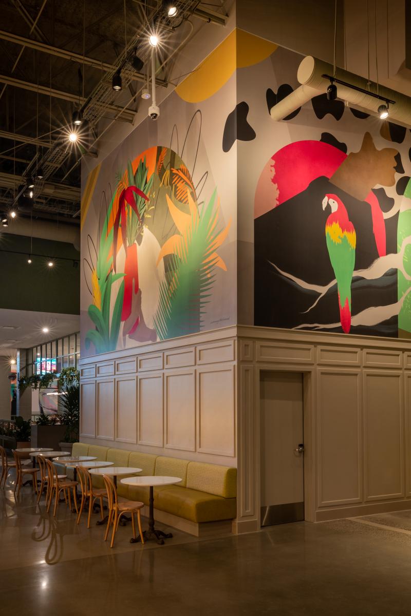 La grande murale qui habille la cage d’ascenseur centrale, conçue sur mesure par l’équipe de design graphique de LemayMichaud, agit à la fois comme point central de l’espace et élément unificateur du design. Inspirée du réalisme magique, la murale fusionne surréalisme et végétation luxuriante, apportant profondeur et caractère.