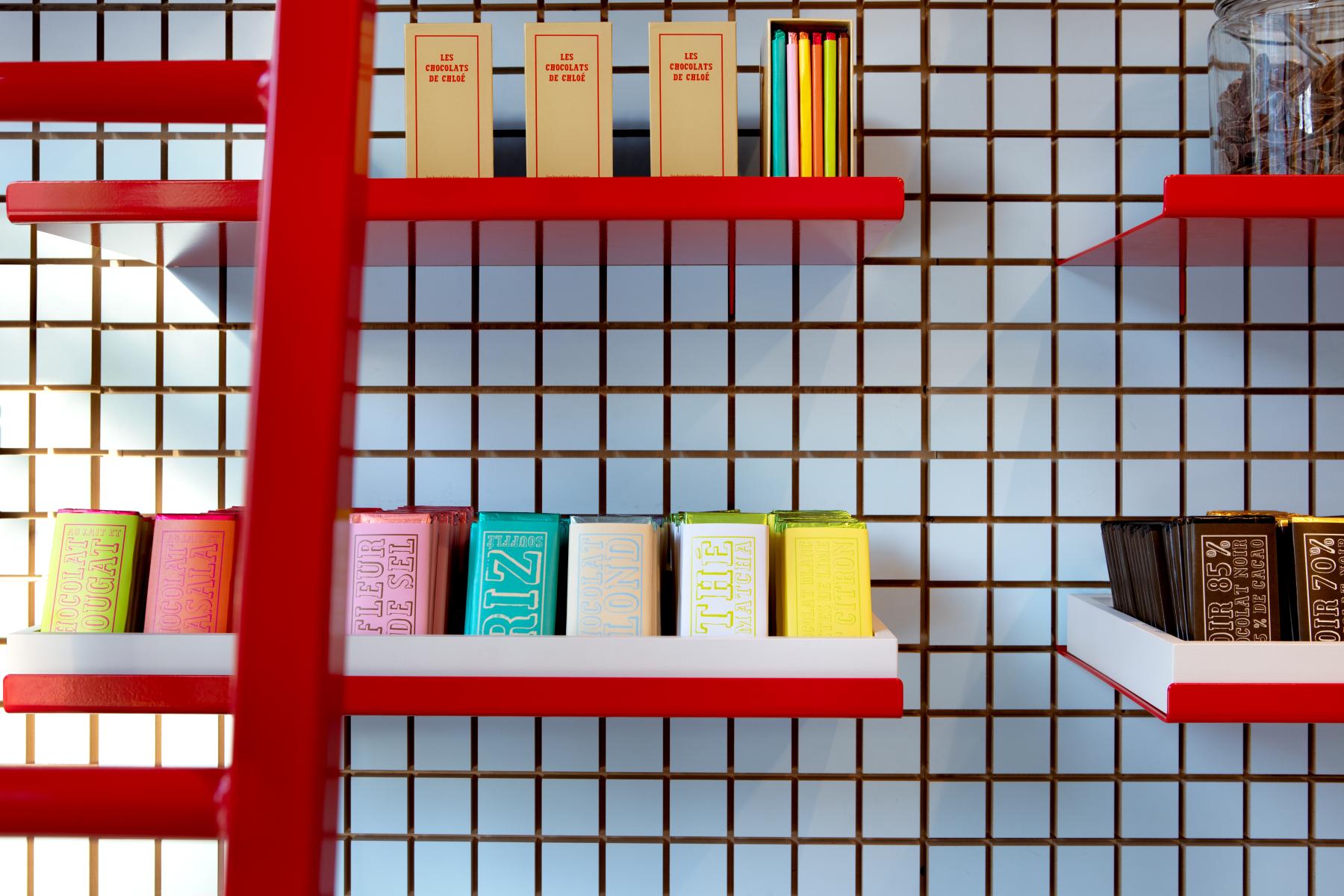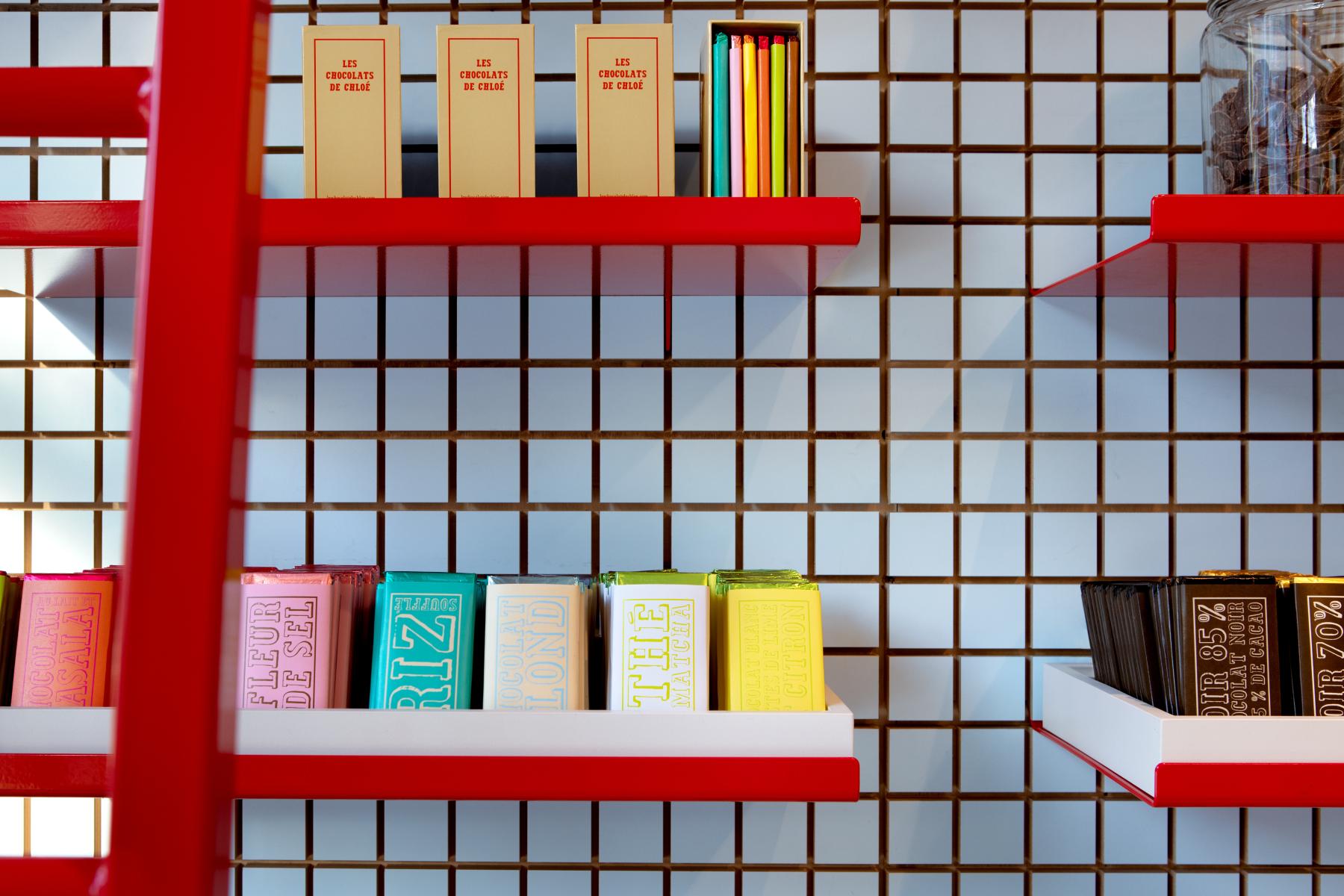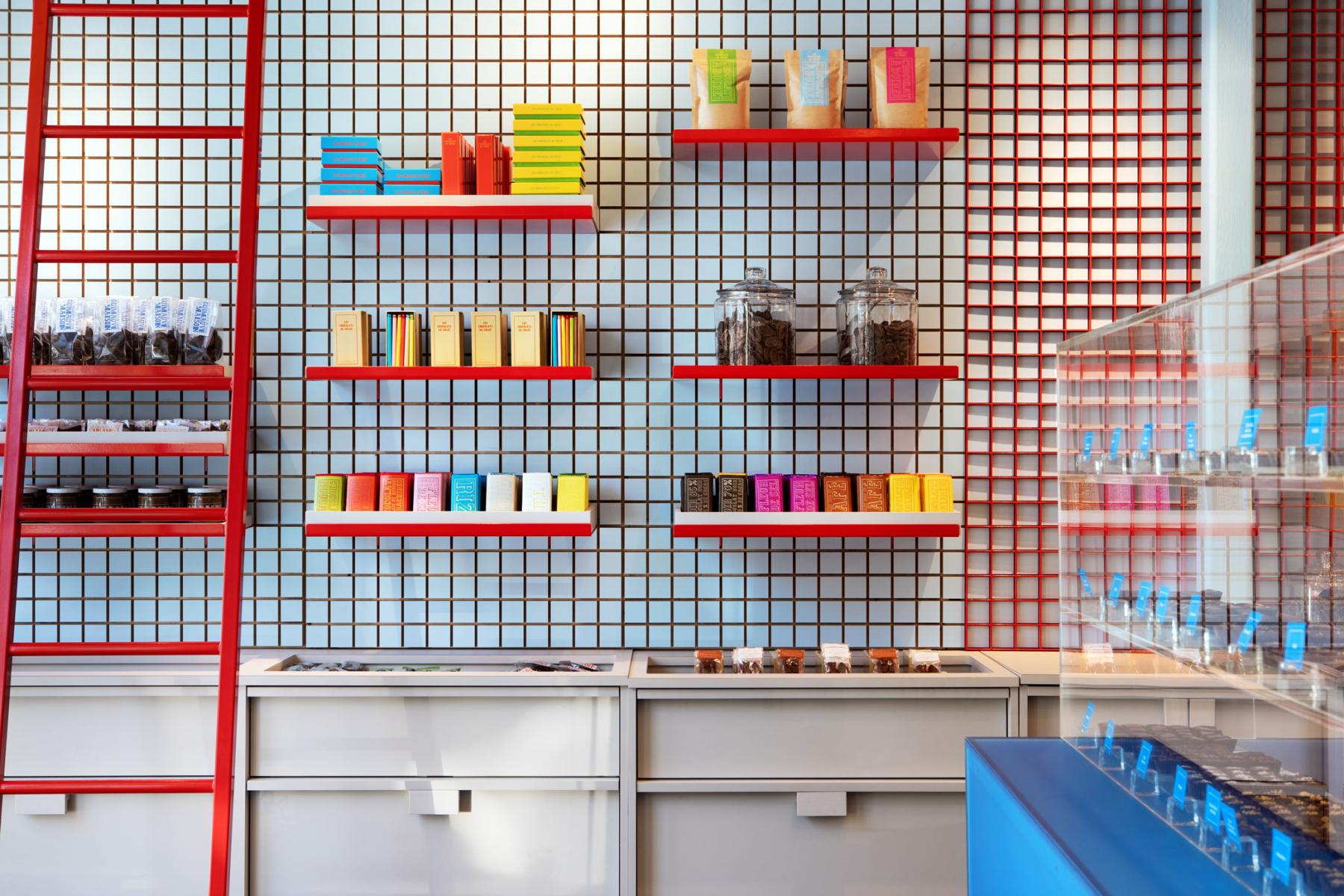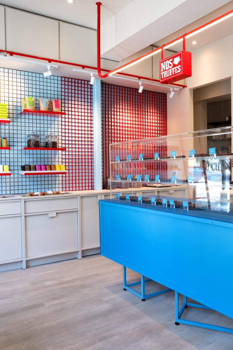 Les jeux de couleurs contrastées – entre l’extérieur sobre du comptoir en métal brossé et des caissons neutres, et les touches éclatantes à l’intérieur – évoquent le soin porté à l’enrobage du chocolat, renforçant la dimension sensorielle du lieu. Le motif carré ainsi que les accents rouges créent une cohérence visuelle discrète, affirmant ainsi une identité plus ludique et chaleureuse tandis qu’une structure tubulaire suspendue intègre éclairage et signalétique.