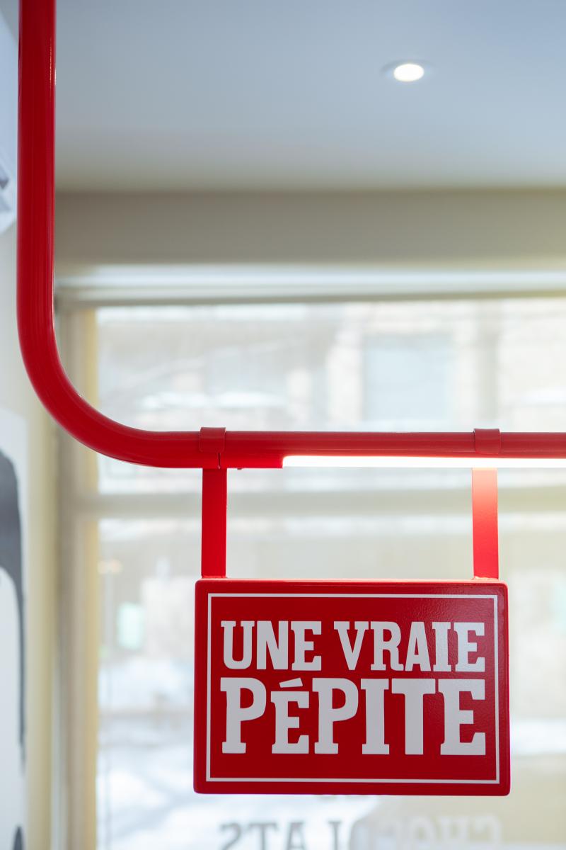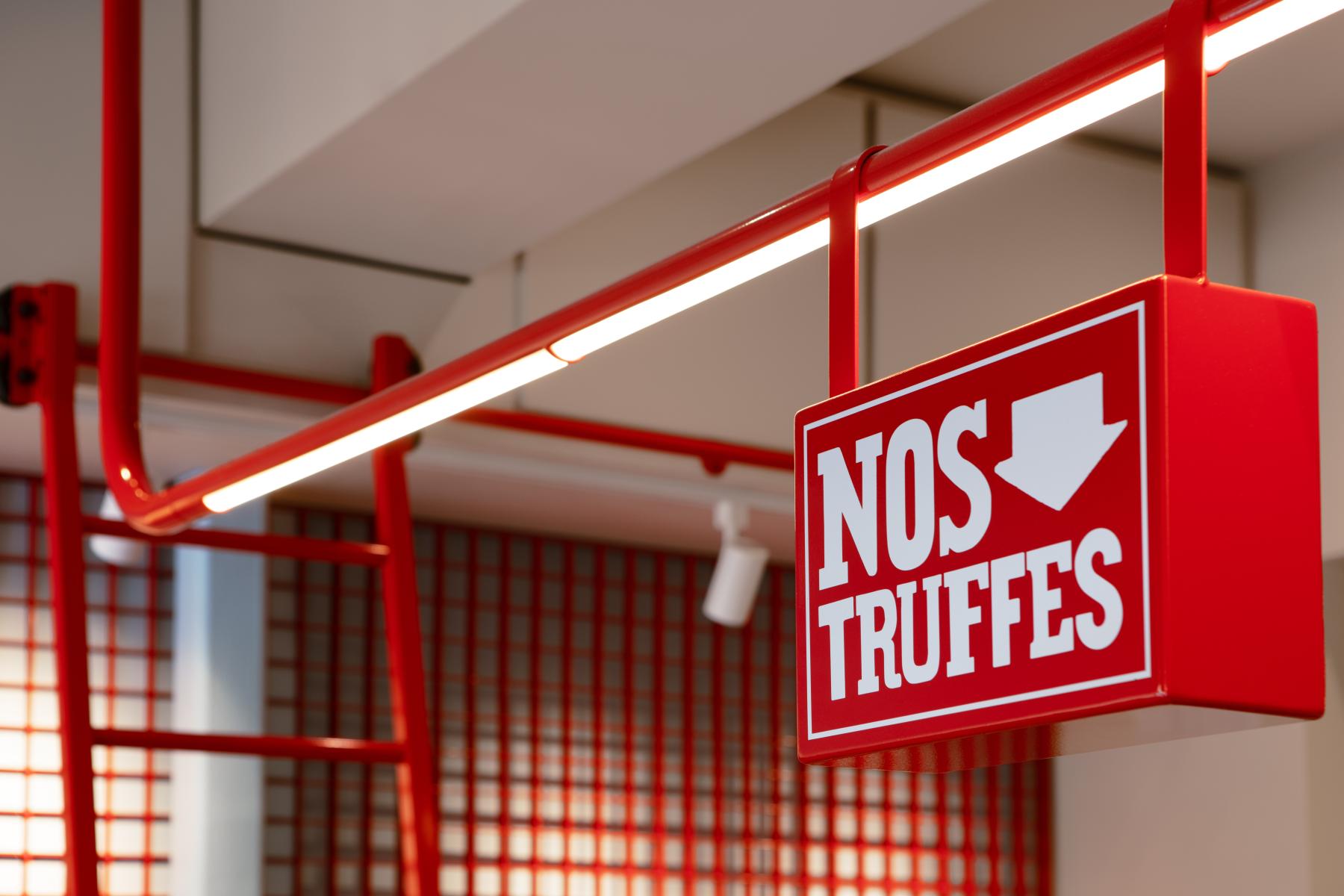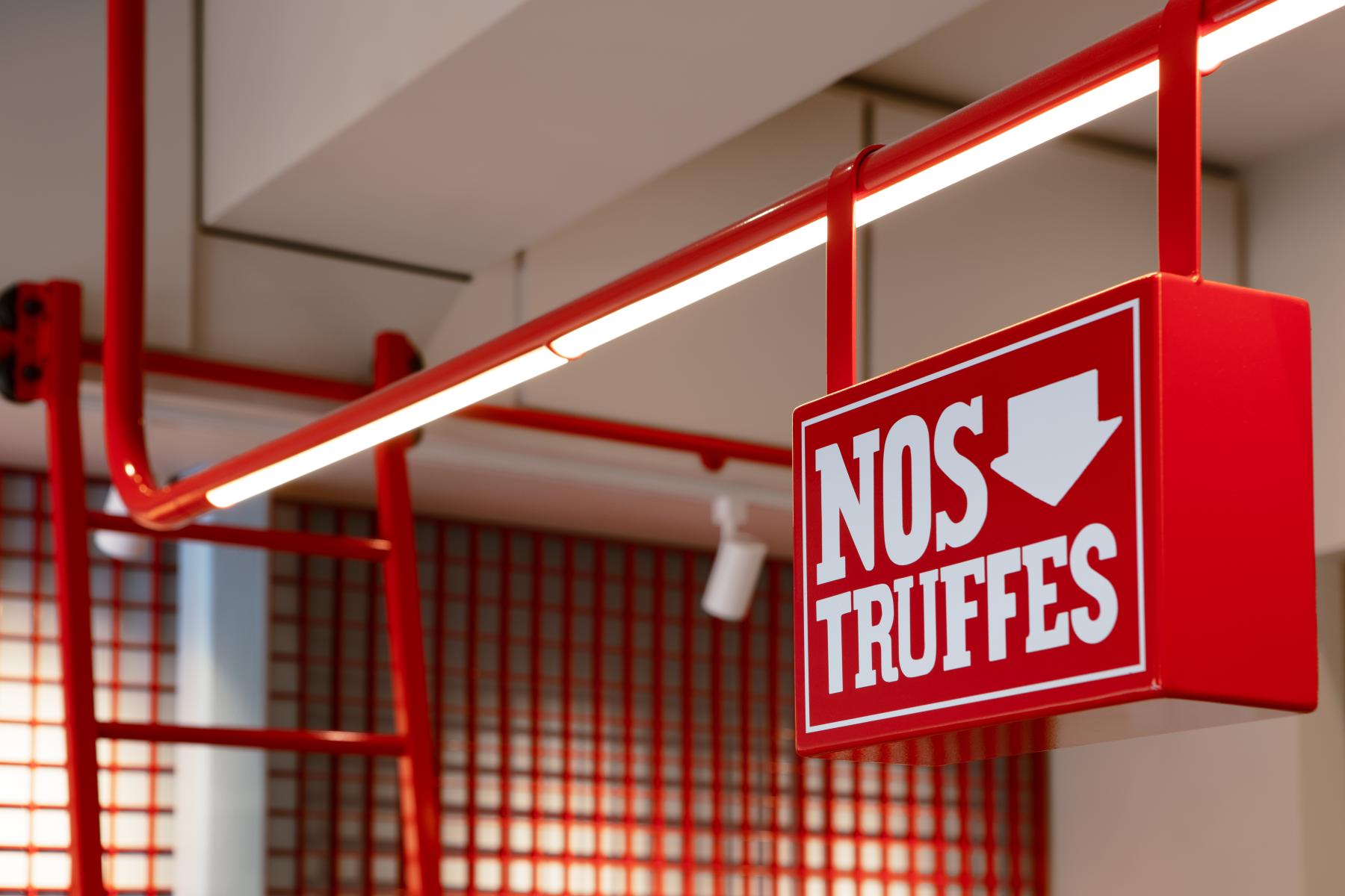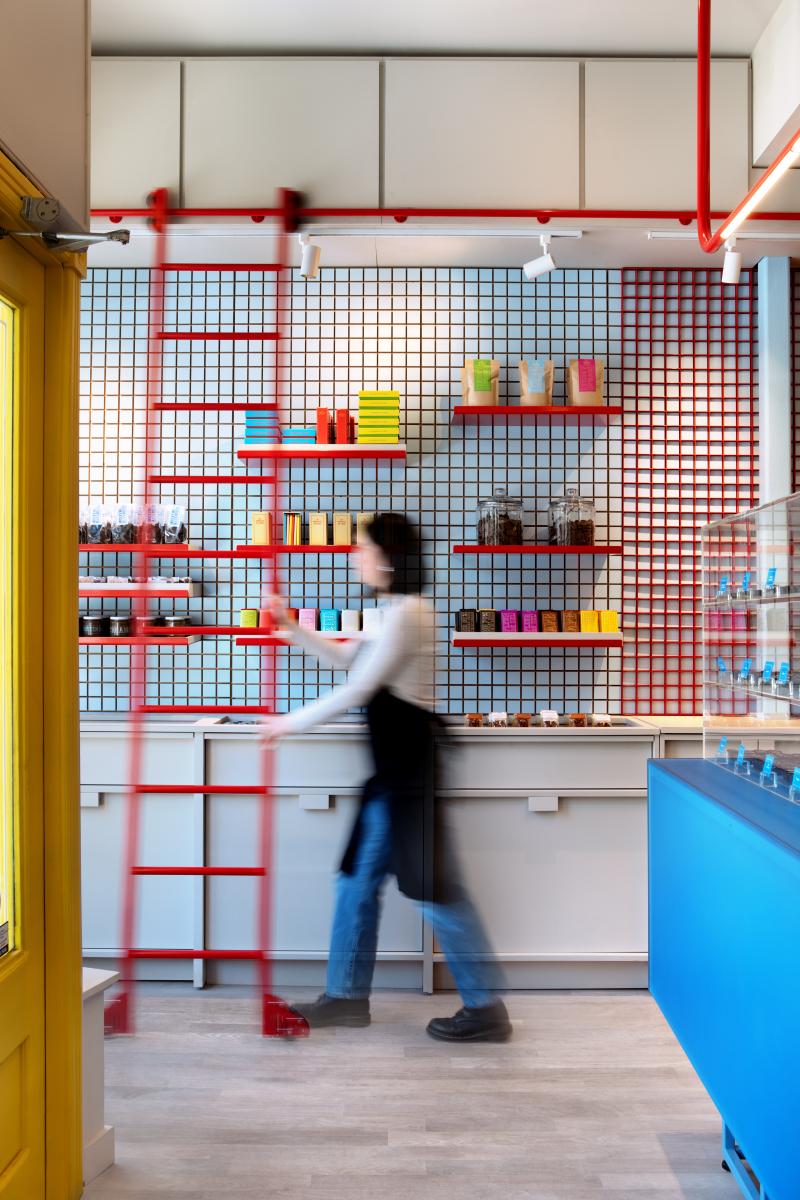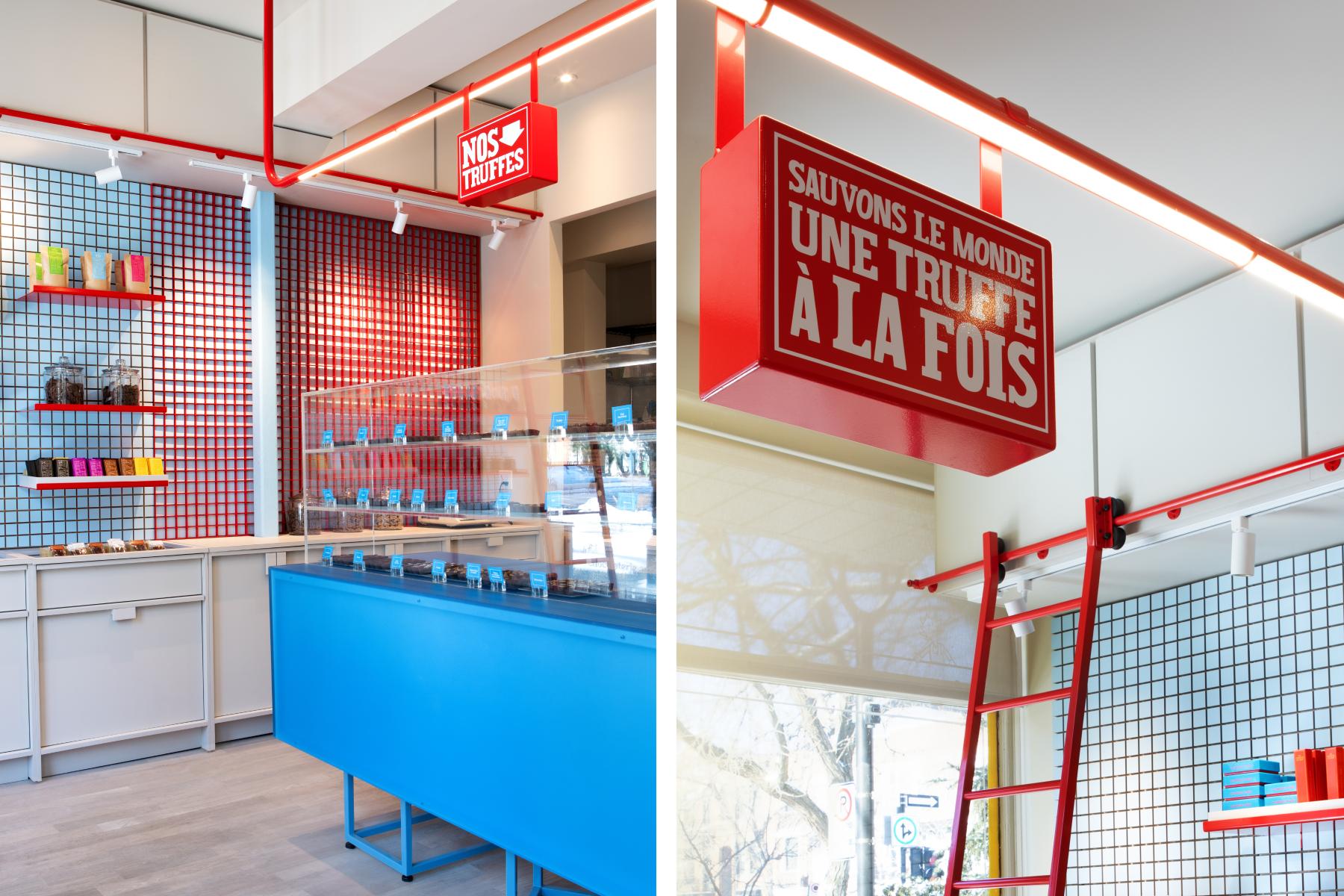 Les jeux de couleurs contrastées – entre l’extérieur sobre du comptoir en métal brossé et des caissons neutres, et les touches éclatantes à l’intérieur – évoquent le soin porté à l’enrobage du chocolat, renforçant la dimension sensorielle du lieu. Le motif carré ainsi que les accents rouges créent une cohérence visuelle discrète, affirmant ainsi une identité plus ludique et chaleureuse tandis qu’une structure tubulaire suspendue intègre éclairage et signalétique.