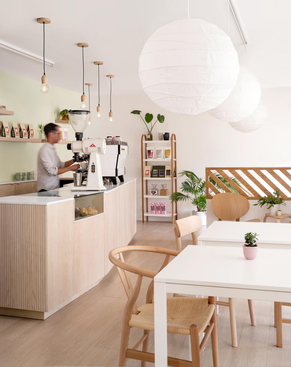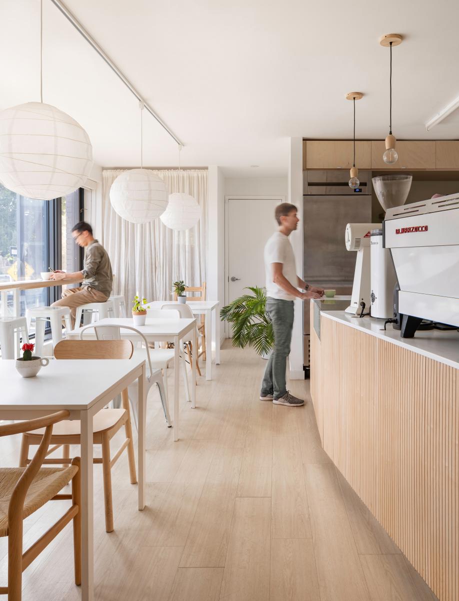 Construit avec un budget très serré, le design utilise des matériaux à la fois pratiques et riches en caractère. Un revêtement de sol en vinyle ingénieusement durable assure une maintenance facile, tandis que le mobilier en contreplaqué de qualité finition en érable ajoute de la chaleur, donnant à l'espace un caractère riche mais sans prétention. Des éléments comme la cloison en bois à lattes à l'entrée définissent subtilement des zones distinctes tout en maintenant la sensation d'espace ouvert et aéré. Un mur vert doux et des finitions en bois clair créent une atmosphère stimulante, complétée par des étagères flottantes remplies de produits de café sélectionnés et de verdure qui ajoutent à la fois fonctionnalité et attrait visuel.
