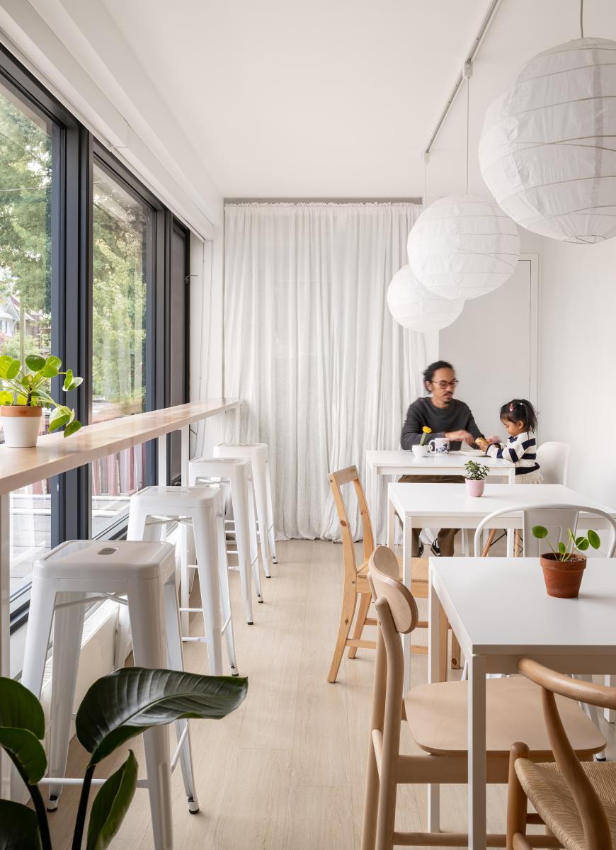 La disposition de l'espace est organisée en une série de zones linéaires, chacune servant une fonction distincte. À une extrémité, la zone de préparation du café et de la nourriture derrière le comptoir de service est conçue pour un flux de travail optimal. Sur le côté opposé, la zone de circulation des clients est connectée à une petite zone de sièges, qui se transforme en un long comptoir positionné directement devant une grande fenêtre orientée à l'est, offrant un endroit lumineux et accueillant pour observer les passants. Cette disposition maximise l'emprise compacte, assurant un flux fluide des clients, tandis qu'une petite cuisine située à l'arrière permet aux propriétaires de préparer des produits de boulangerie et des sandwichs fraîchement préparés.