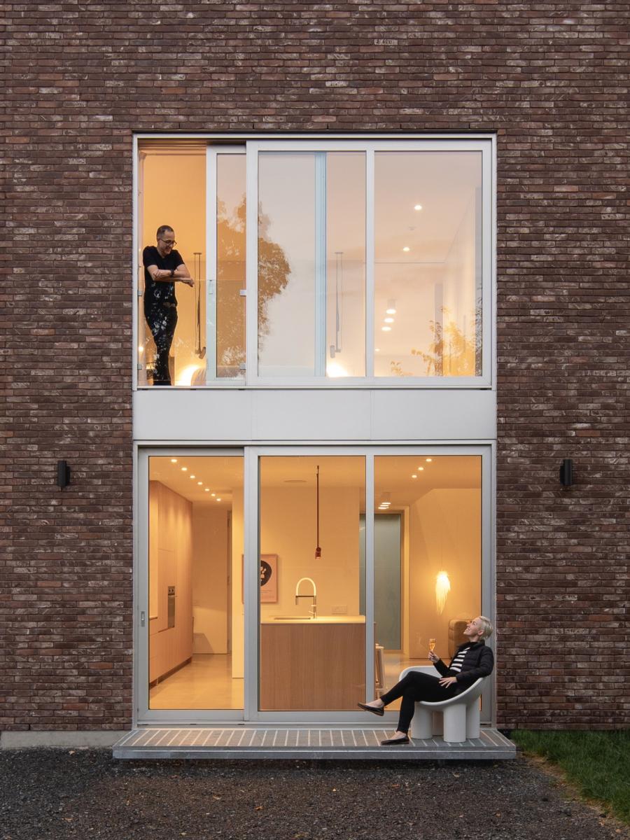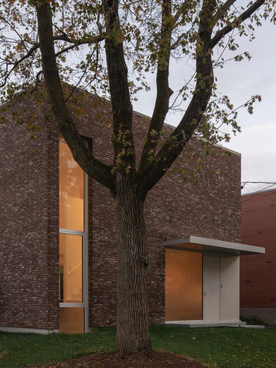 La volumétrie de cette « maison carrée » est d’une extrême simplicité, sobre et compacte, cubique et sans relief, respectant l’échelle du voisinage. Son originalité relève de ses quatre façades revêtues de brique artisanale, dont la texture, les contours irréguliers et la teinte marron évoquent l’écorce des arbres et confèrent au projet une expression monolithique, à la fois austère, séduisante et authentique. L’utilisation de ce matériau pérenne, qui fait écho aux parements des bungalows avoisinants, se veut un geste qui a valeur d’exemple dans le paysage montréalais, relevant ainsi un défi d’intégration urbaine dans cet environnement bâti d’intérêt patrimonial.