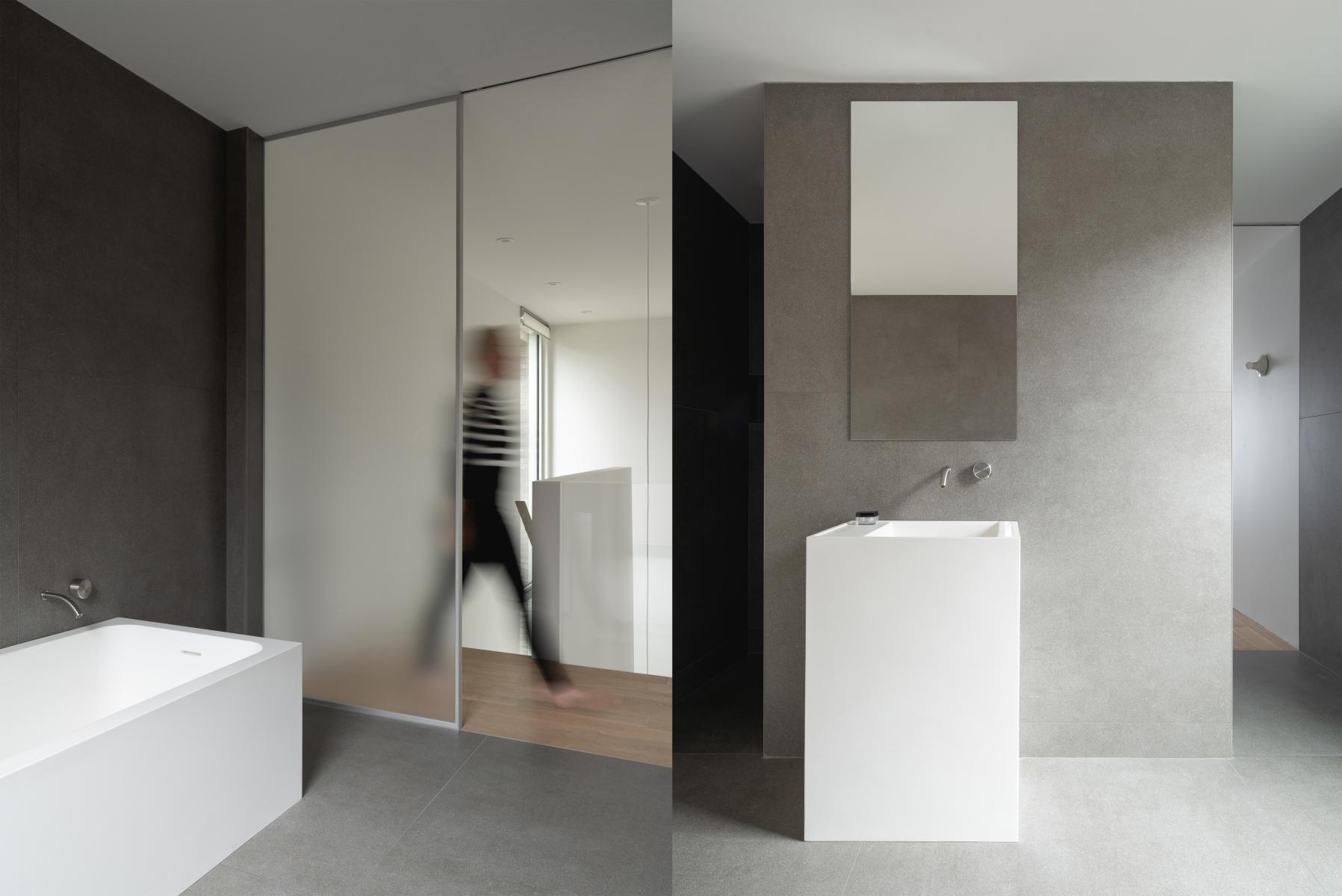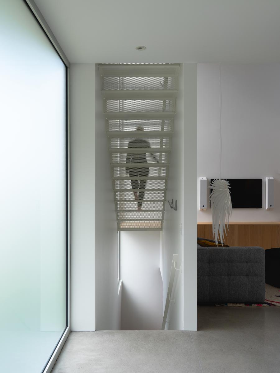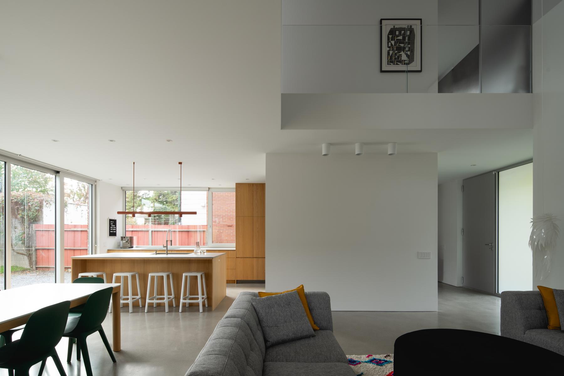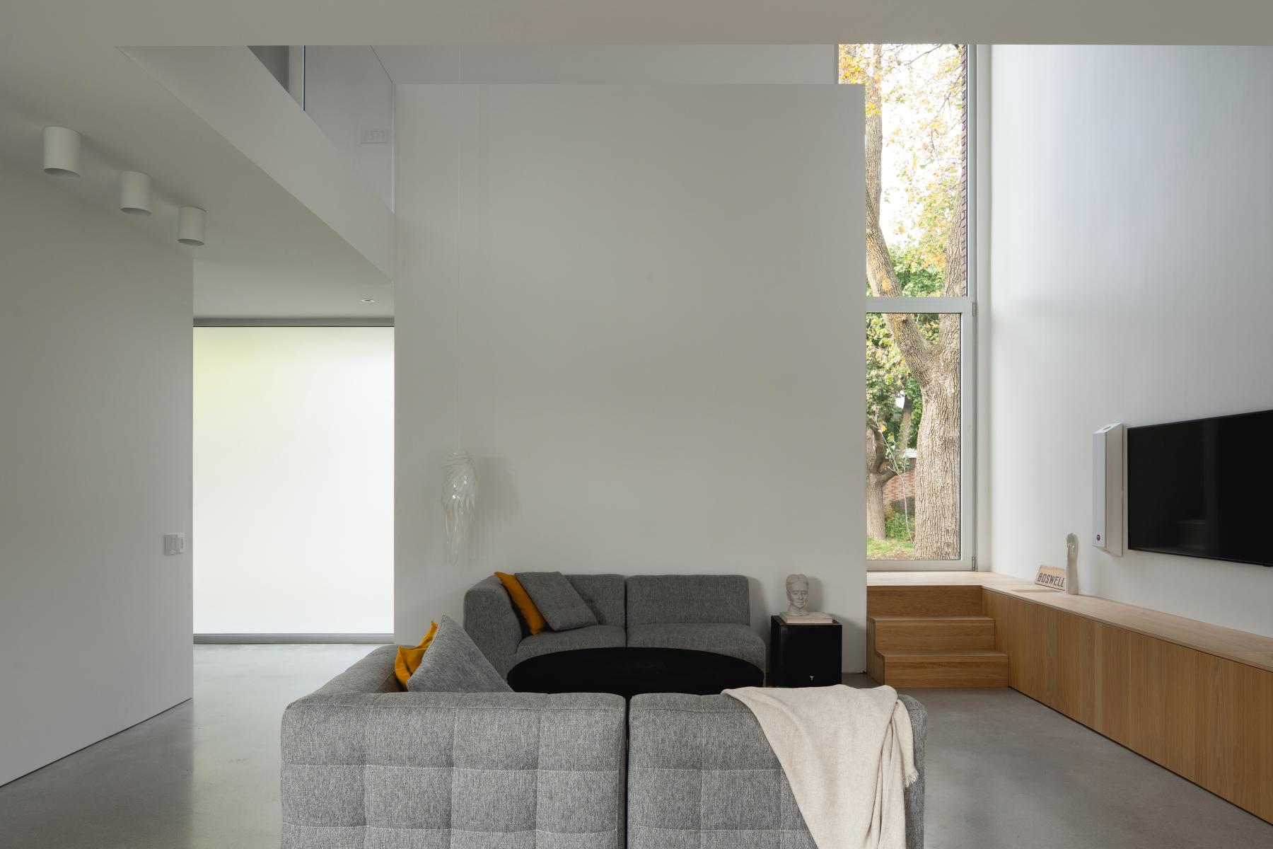 La volumétrie s’éclate davantage à l’intérieur et exploite la verticalité. Derrière la façade à l’apparente simplicité, se cache, au cœur de la maison, un espace à double hauteur reliant visuellement les différents niveaux. Ses fenêtres surdimensionnées cadrent le paysage et rythment la lumière au fil des saisons, créant une relation forte entre intérieur et extérieur. Ces gestes architecturaux sobres ont un grand impact sur la qualité de l’espace intérieur et ont permis de relever le défi de réaliser un projet qui se démarque malgré une enveloppe budgétaire mesurée.