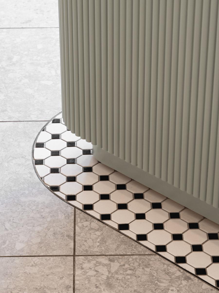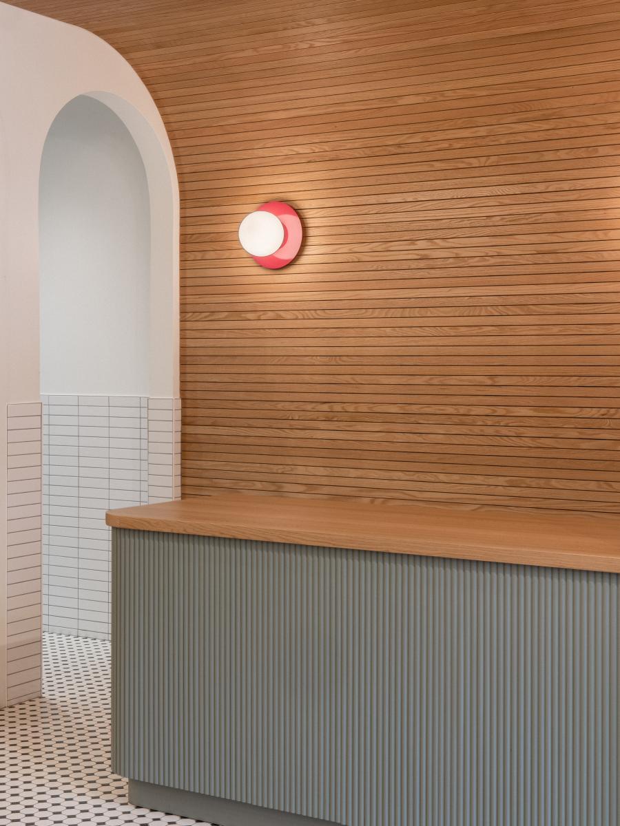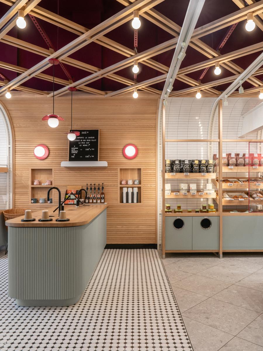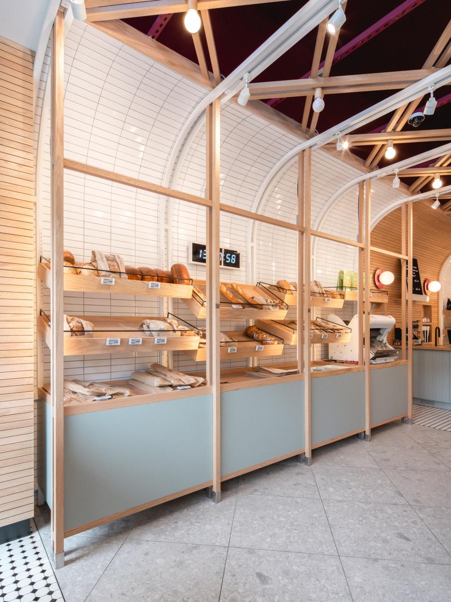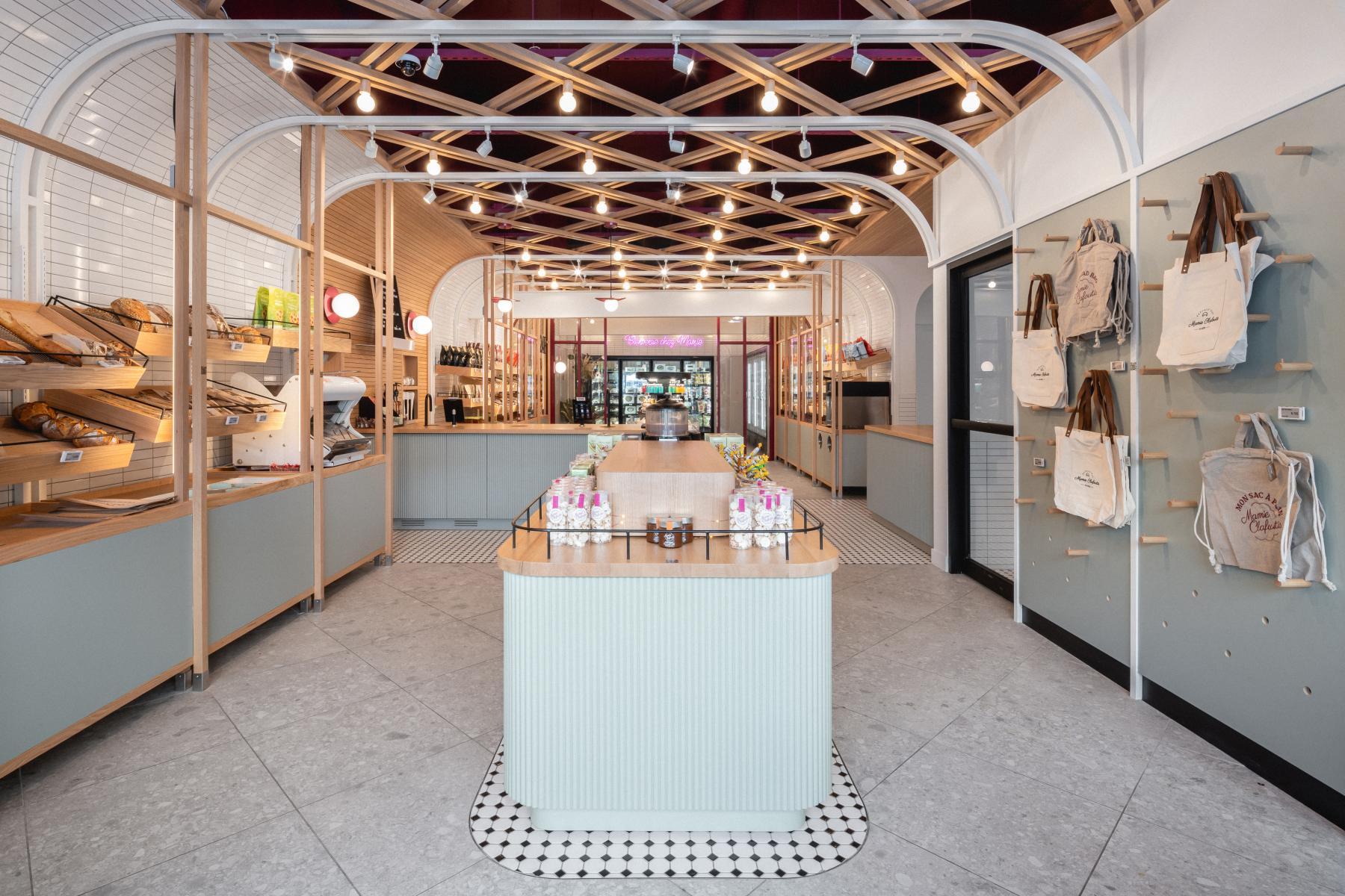 Cette nouvelle identité visuelle équilibre les valeurs traditionnelles de la boulangerie avec une approche innovante. Des références symboliques enrichissent l’aménagement : murs courbes carrelés évoquant le métro de Paris, bois blond rappelant le savoir-faire du pain, mosaïque noire et blanche inspirée des bistrots et anciennes boulangeries, et bourgogne comme clin d’œil à l’univers sucré de Mamie. Utilisées avec parcimonie, ces teintes créent un environnement chaleureux, harmonieux et accueillant.
