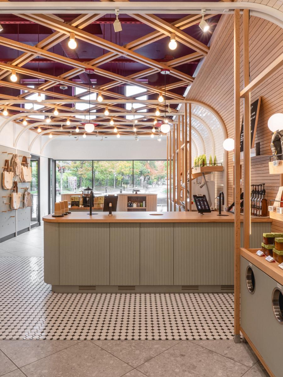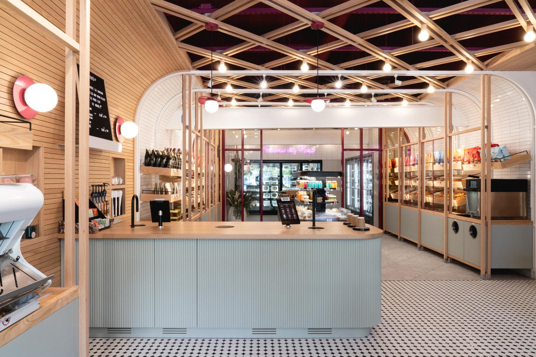 Dès l’extérieur, la vitrine ouverte crée une percée visuelle vers l’intérieur. Des arches architecturales accentuent cette profondeur et invitent naturellement les passants à entrer. Un double sas gère l’entrée et la sortie en lien avec l’application, facilitant le contrôle des flux.