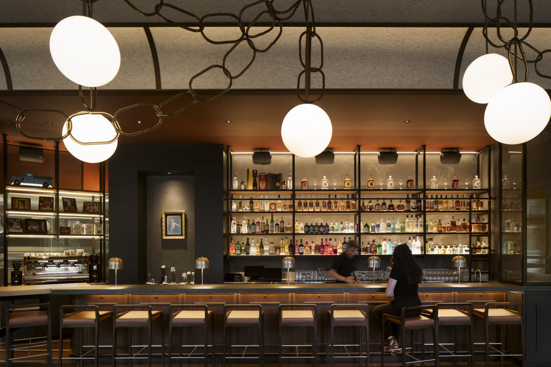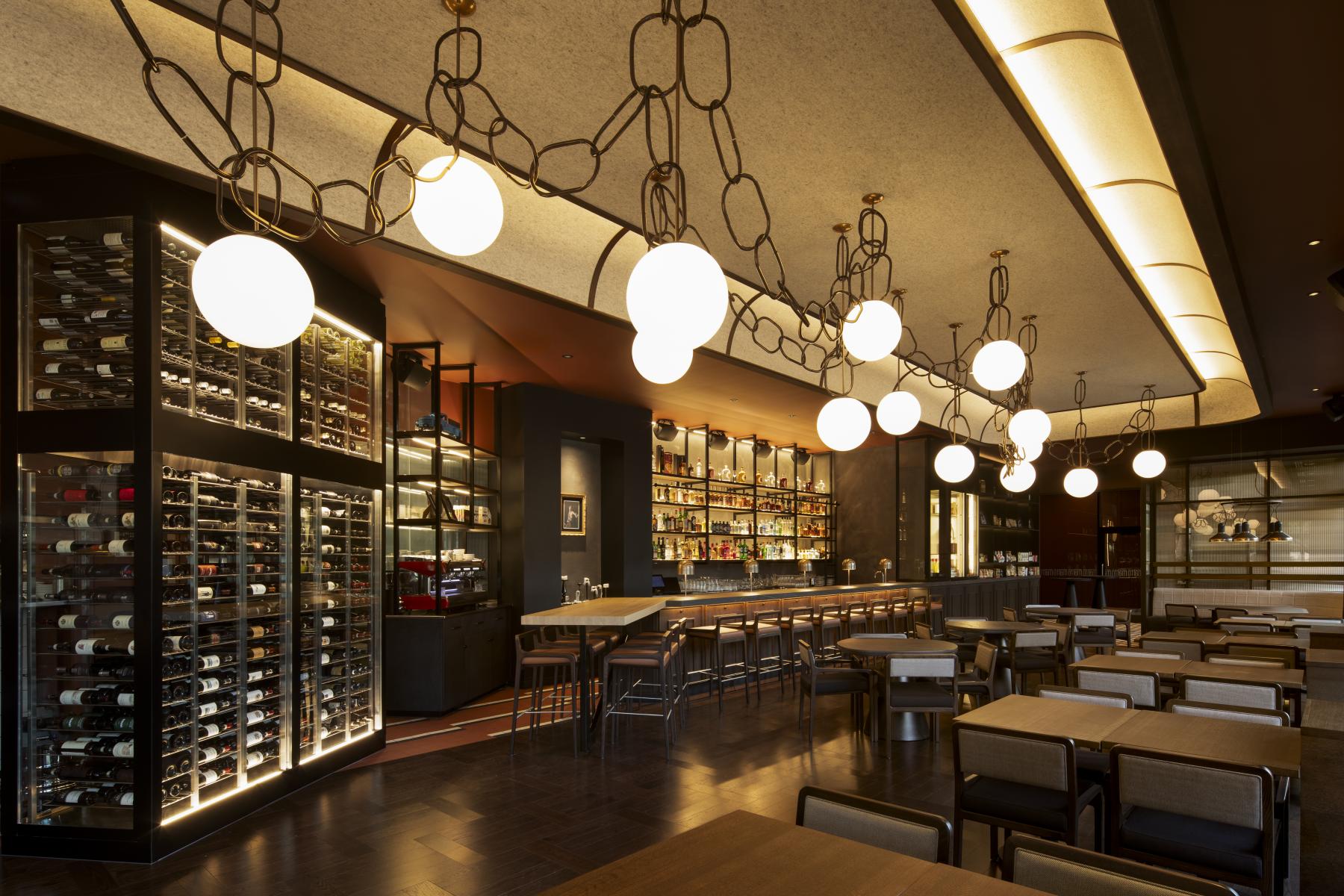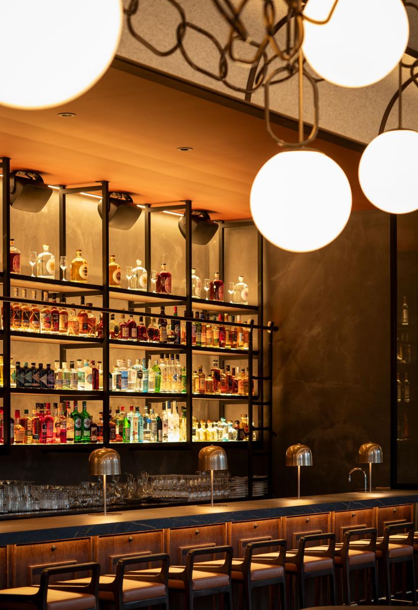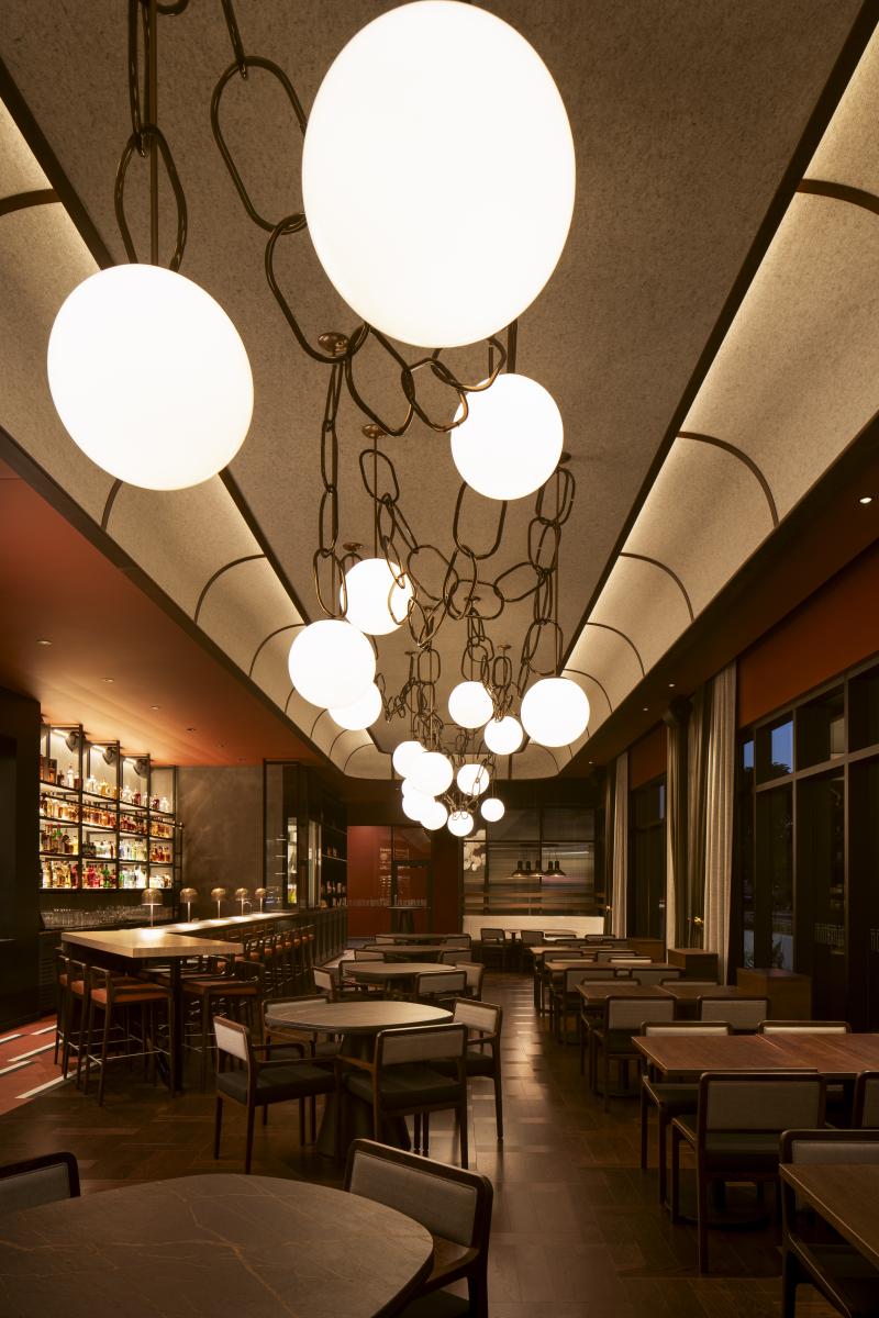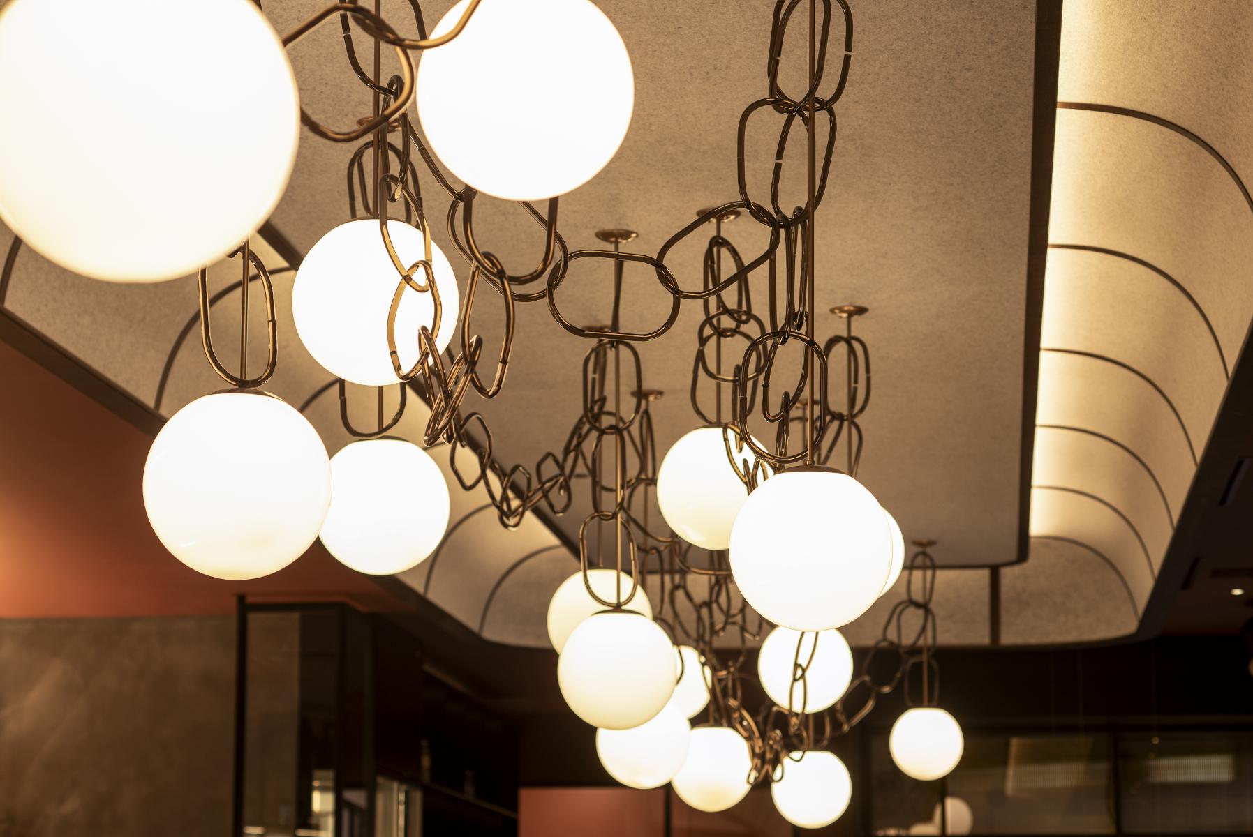 Pièce maitresse du restaurant, un plafonnier majestueux chapeaute tout l’espace et crée un impact visuel fort depuis la rue. Dessiné par LemayMichaud, ce luminaire suspendu, composé de plus de 200 anneaux et 25 sphères lumineuses, semble flotter au-dessus de l’espace ouvert. Tel un chef-d’œuvre d’orfèvrerie, il est encadré par un plafond en feutre et en bois aux formes courbes, évoquant les plafonds à caissons des bâtiments anciens.