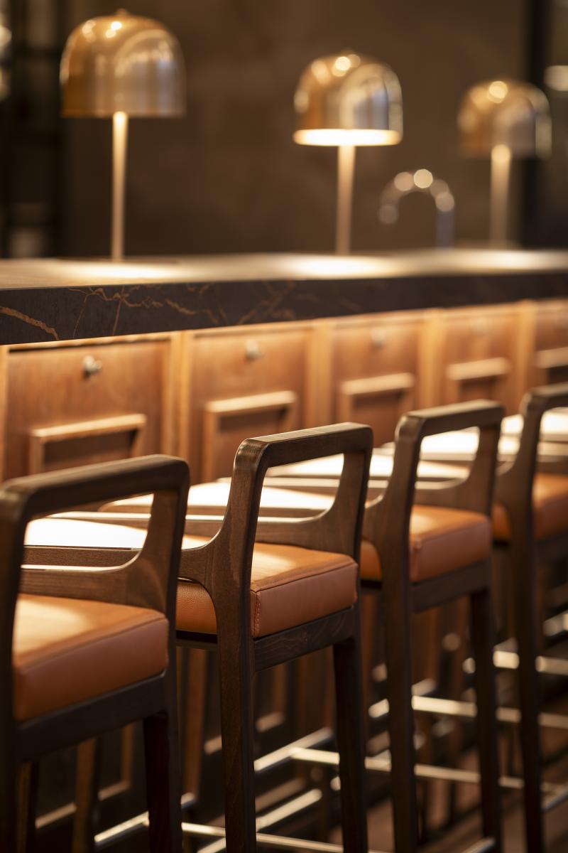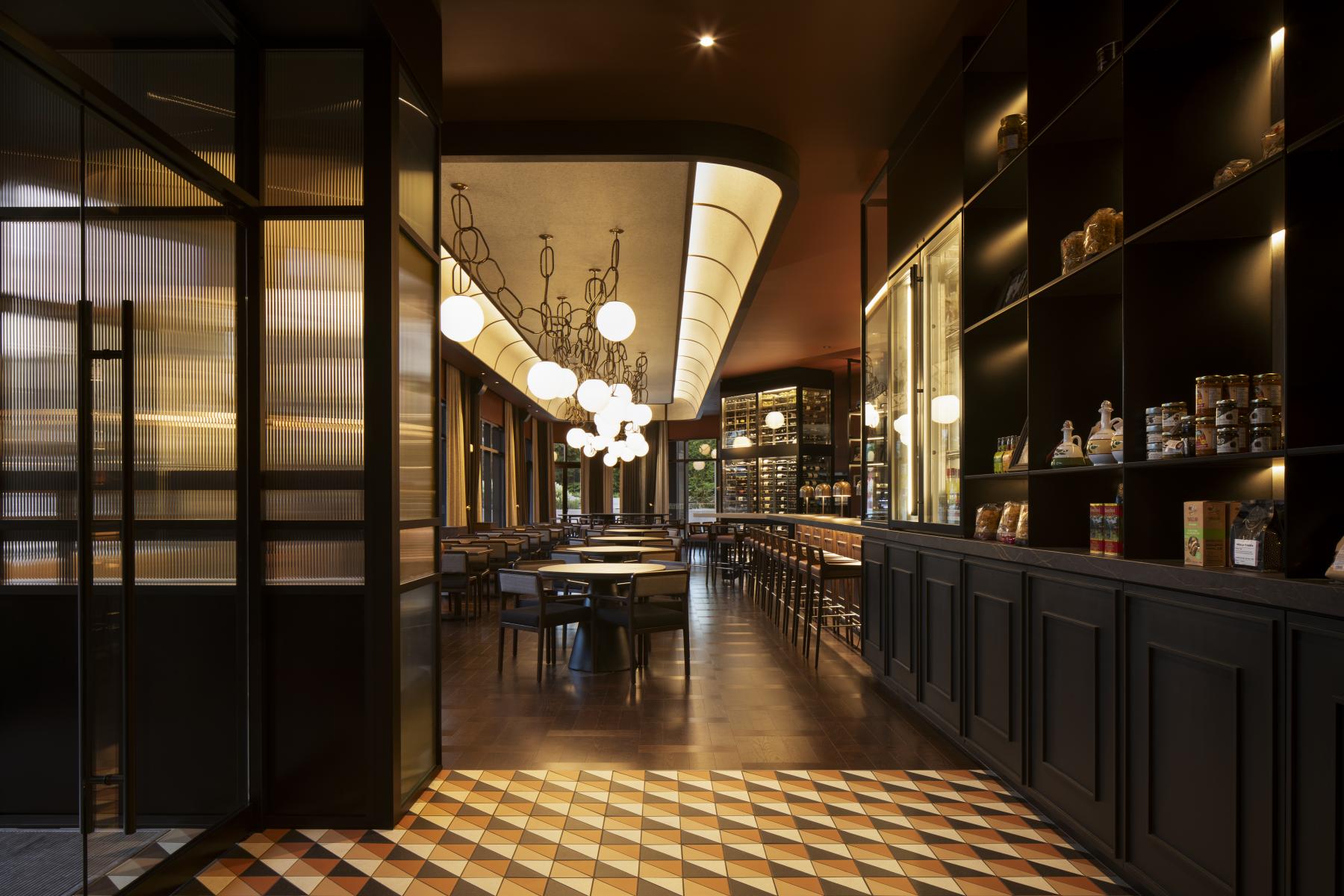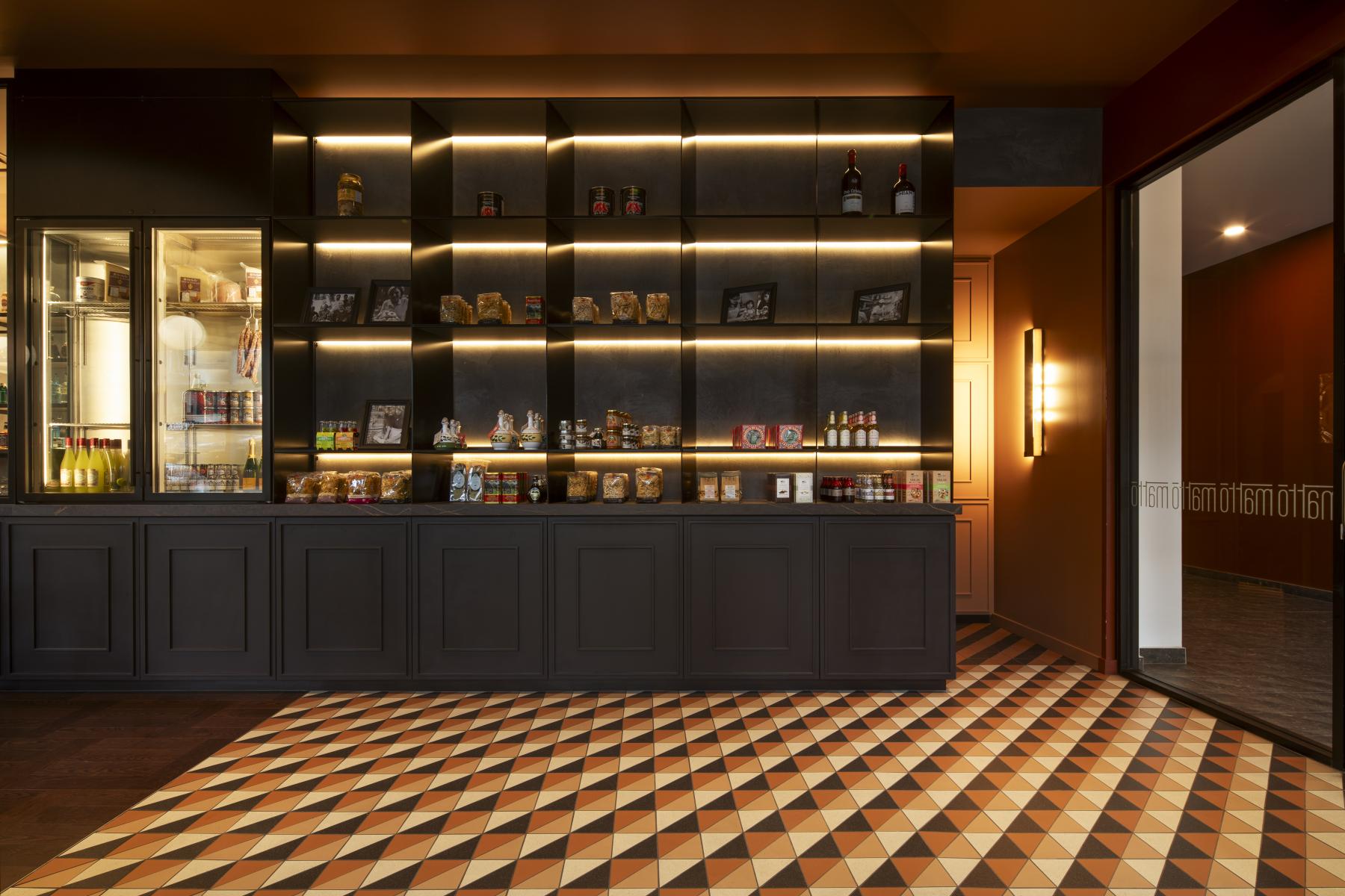 Le bois, le marbre, le béton, les tissus laineux, le cuir, les motifs de céramiques sont autant d’éléments qui contribuent à la création d’un espace pérenne et à échelle humaine. Ces matériaux intemporels, façonnés par le passage du temps, confèrent au restaurant la patine caractéristique des lieux chargés d’histoire, évoquant l’authenticité de l’Italie. La luminosité, douce et ambrée, met en valeur les textures et détails de l’intérieur, offrant aux visiteurs une expérience profondément enracinée dans la convivialité et l’authenticité italiennes.