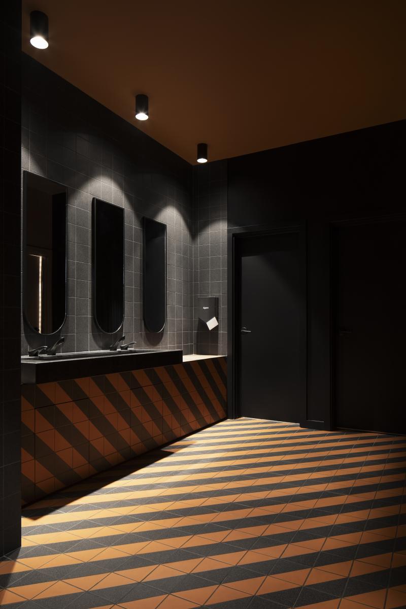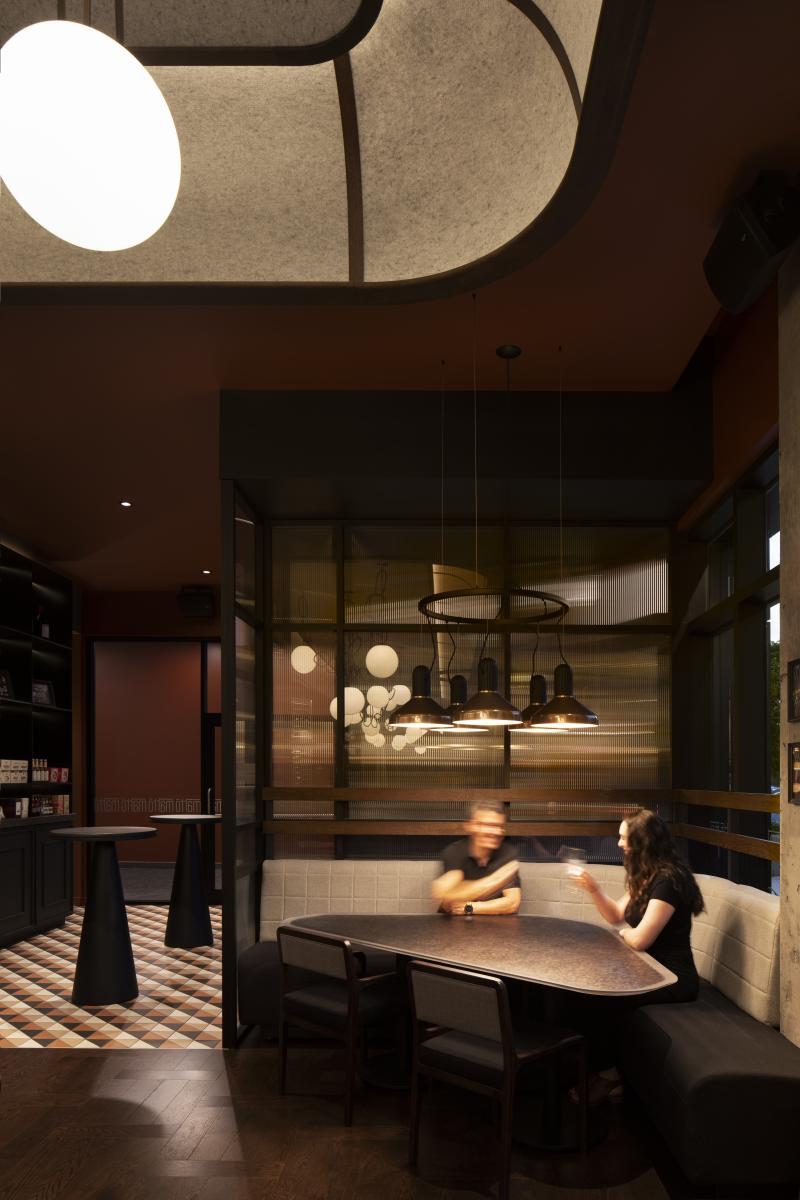 Dès l’entrée, une table triangulaire attire le regard avec son plateau translucide aux éclats de cuivre. Les tables de formes variées ont été configurées pour placer la clientèle au cœur de l’action. Au fond du restaurant, une table pivotante permet de reconfigurer l’espace selon les besoins, offrant une flexibilité sans compromis sur l’esthétique. Les insertions de céramique, tant au sol que dans les salles de bains, jouent avec les contrastes et les motifs de façon surprenante. Un espace marché invite les clients à se procurer les produits pour recréer certains plats du Matto à la maison.