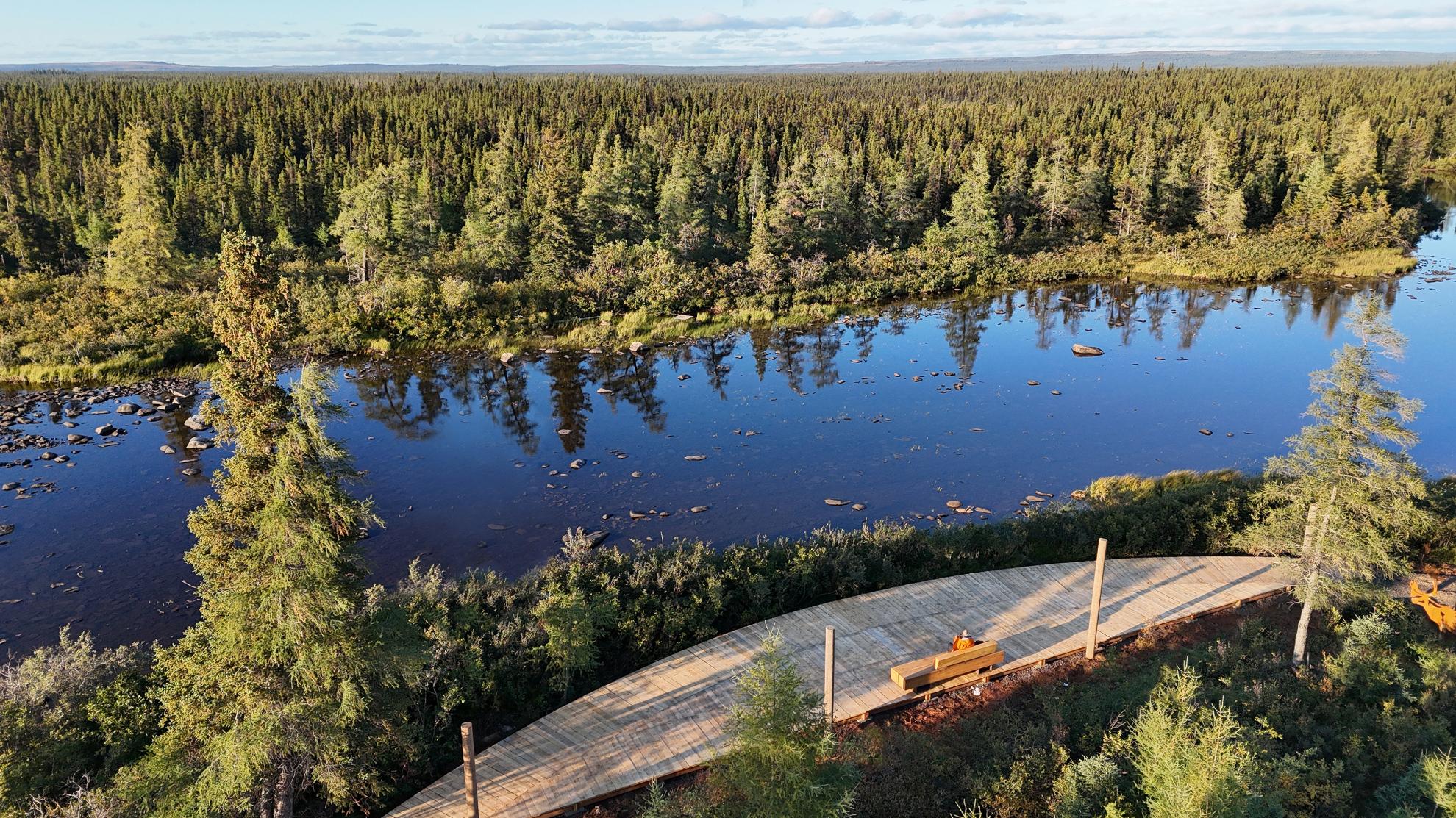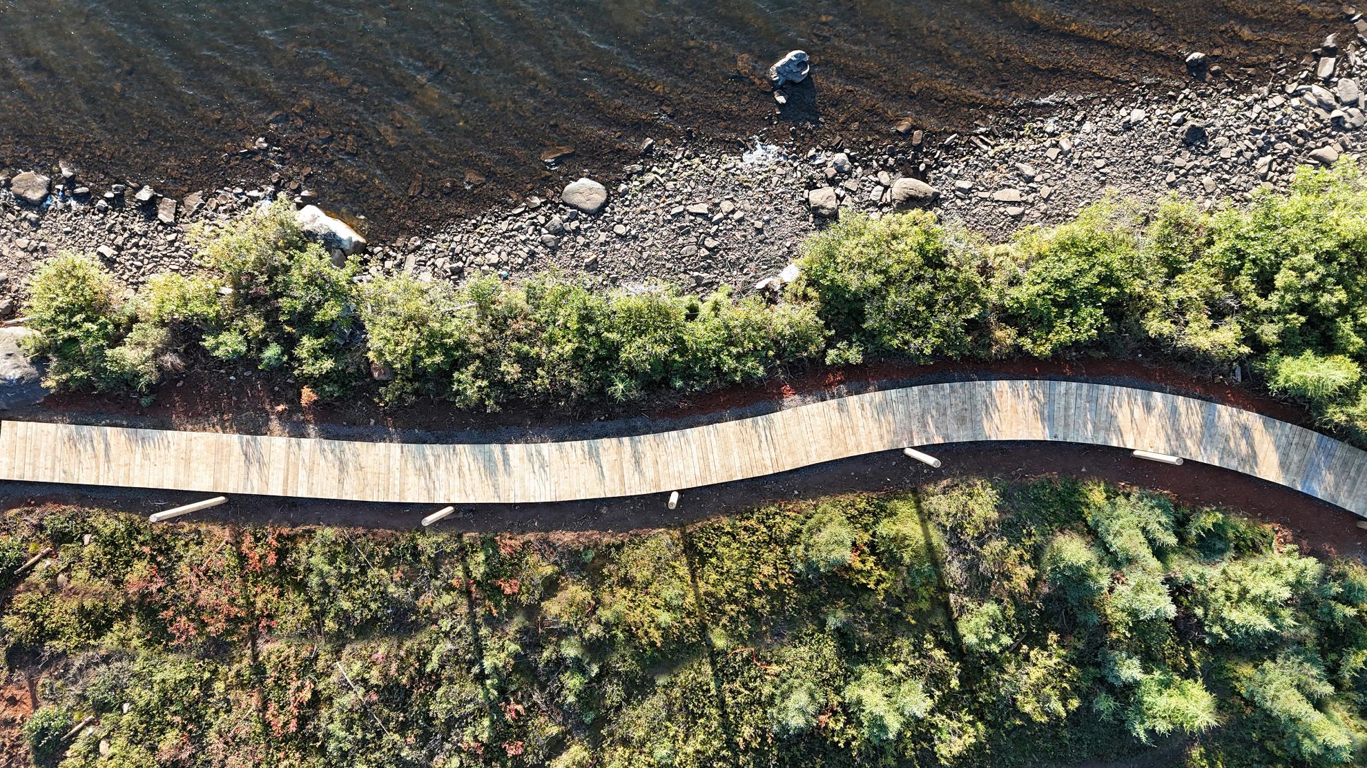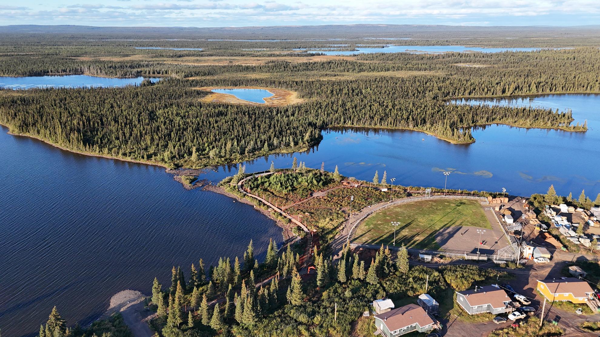 Située dans la ville subarctique de Kawawachikamach, QC (à 1150 km au nord de Montréal), la Naskapi Community Boardwalk est un projet en plusieurs phases offrant à une communauté de 1 050 personnes une promenade en bois accessible le long des rives du lac Matemace et du lac Peter. La première phase de 400 m (terminée en 2024) crée un sentier accessible le long des rives. Les phases 2 et 3 complèteront le parcours de 2 km, avec de futurs sentiers reliant le site culturel, à 5 km au sud.
