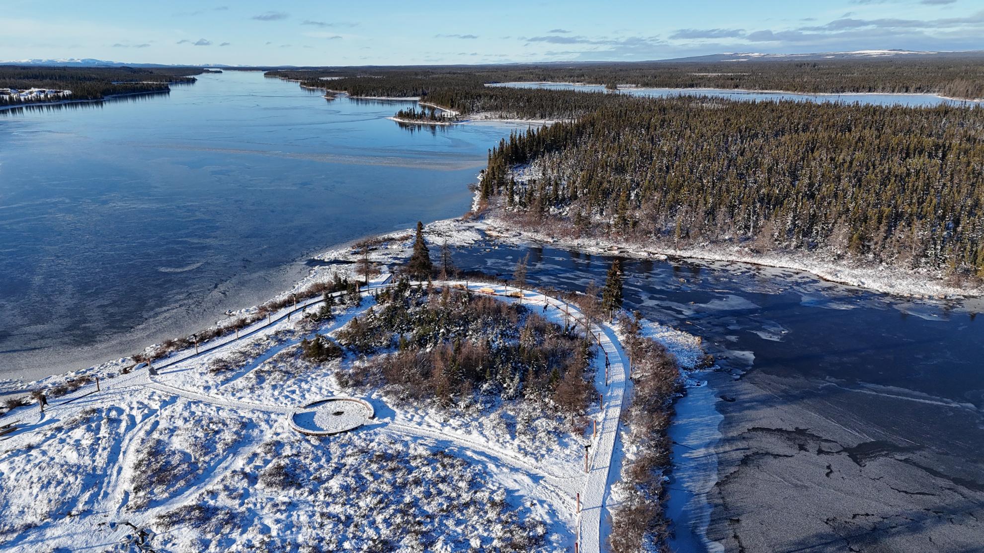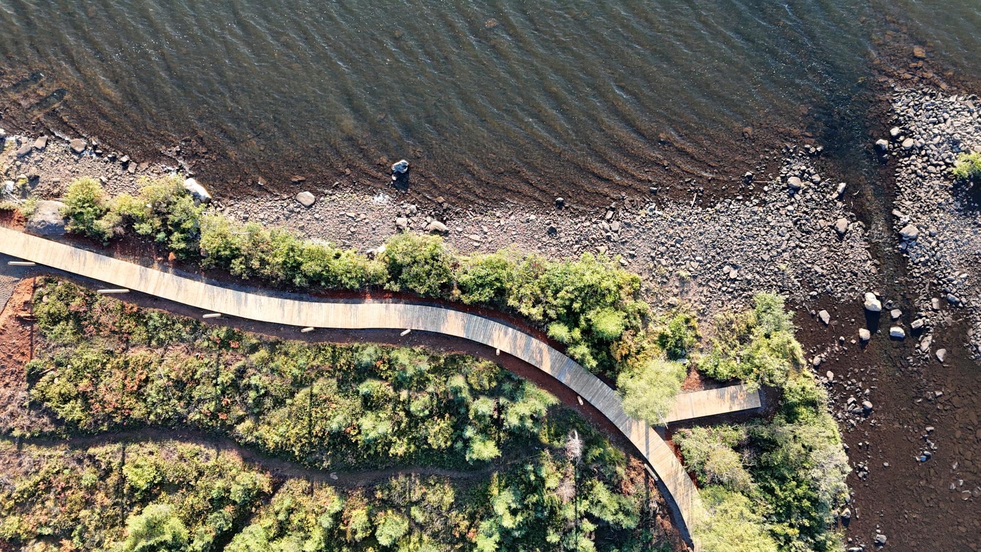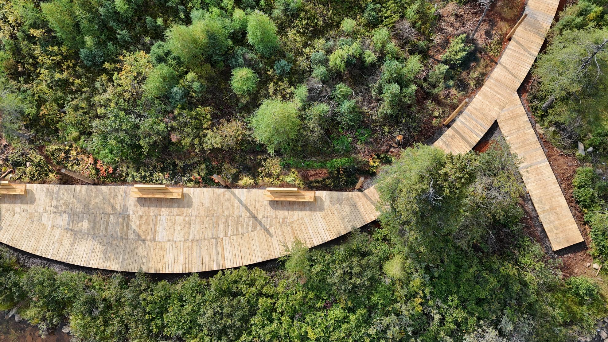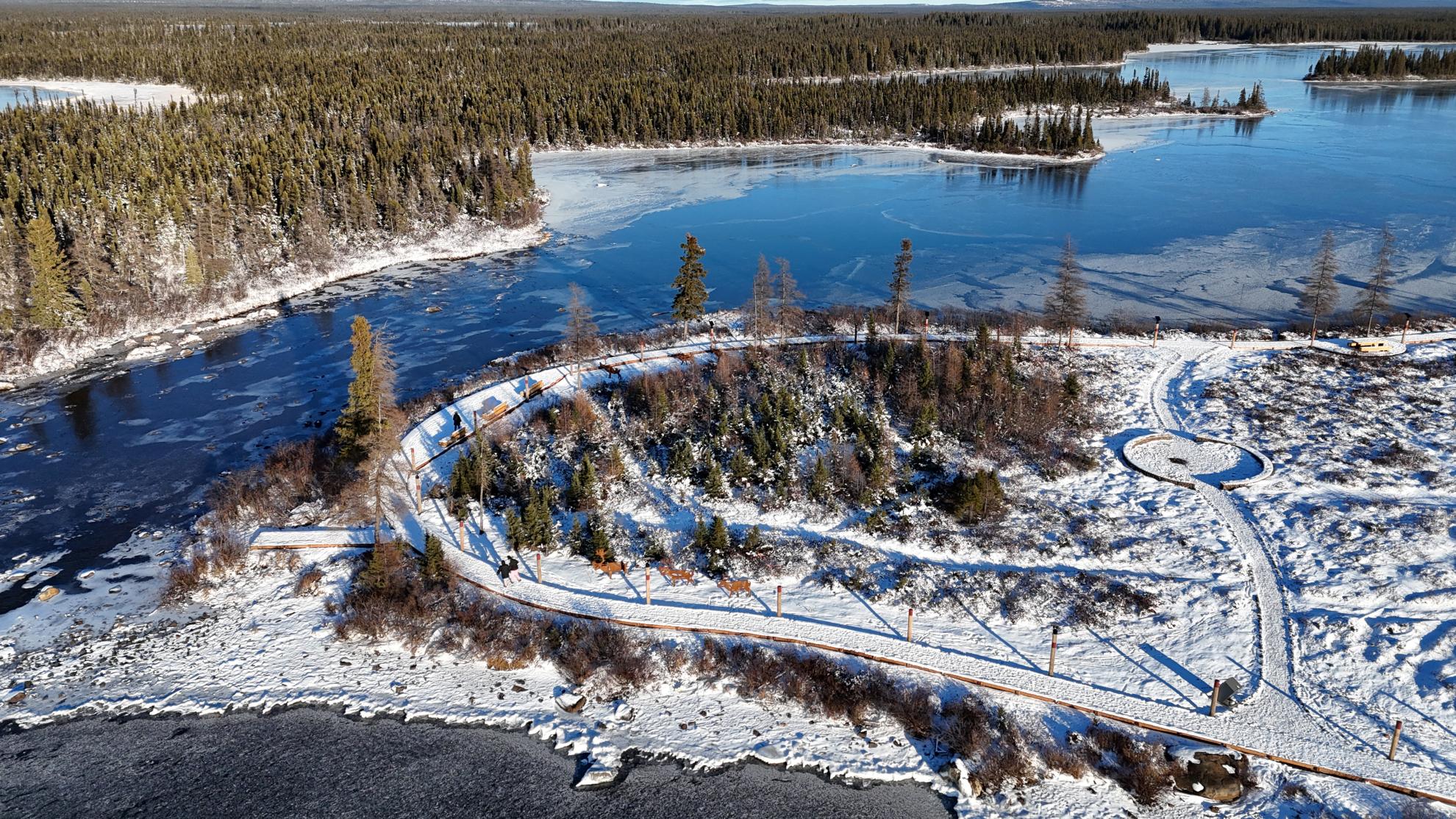 Située dans la ville subarctique de Kawawachikamach, QC (à 1150 km au nord de Montréal), la Naskapi Community Boardwalk est un projet en plusieurs phases offrant à une communauté de 1 050 personnes une promenade en bois accessible le long des rives du lac Matemace et du lac Peter. La première phase de 400 m (terminée en 2024) crée un sentier accessible le long des rives. Les phases 2 et 3 complèteront le parcours de 2 km, avec de futurs sentiers reliant le site culturel, à 5 km au sud.