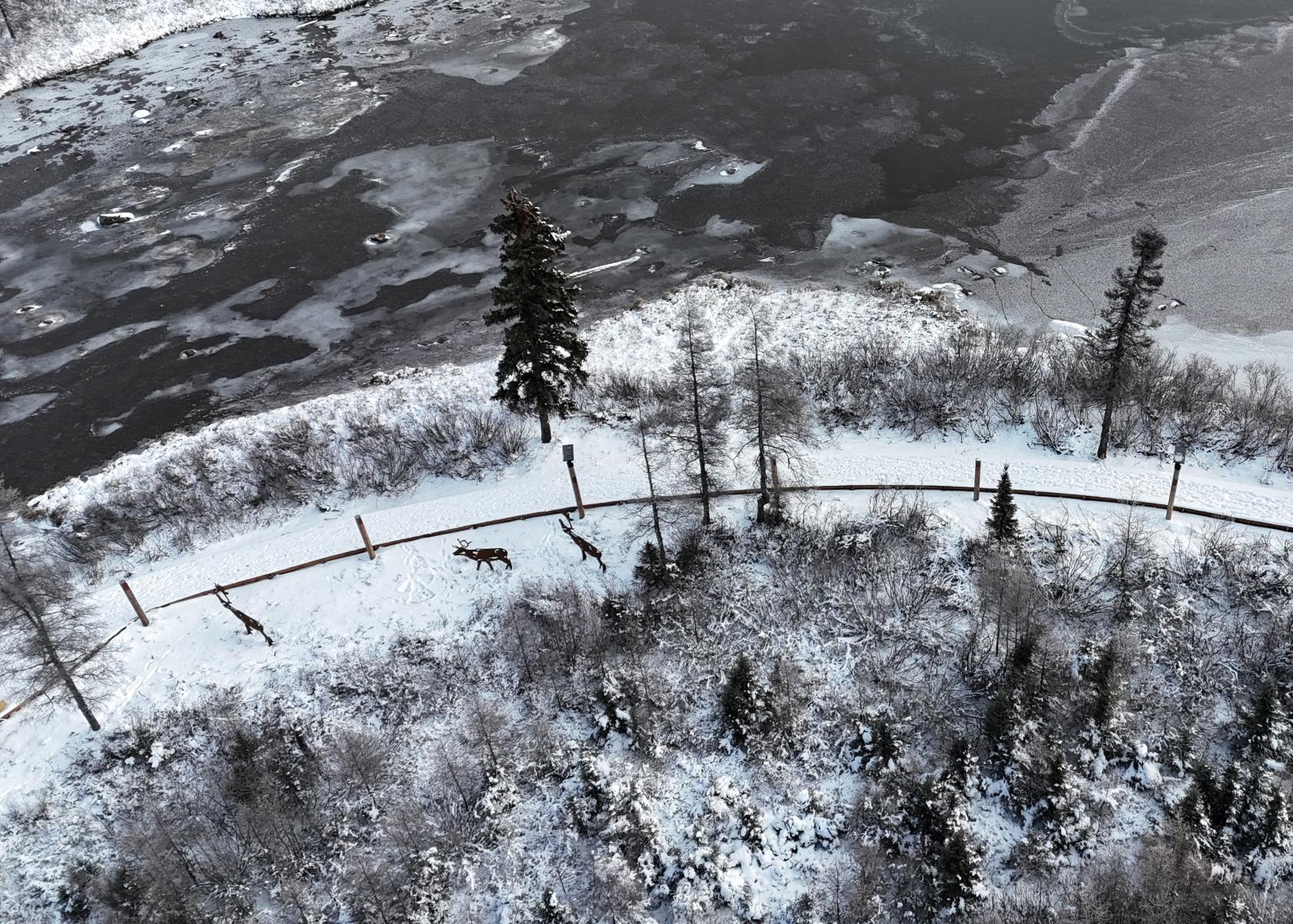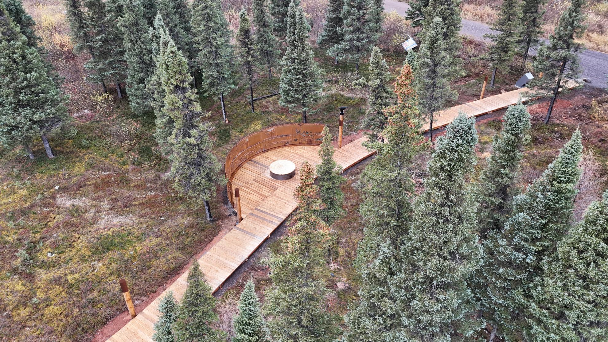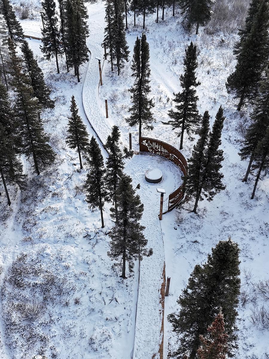 Sans connaître l'ampleur exacte du projet ni la complexité du travail dans le Nord, l'équipe de design s'est engagée à respecter les aspirations de la communauté et à honorer ses membres et son territoire. Cette attitude a guidé l'équipe dès le premier jour. La promenade a été réalisée grâce aux forces qui caractérisent notre pratique : lire le paysage et révéler ses joyaux cachés, brouiller les frontières entre le design et l'art, créer un lieu par l'agencement spatial, donner la priorité à l'expérience des piétons, relier la communauté à son environnement naturel, promouvoir l'éducation et le bien-être. En apparence simple, le projet était complexe dans son exécution—nécessitant des architectes paysagistes de jouer un rôle de gestion de projet exceptionnellement actif ; coordonnant des aspects logistiques à distance, comme les livraisons par train et avion, et gérant avec soin un budget limité, compte tenu des coûts élevés de la construction, du transport et de la main-d'œuvre du Nord.