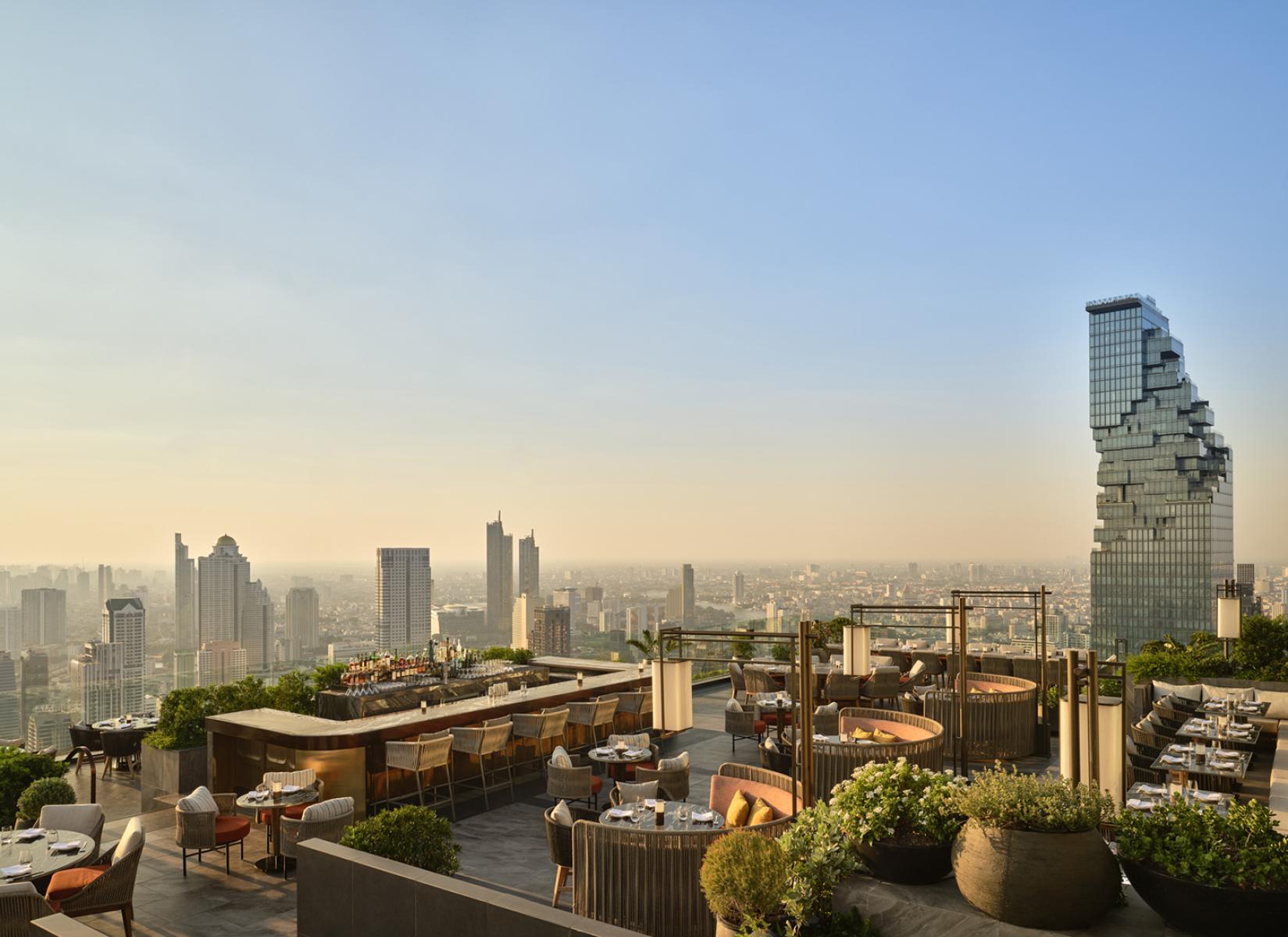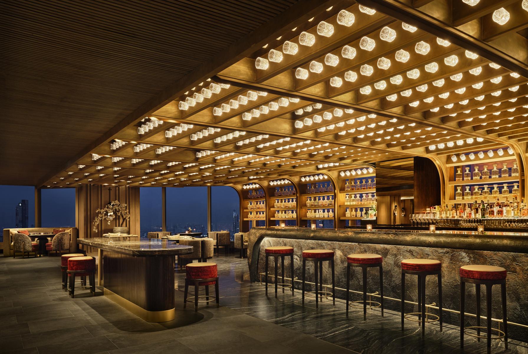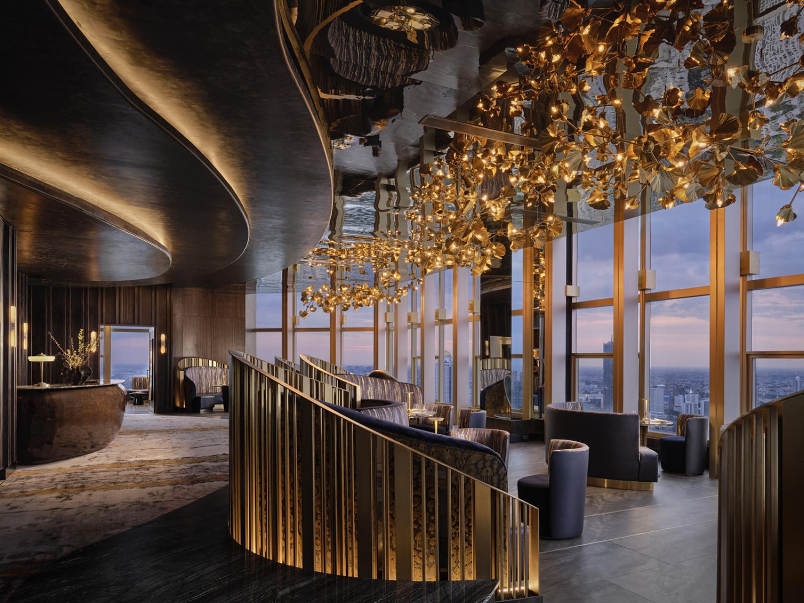 Urbain : La salle à manger principale et le bar sont inspirés de l'architecture vernaculaire thaïlandaise — ses toits en gradins et ses nuances dorées — et présentent des matériaux luxueux, tels que le travertin argenté, le bronze, les lattes de bois et les textiles traditionnels thaïlandais.