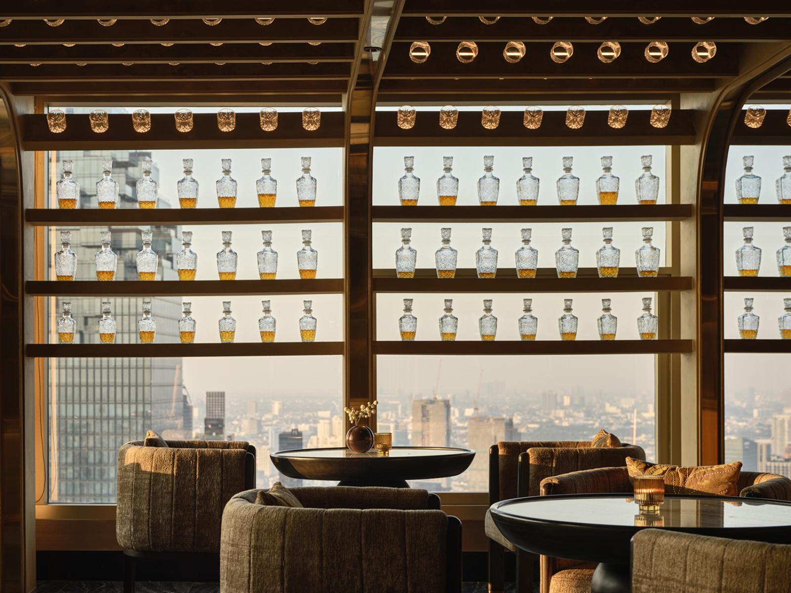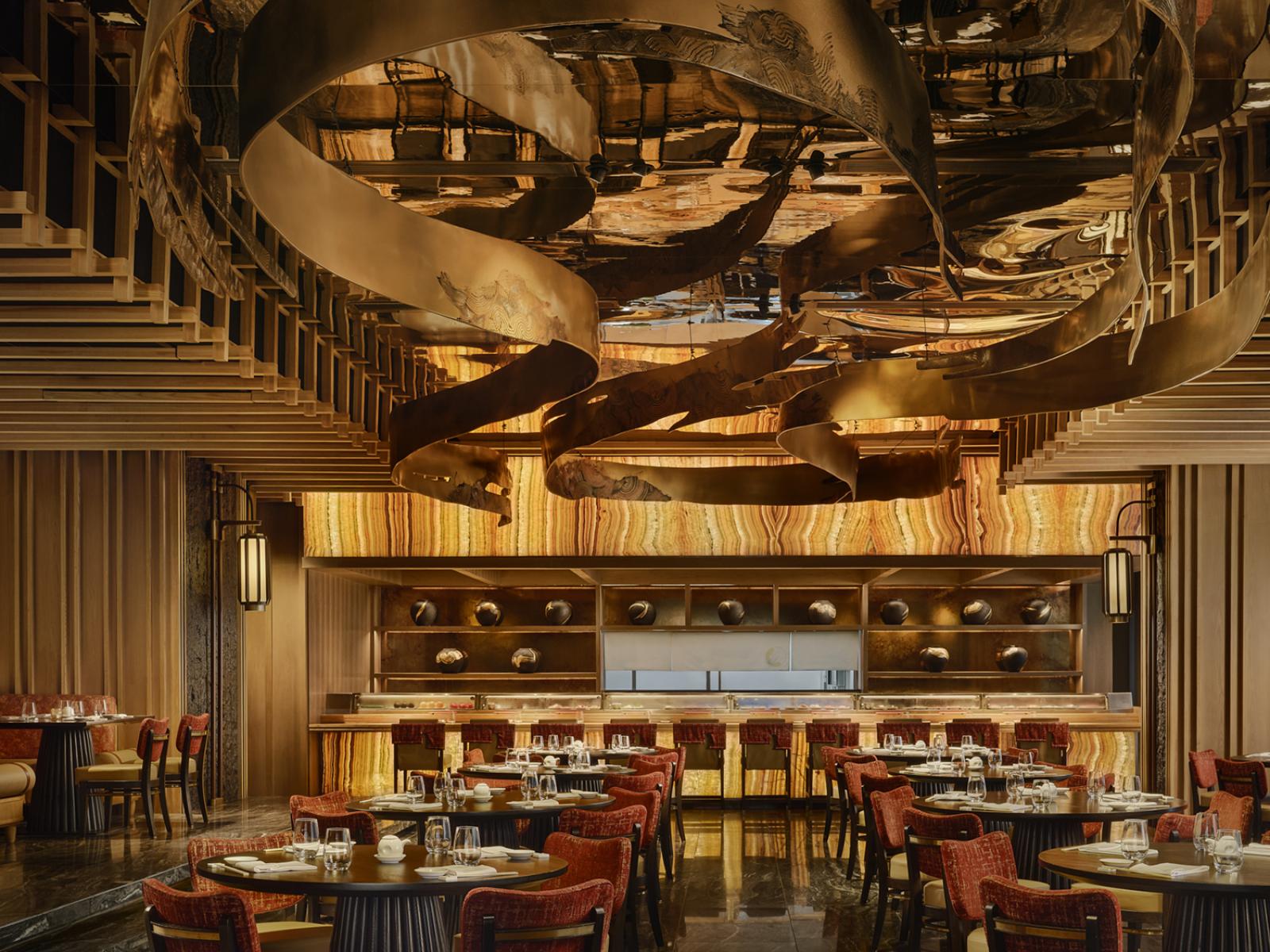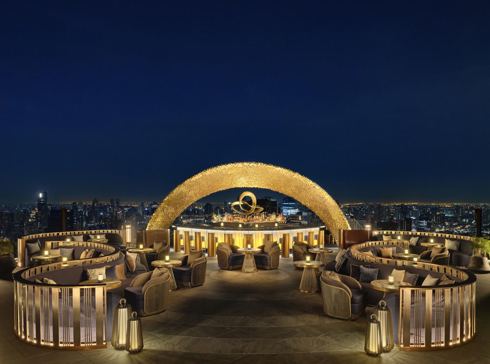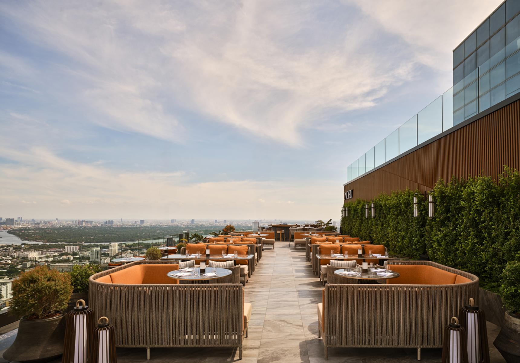 Urbain : La salle à manger principale et le bar sont inspirés de l'architecture vernaculaire thaïlandaise — ses toits en gradins et ses nuances dorées — et présentent des matériaux luxueux, tels que le travertin argenté, le bronze, les lattes de bois et les textiles traditionnels thaïlandais.