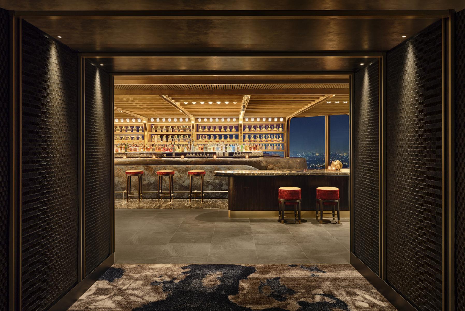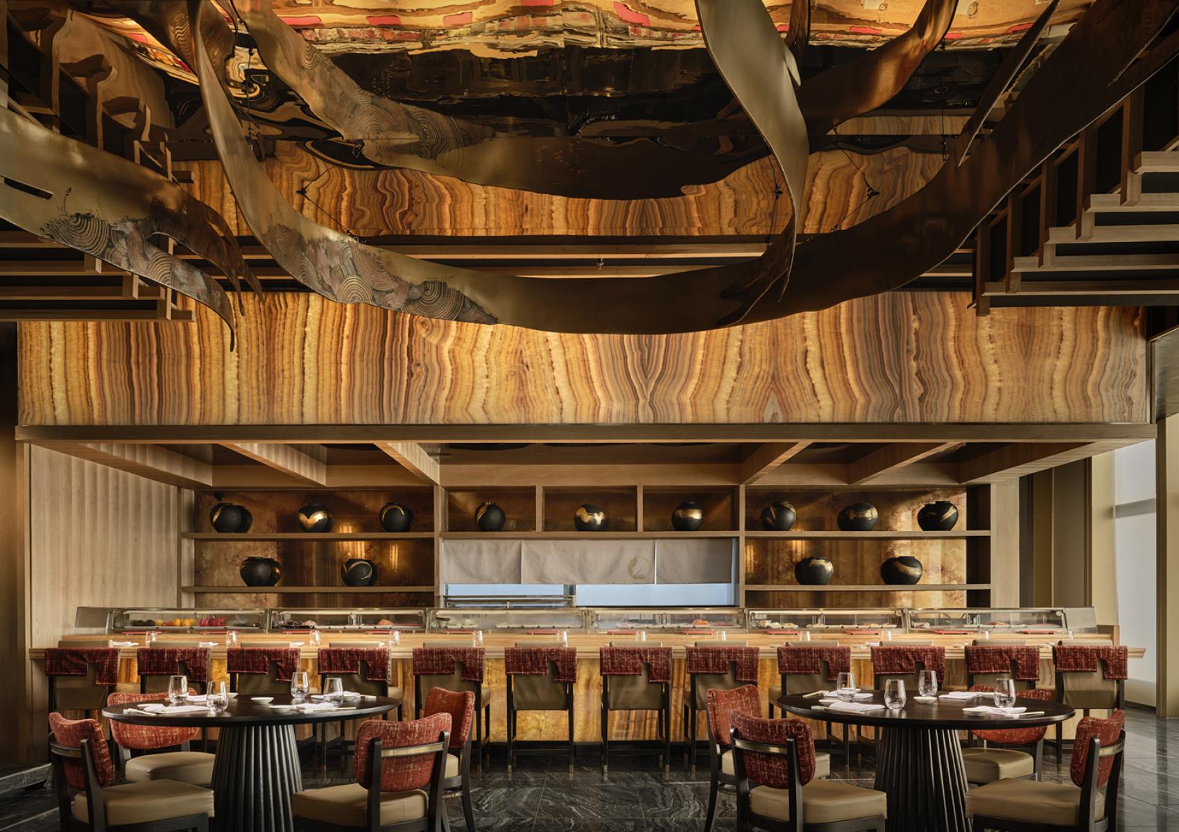 Les différents espaces de Nobu Bangkok pour dîner, socialiser, les grandes réunions et célébrations offrent un programme F&B distinct unique à Bangkok et à la culture thaïlandaise, telles qu'une salle de thé privée et des espaces événementiels modulables. L'expérience se termine avec le sky bar ouvert au sommet du bâtiment. Là, des banquettes basses et des sièges lounge permettent aux invités de profiter des vues à 360 degrés sur le skyline de Bangkok et la rivière Chao Phraya. Tout au long du projet, les matériaux et les textures fusionnent les riches techniques artisanales de la Thaïlande, telles que les textiles tissés à la main et la sculpture sur bois, avec les arts japonais traditionnels, tels que le Kintsugi et la calligraphie.