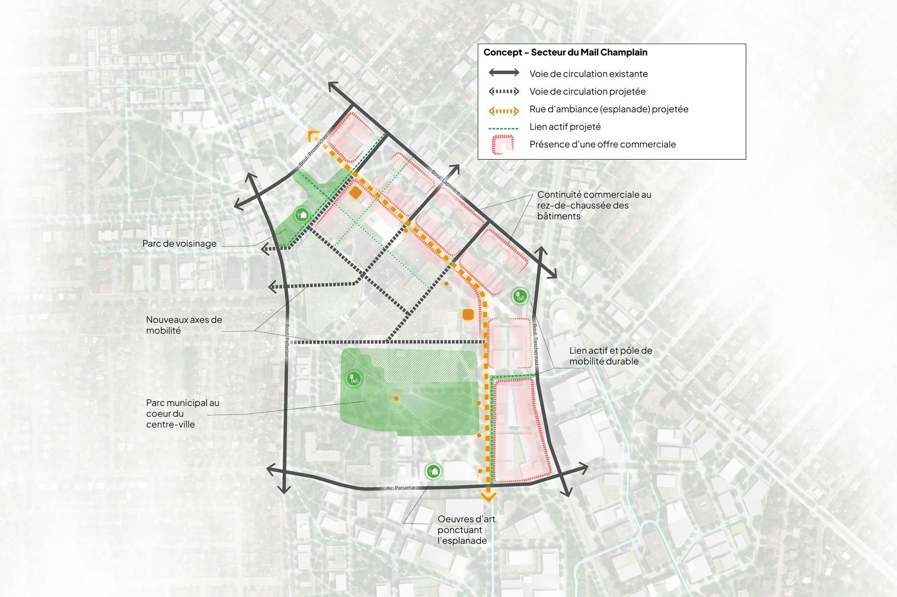 Parmi les gestes structurants proposés, l’aménagement d’une esplanade publique piétonne traversant l'ensemble du centre-ville créera un fil conducteur et une connectivité au-delà des barrières physiques. Elle incarnera la nouvelle identité du centre-ville, une transformation urbaine marquée par un verdissement ambitieux, une architecture soignée et la création d’un réseau d’espaces publics afin d’offrir un cadre de vie de qualité renouvelé. Le grand parc central est un autre des gestes phares planifié au coeur du centre-ville. Positionné à la jonction des plus importants projets de redéveloppement, l'espace public d'envergure supportera l'arrivée d'une nouvelle population résidente. Sa configuration a été réfléchie pour faciliter la cession et son aménagement sans générer des acquisitions trop importantes pour la Ville.