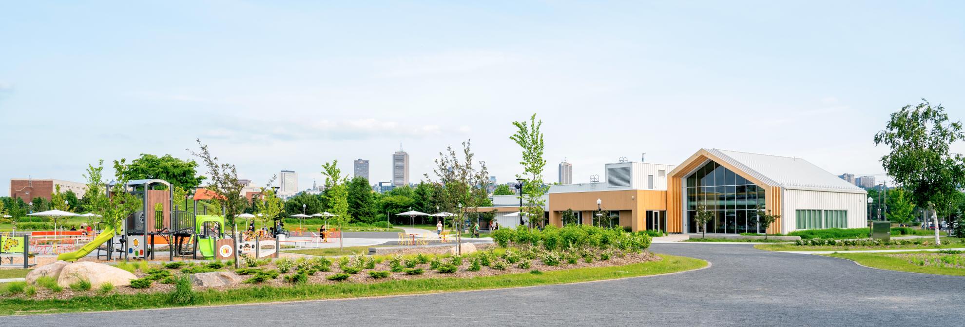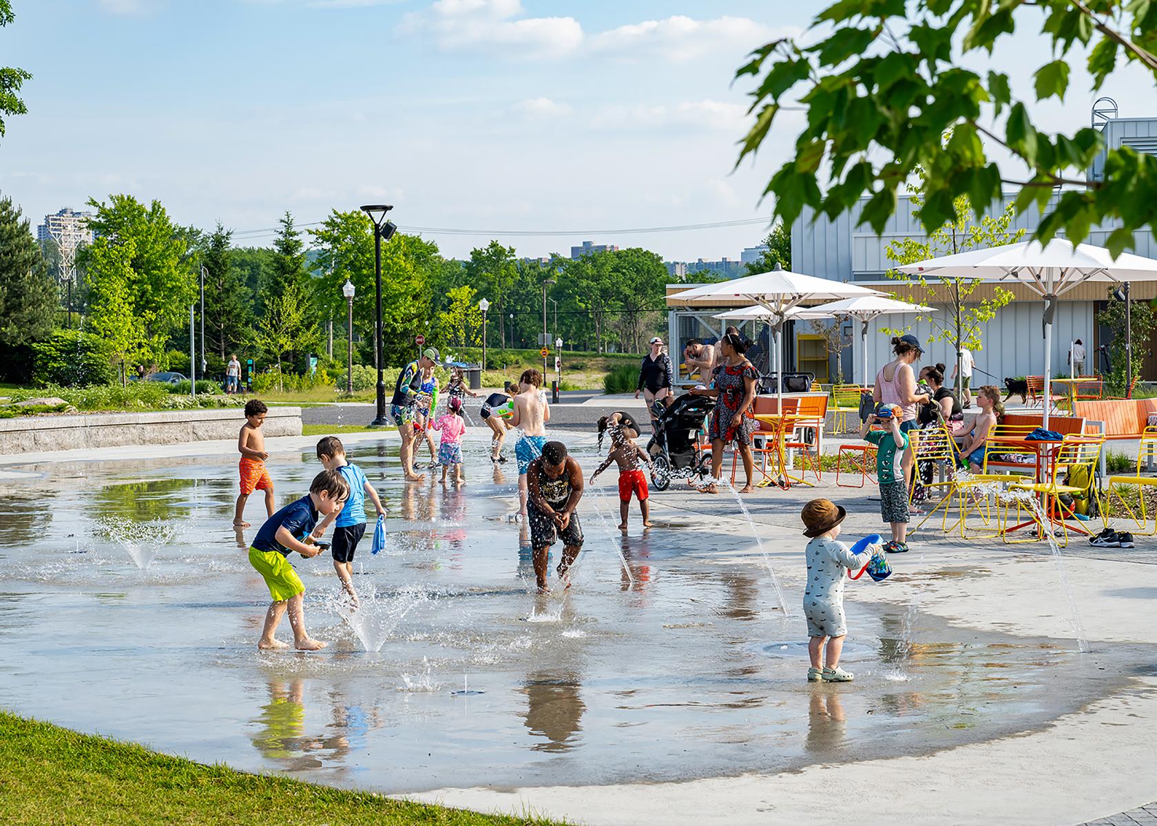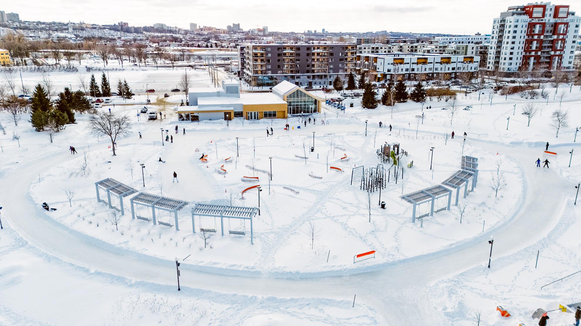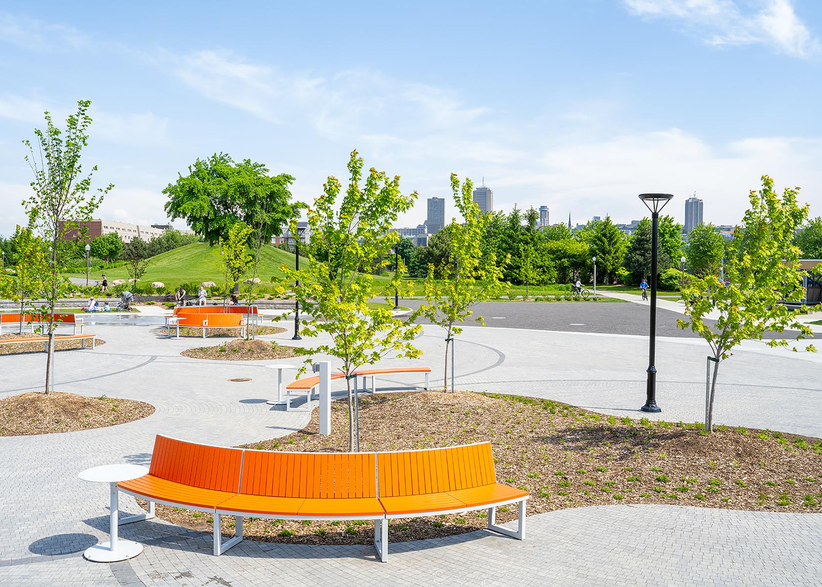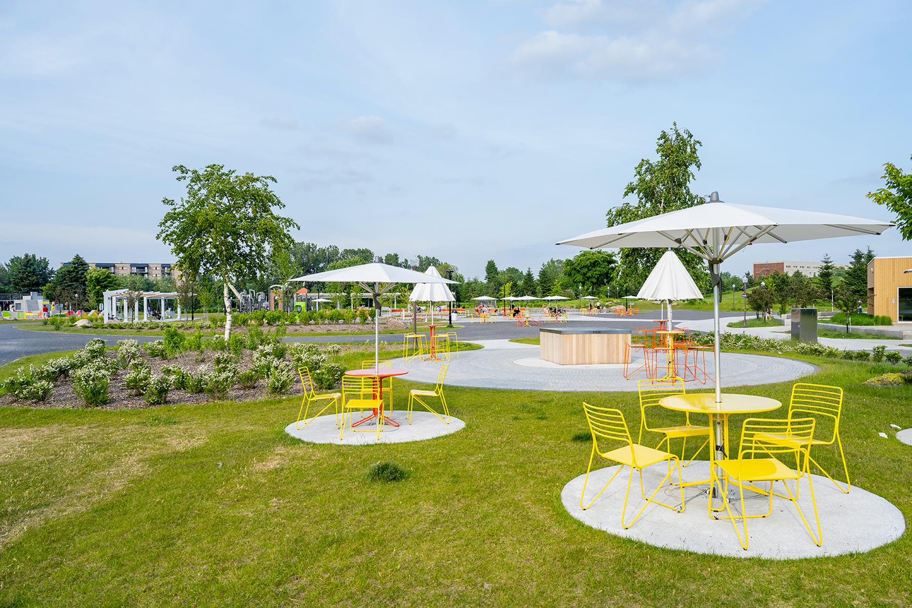 Le concept d’aménagement s’articule autour de la création d’une grande place centrale multifonctionnelle, conviviale, dans la perspective de l’entrée principale du pavillon d’accueil et de services. Ce grand espace flexible permet à la fois les rassemblements tout en restant à l’échelle du parc par l’implantation de mobilier amovible composé de tables colorées et de parasols. Des bancs sinueux épousent les formes des îlots de verdure. La plantation de massifs arbustifs et d’arbres à grand déploiement ajoute un vent de fraîcheur à l’aire ouverte qui avec le temps contribuera à créer des pochettes ombragées en période de forte chaleur autour des zones de détente pour les cyclistes et piétons. En période hivernale, la place centrale devient une grande surface glacée où convergent les différents sentiers de patinage que compte le parc.