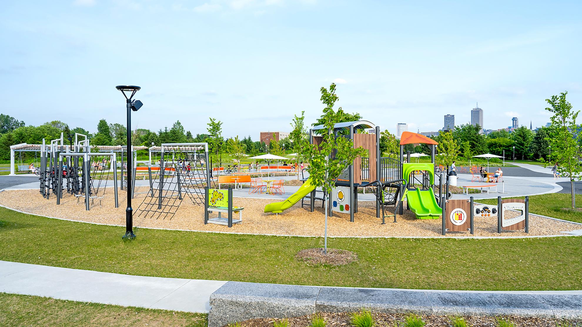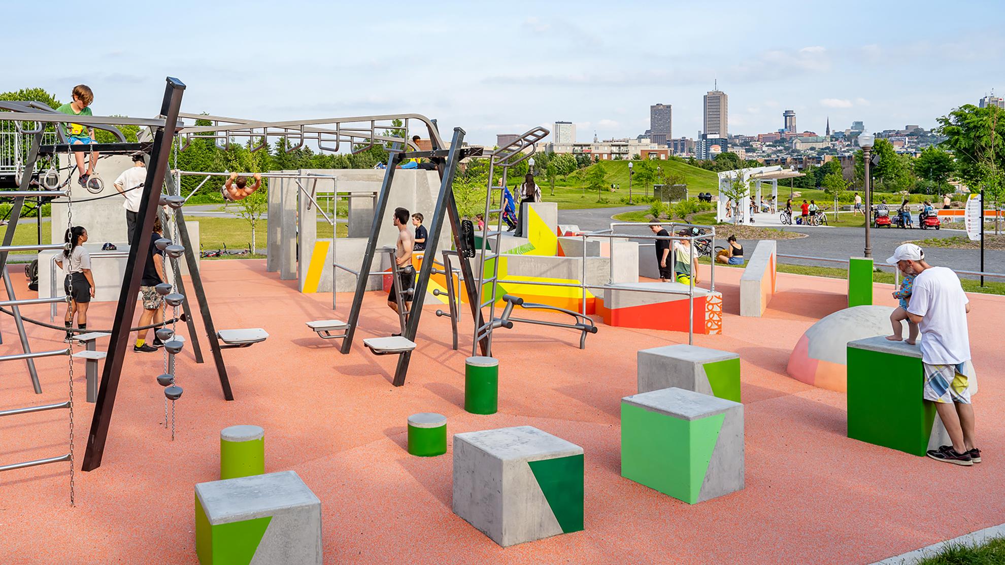 En arrière-scène, on retrouve des équipements de loisirs pour tous les âges et tous les calibres, dont la toute première aire de Parkour extérieur au Québec axé sur l’art du déplacement. Des installations d’entraînement extérieur comprenant modules d’escalade et jeux d’équilibre sont intégrés à l’ensemble.