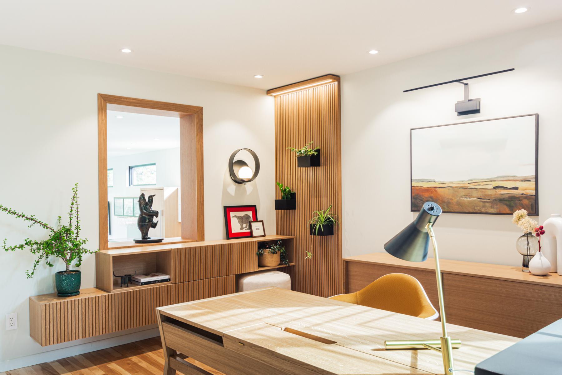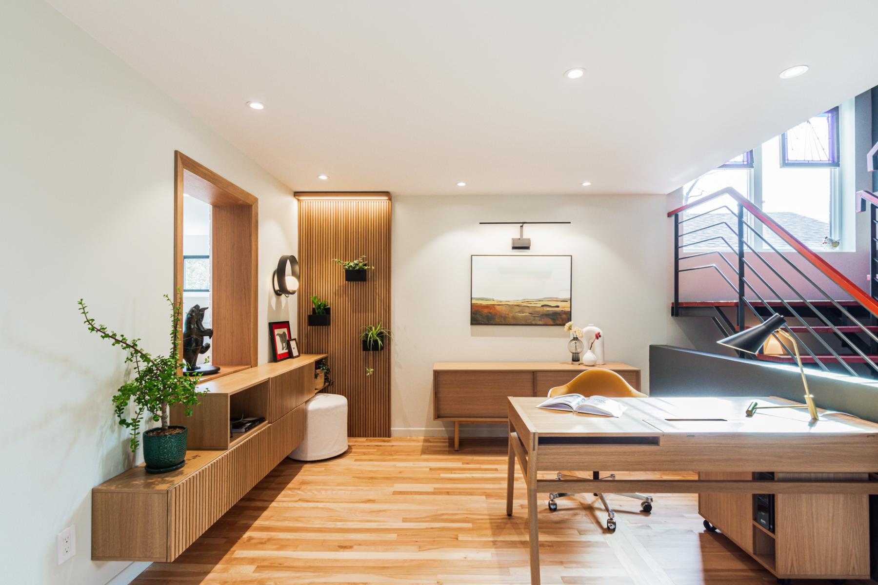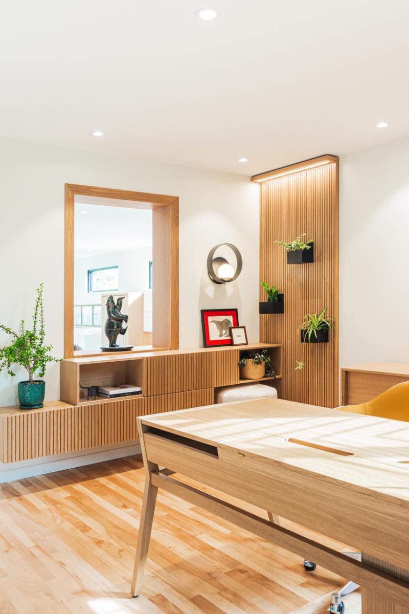 L’aménagement du bureau, situé stratégiquement à proximité immédiate de l’entrée principale, a également été soigneusement pensé. Véritable point de contact visuel dès l’arrivée, cet espace se devait d’être à la fois pratique, généreux en rangements, et esthétiquement en lien avec l’ensemble du projet. Les matériaux employés, choisis dans la même essence que ceux du mobilier intégré de l’entrée et de la cuisine, jouent avec les textures et les finitions pour créer une harmonie discrète et soignée, tout en maintenant une continuité visuelle chaleureuse et élégante.