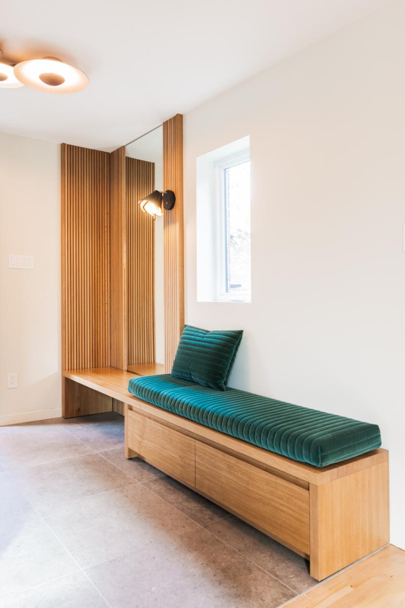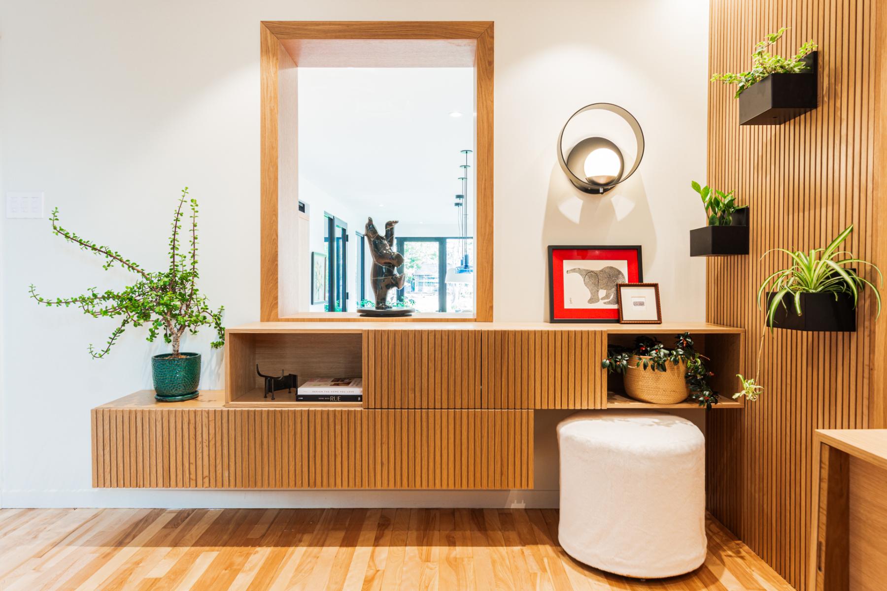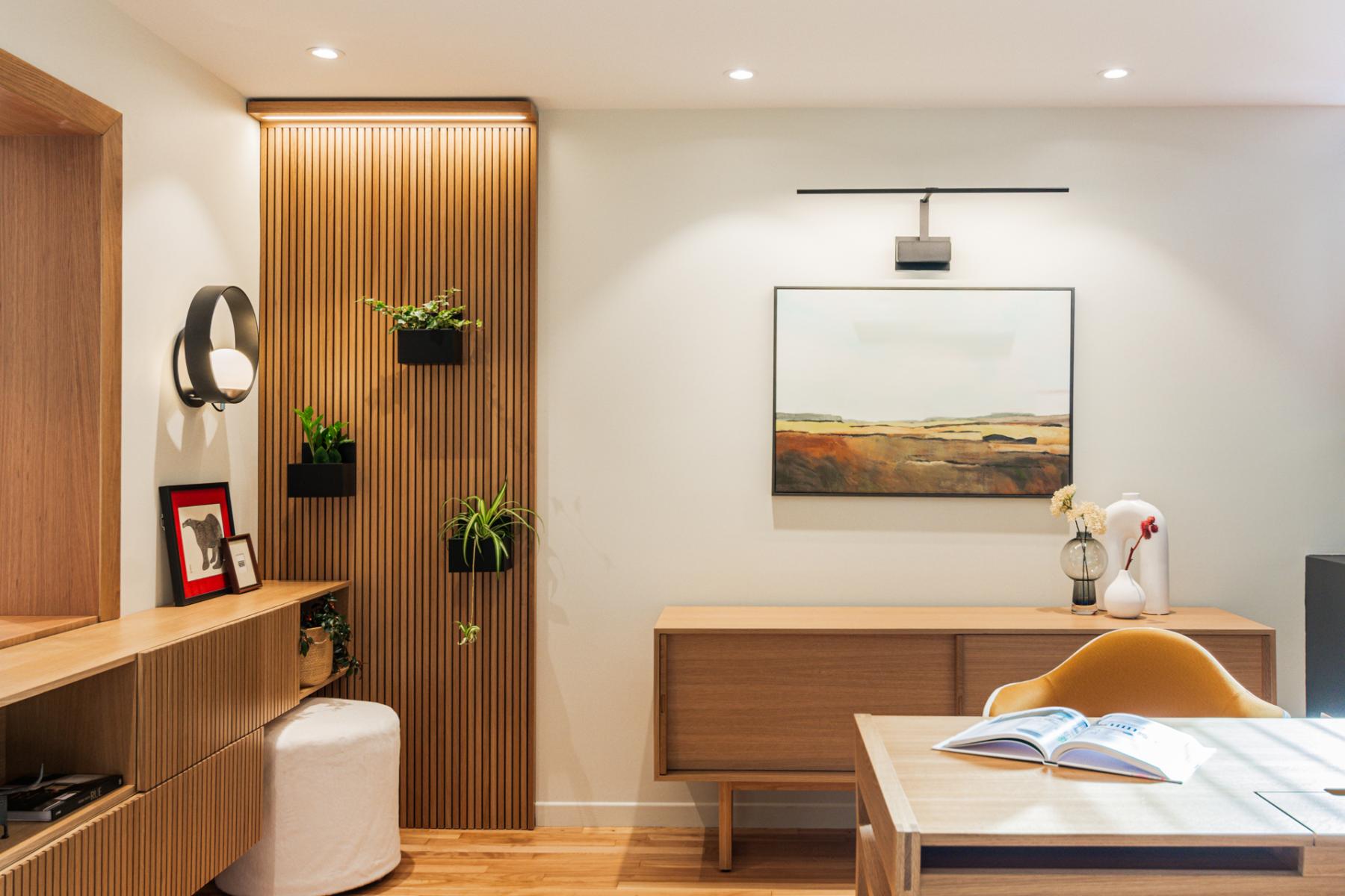 L’aménagement du bureau, situé stratégiquement à proximité immédiate de l’entrée principale, a également été soigneusement pensé. Véritable point de contact visuel dès l’arrivée, cet espace se devait d’être à la fois pratique, généreux en rangements, et esthétiquement en lien avec l’ensemble du projet. Les matériaux employés, choisis dans la même essence que ceux du mobilier intégré de l’entrée et de la cuisine, jouent avec les textures et les finitions pour créer une harmonie discrète et soignée, tout en maintenant une continuité visuelle chaleureuse et élégante.