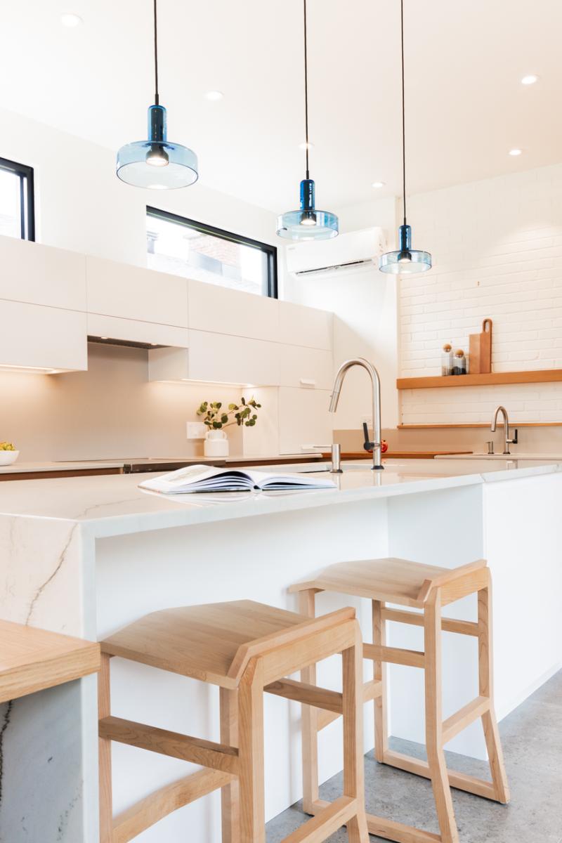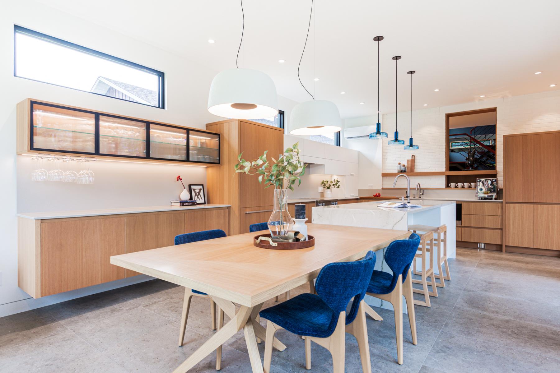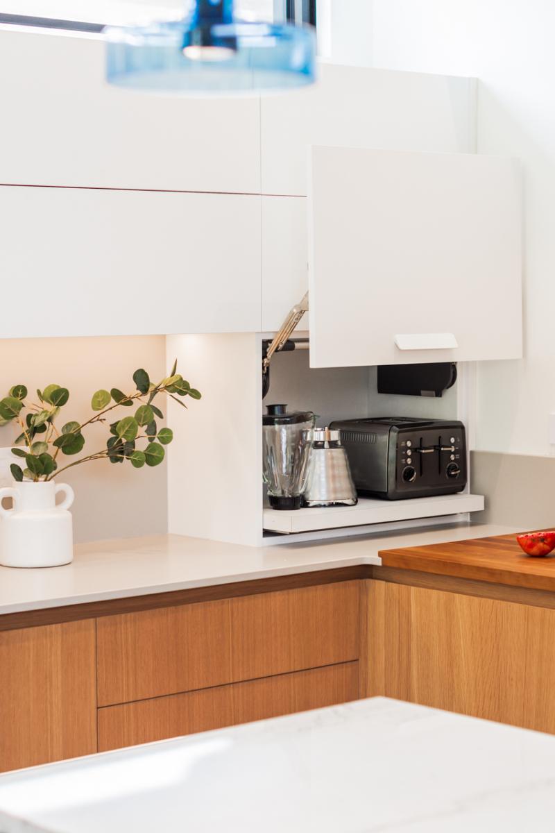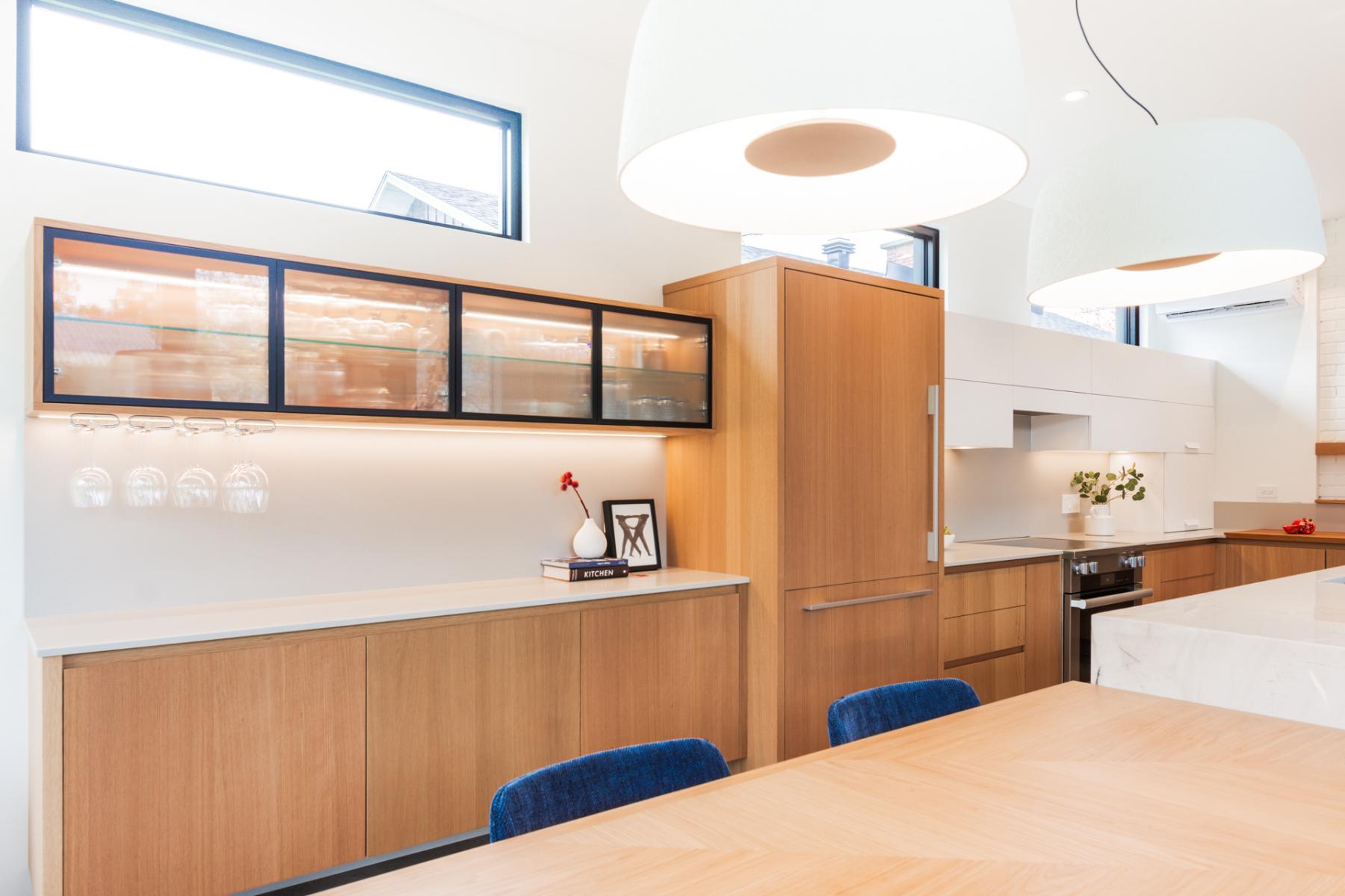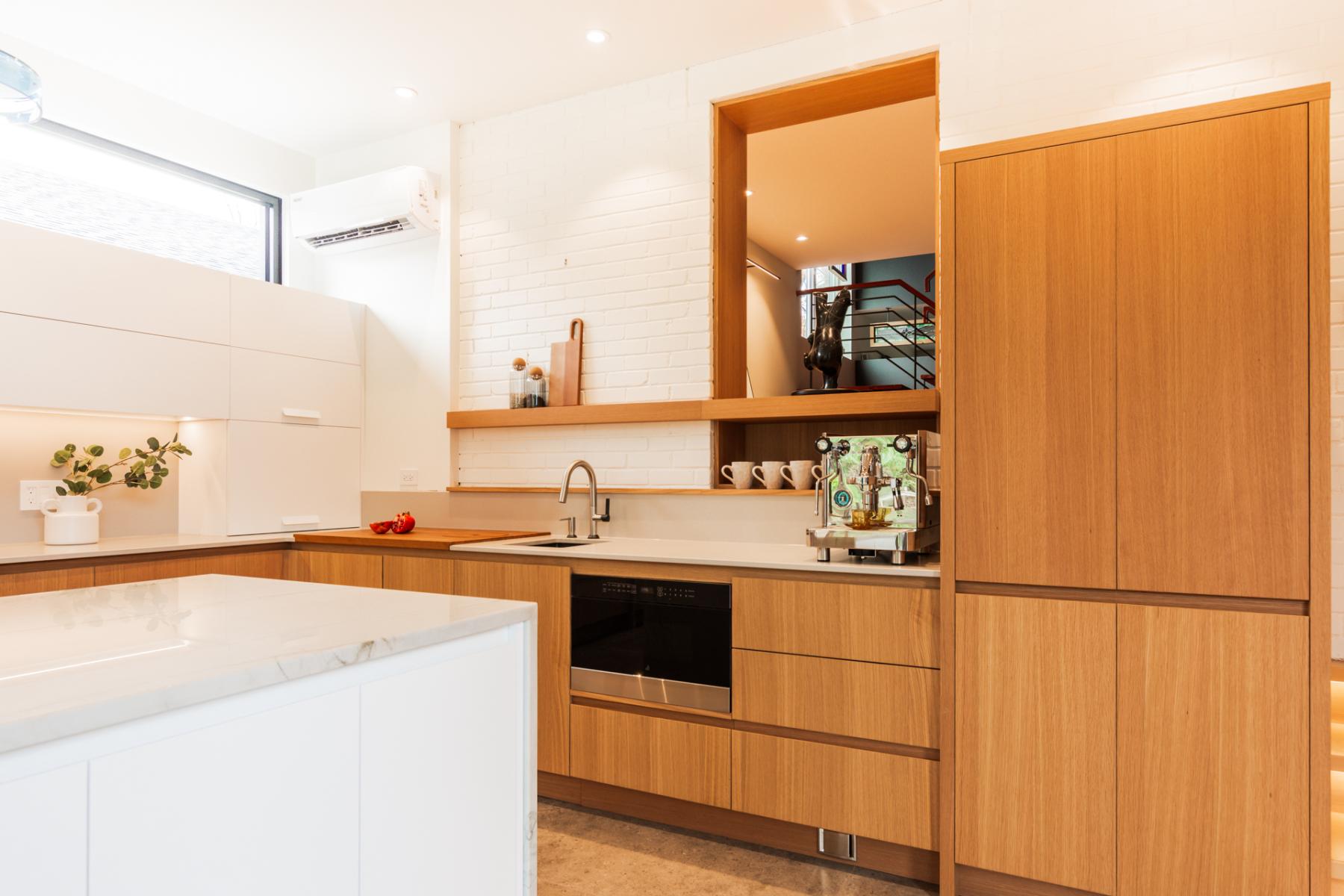 Les clients souhaitaient une conception qui s'intègre parfaitement avec l’architecture existante, tout en optimisant les espaces de rangement et en définissant clairement plusieurs zones d’usage : un coin café, une zone de préparation des repas et un espace dédié aux boissons.