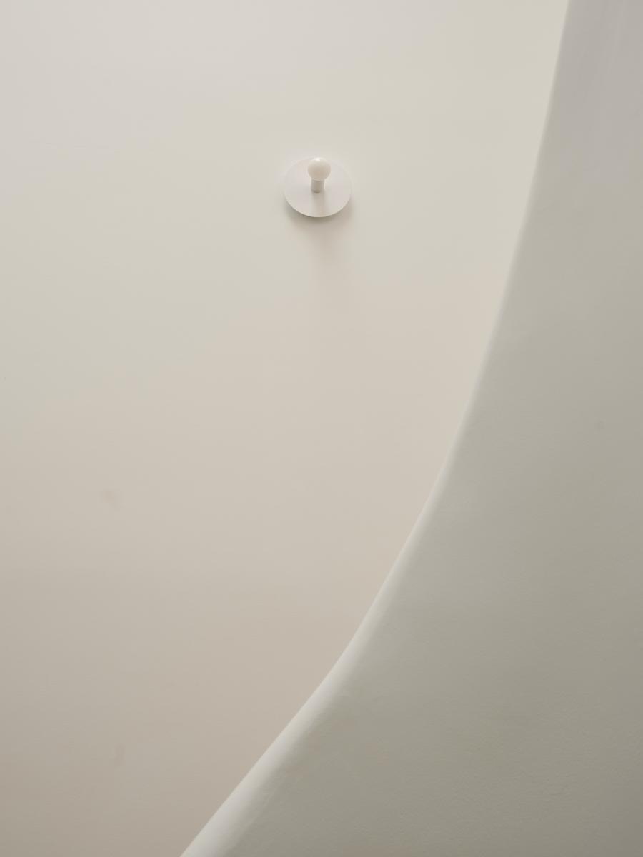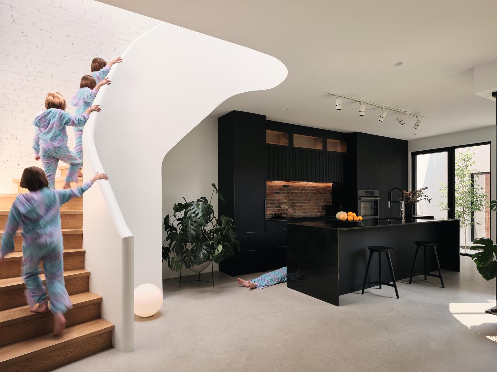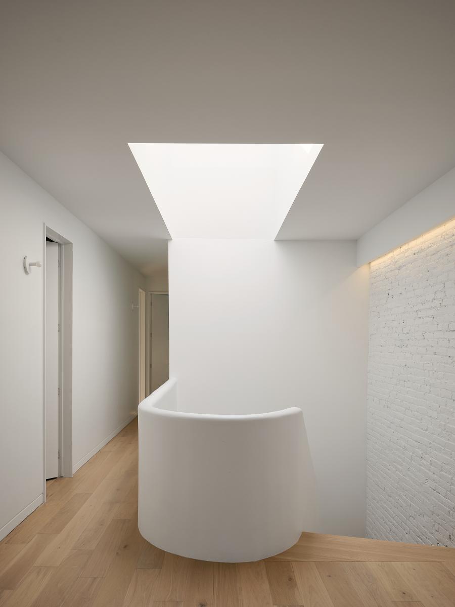 S’élevant au centre de la maison, cet escalier courbe, entièrement modelé en plâtre, flotte comme un ruban blanc sous un grand puits de lumière. Il traverse les niveaux dans un geste fluide, reliant les espaces avec grâce et légèreté. Chaque courbe, chaque arrondi a été pensé pour susciter une expérience sensible : la main glisse sur la rampe, la lumière caresse les surfaces, le bois clair résonne sous les pas. Plus qu’un élément de circulation, l’escalier devient repère spatial, scène de vie, lieu de contemplation. Les enfants y jouent, les plantes y trouvent leur place, les rayons du jour s’y déploient. Ce n’est plus un lieu de passage, mais un espace habité.