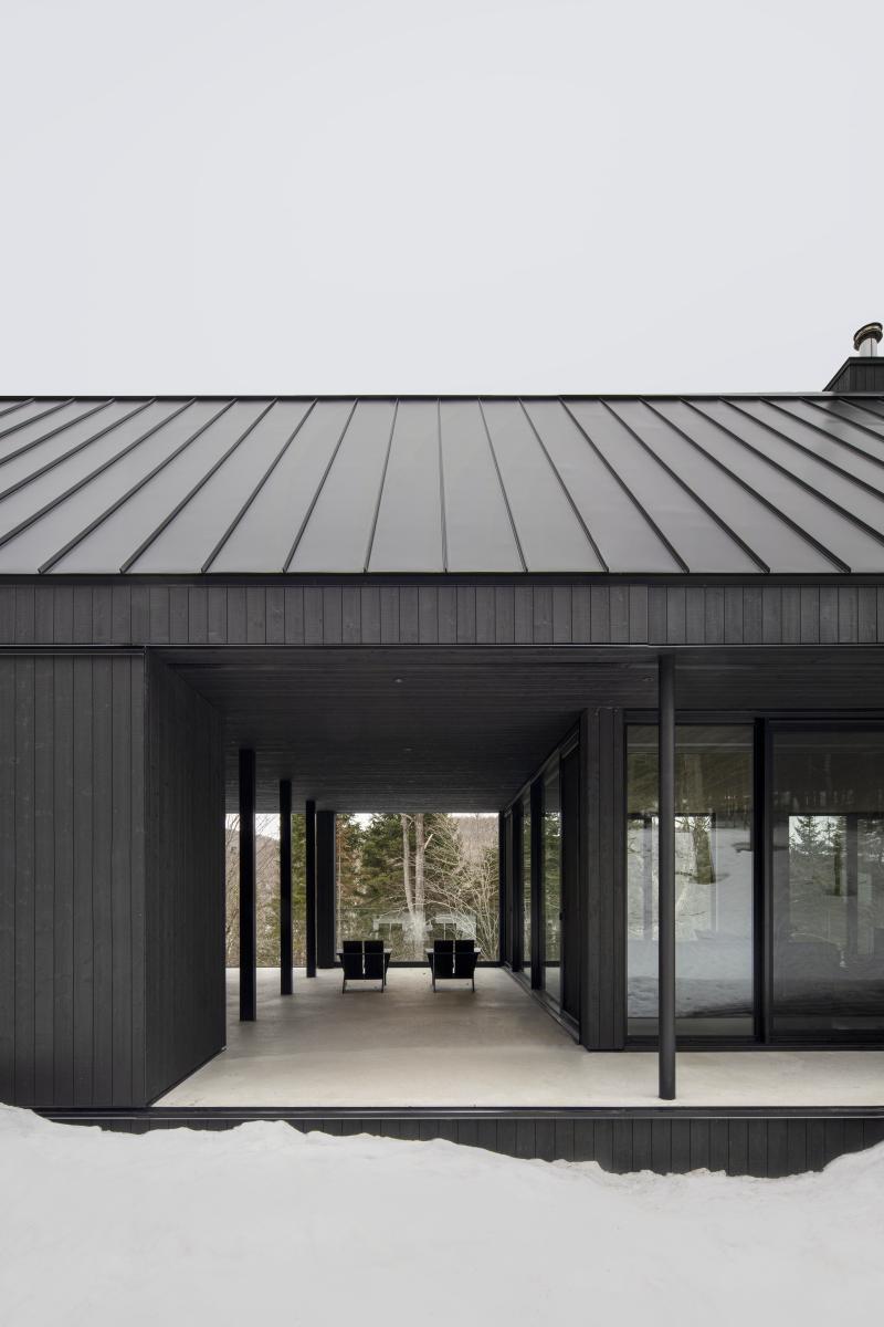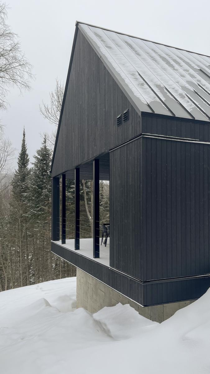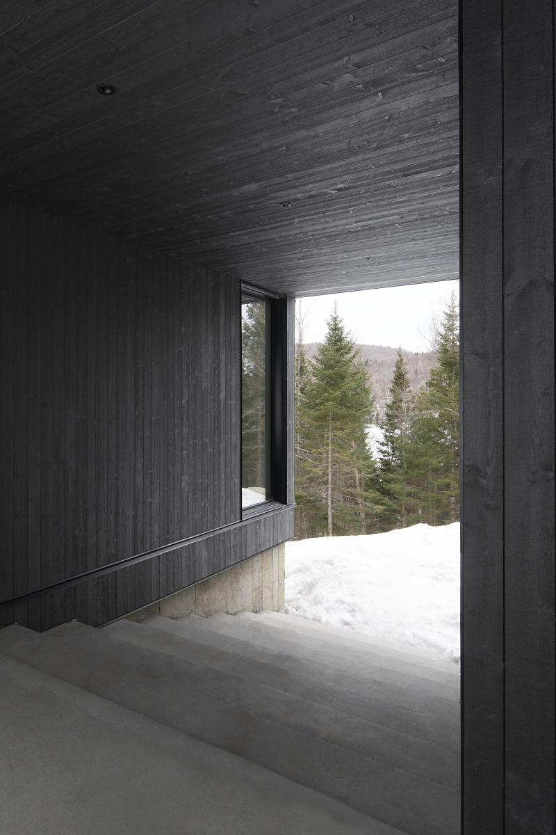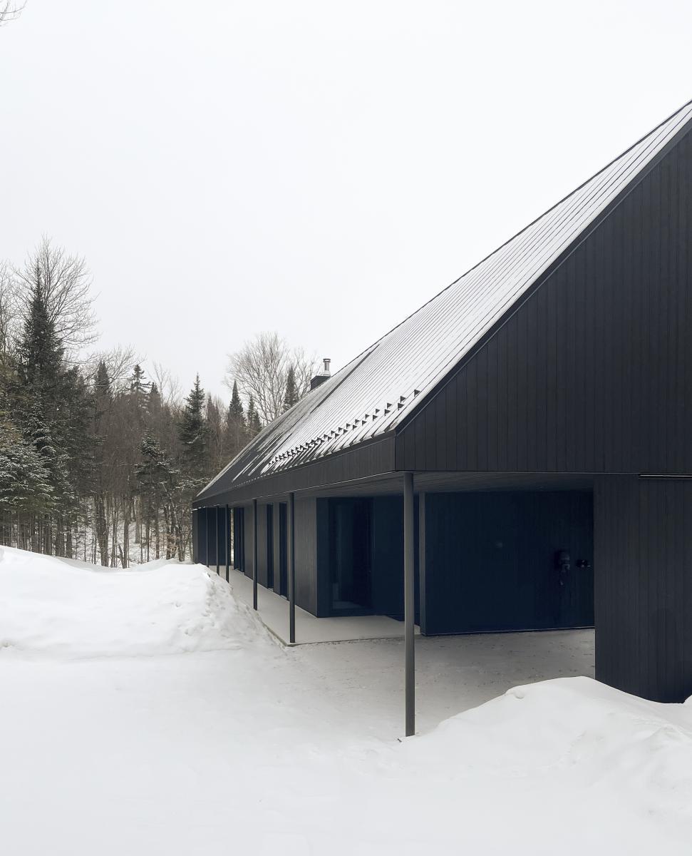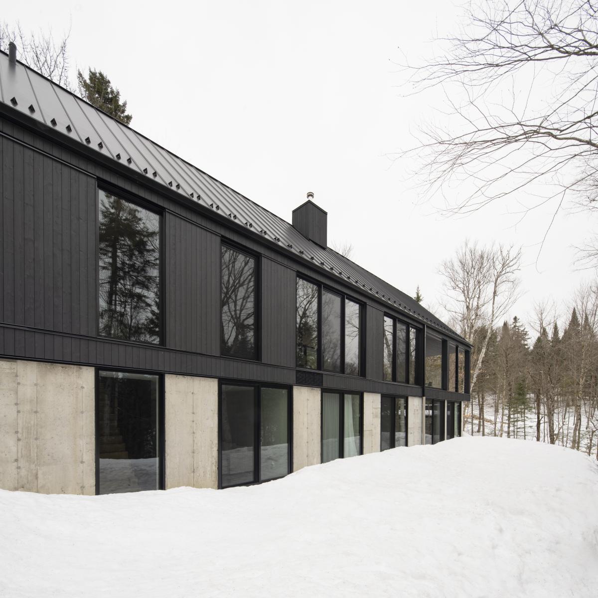 Située dans les Laurentides, la résidence crée un jeu visuel entre le paysage et l'architecture.