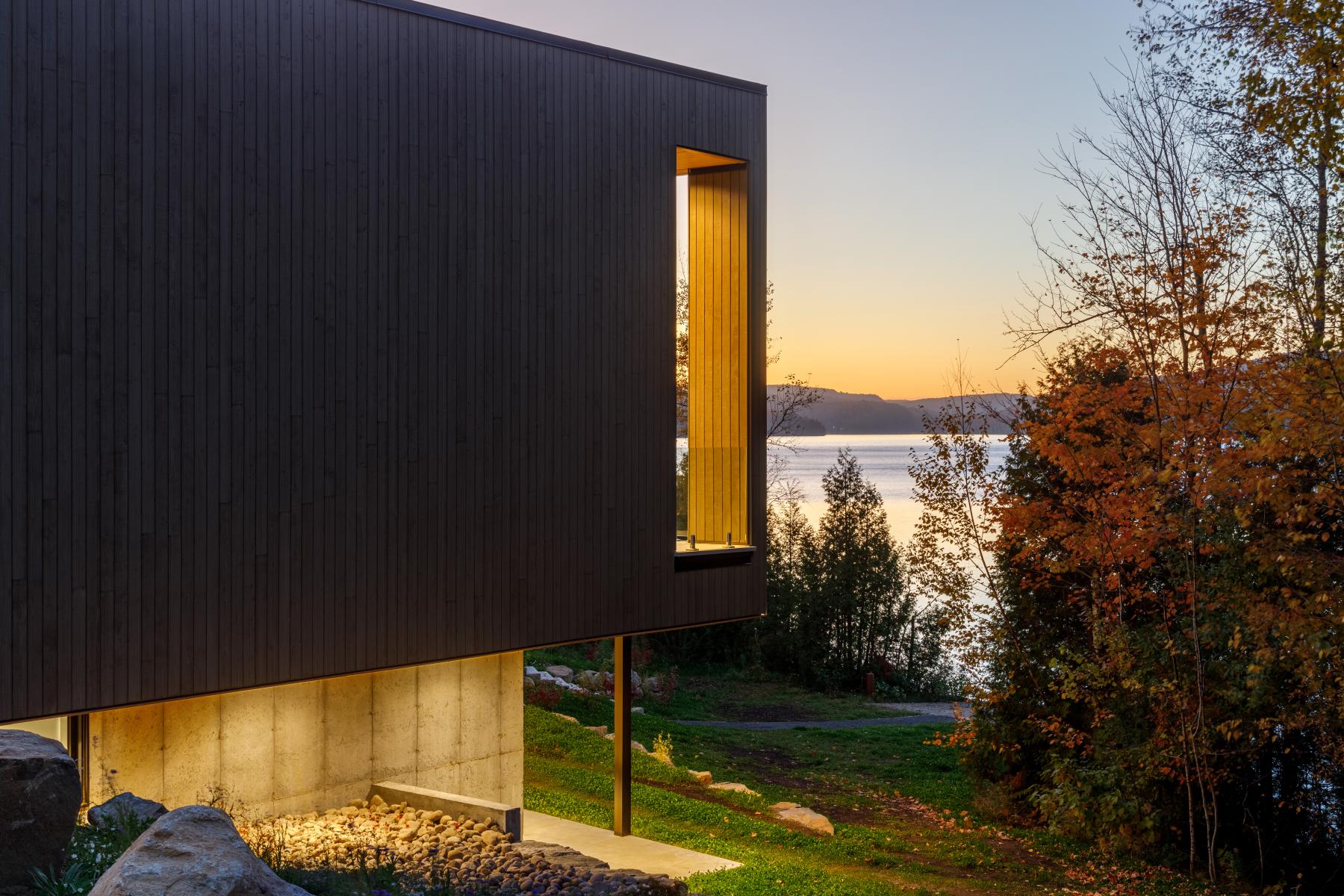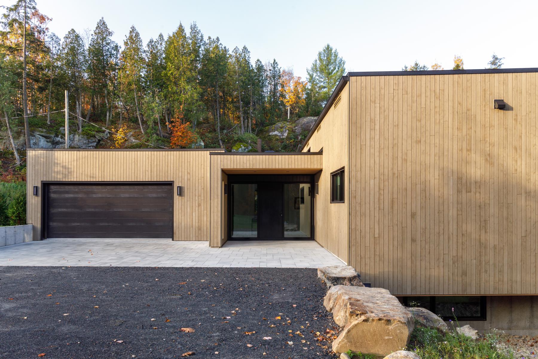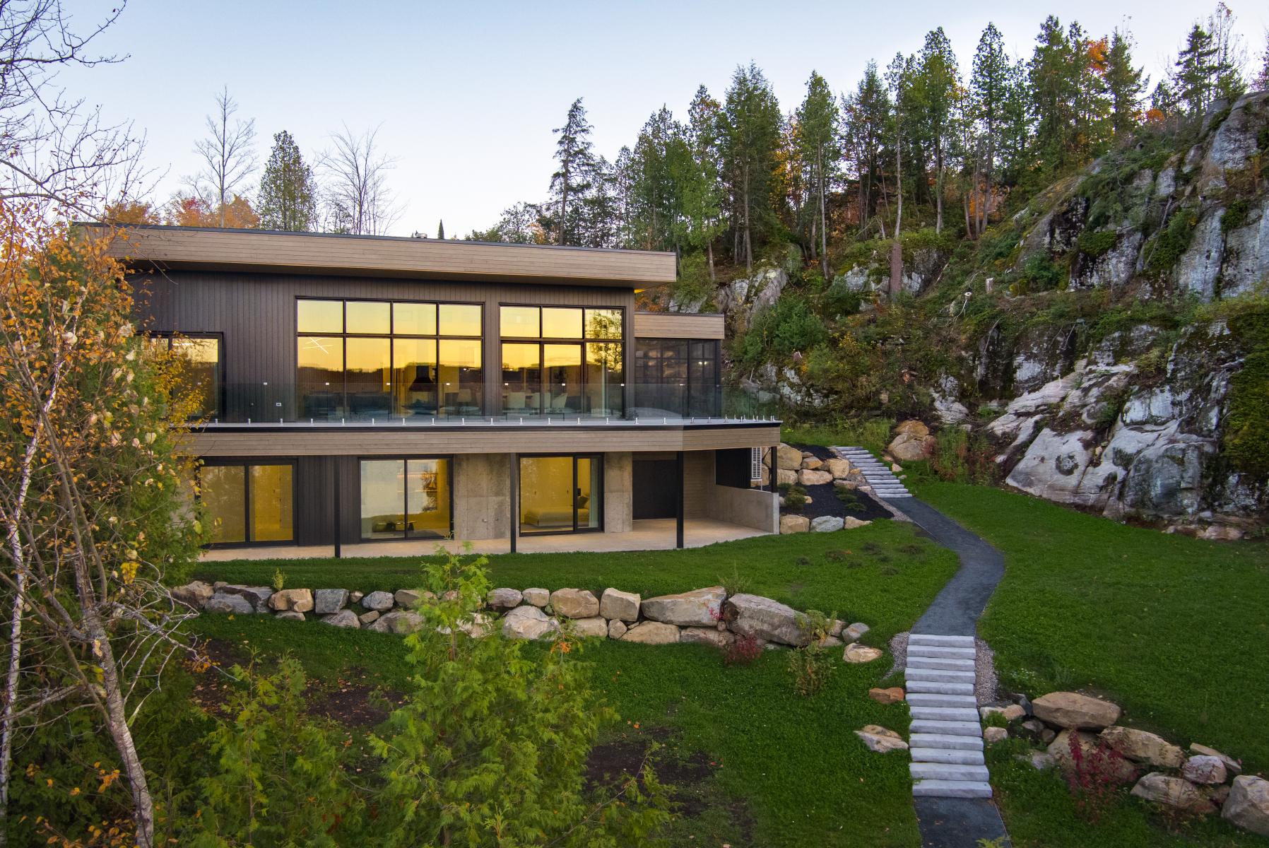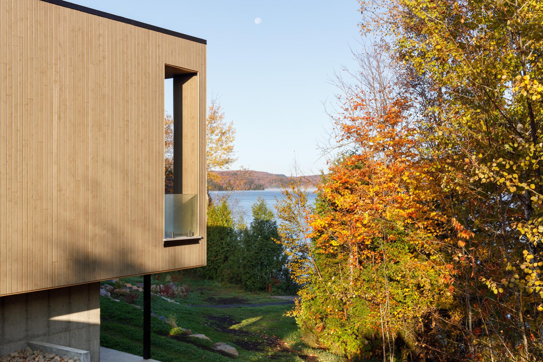 Nichée sur les rives du lac des Piles, situé dans la région de la Mauricie au Québec, la Résidence Lac-des-Piles prend racine sur un site qui aurait autrefois accueilli un hôtel de villégiature et dont il ne reste pour seul vestige qu’un quai de béton s’avançant dans l’eau. Le propriétaire, initialement installé à l’arrière du lot, a su saisir l’opportunité d’acquérir cet emplacement grandiose il y a plusieurs années, avec le souhait d’y construire éventuellement un projet d’exception qui profiterait du paysage majestueux et de l’accès direct au lac.
