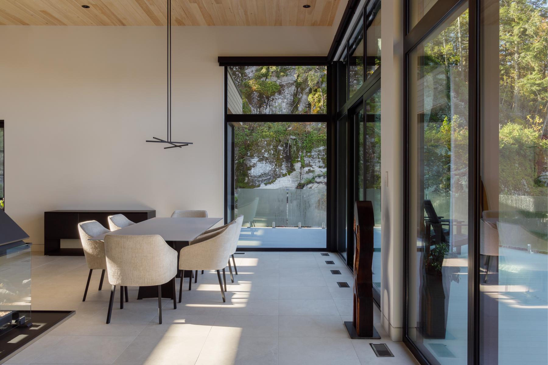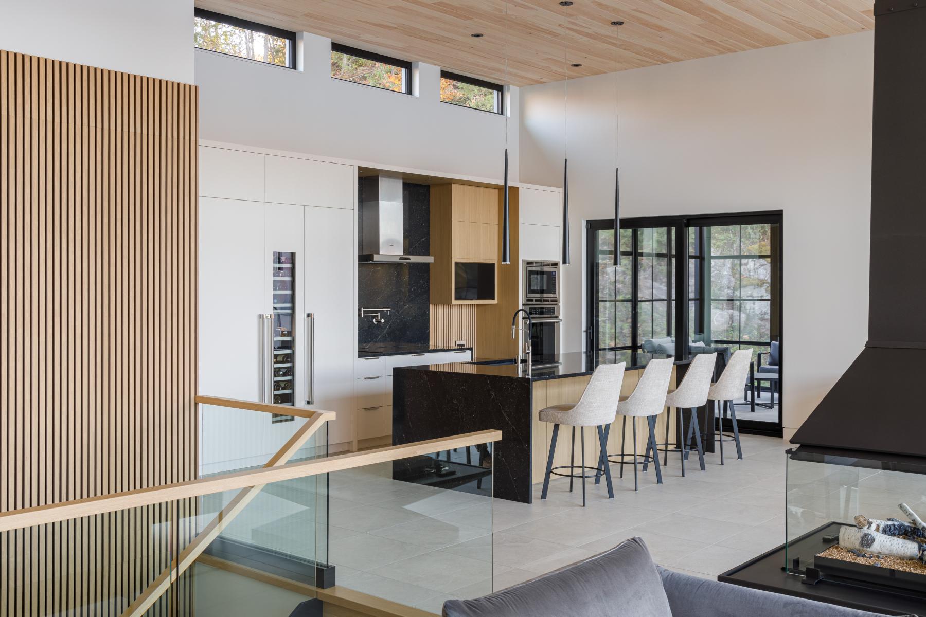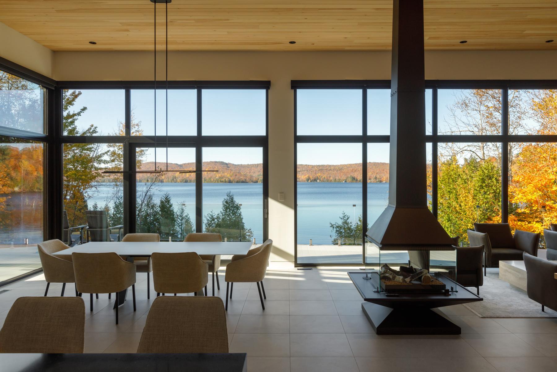 Le design intérieur et le mobilier intégré, réalisés par Marie-Ève Loranger d’INOUI design, traduit avec finesse les intentions architecturales. L’ameublement et les matériaux ont été sélectionnés pour leur sobriété et leur capacité à laisser toute la place au paysage. L’ébénisterie sur mesure et les choix de luminaires viennent renforcer la cohérence de l’ensemble, sans jamais rivaliser avec l’immensité du cadre naturel.