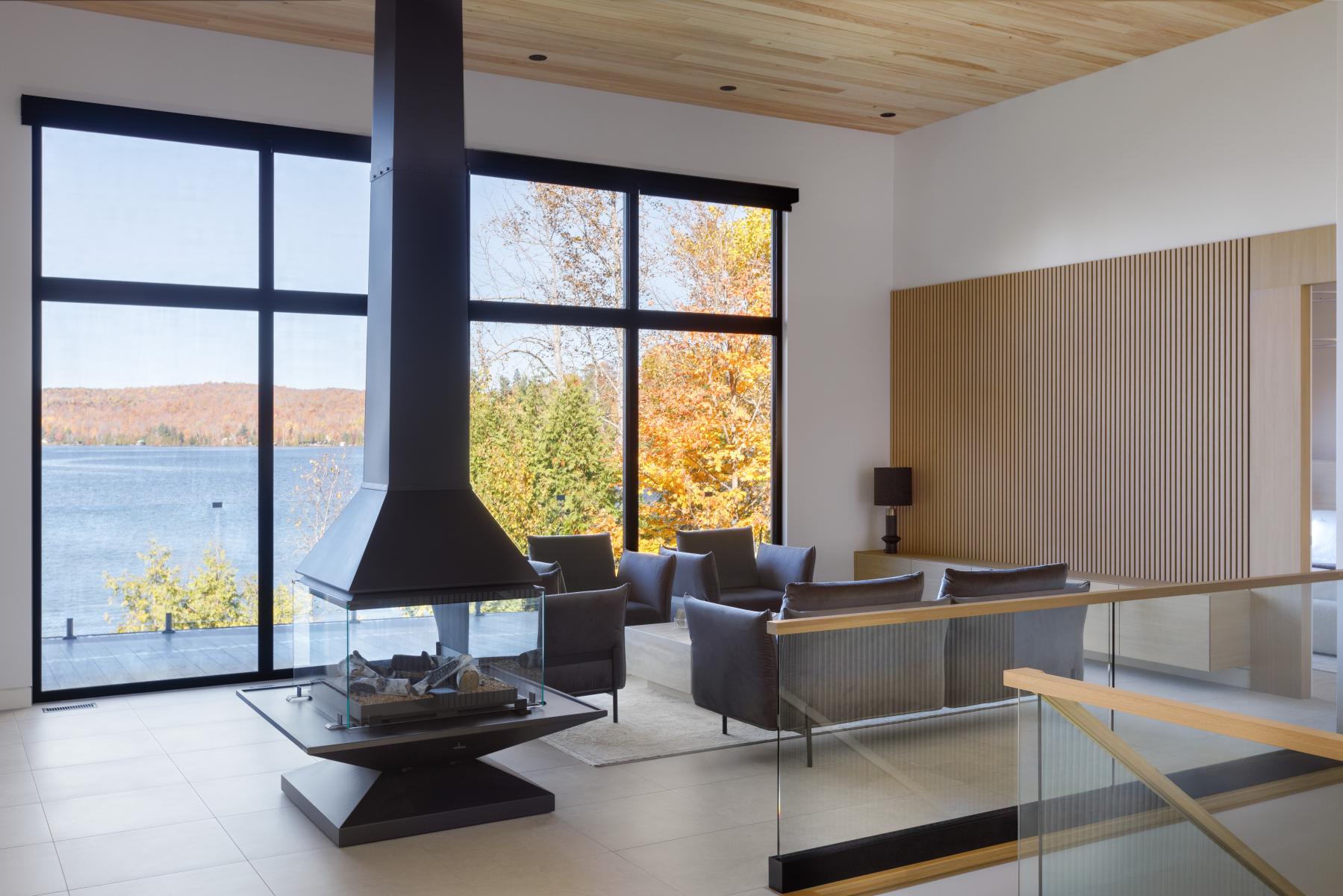 Au cœur de l’espace de vie, un foyer central agit comme point d’ancrage et lieu de rassemblement. Léger et transparent, il structure l’aire ouverte sans obstruer les perspectives sur le lac. Inspiré du feu de camp, cet espace, symbole de convivialité et de chaleur humaine, crée une atmosphère accueillante, propice aux moments partagés.