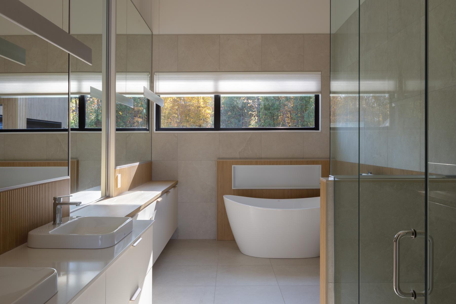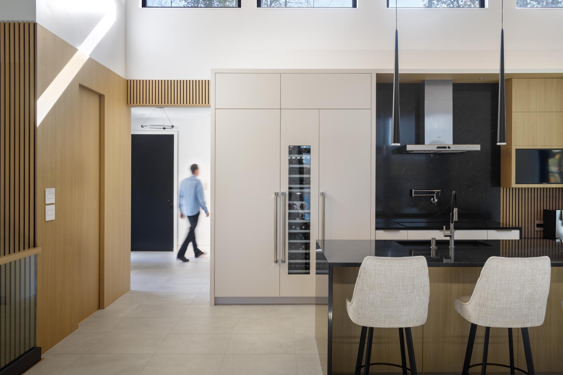 L’architecture intérieure s’inscrit dans la même logique. Le plancher en céramique chauffante assure confort et durabilité tout en prolongeant l’effet de contraste entre la masse minérale du sol et la légèreté du bois qui habille les plafonds. Ce dernier, omniprésent, vient unifier les espaces et amplifier la connexion avec l’extérieur.