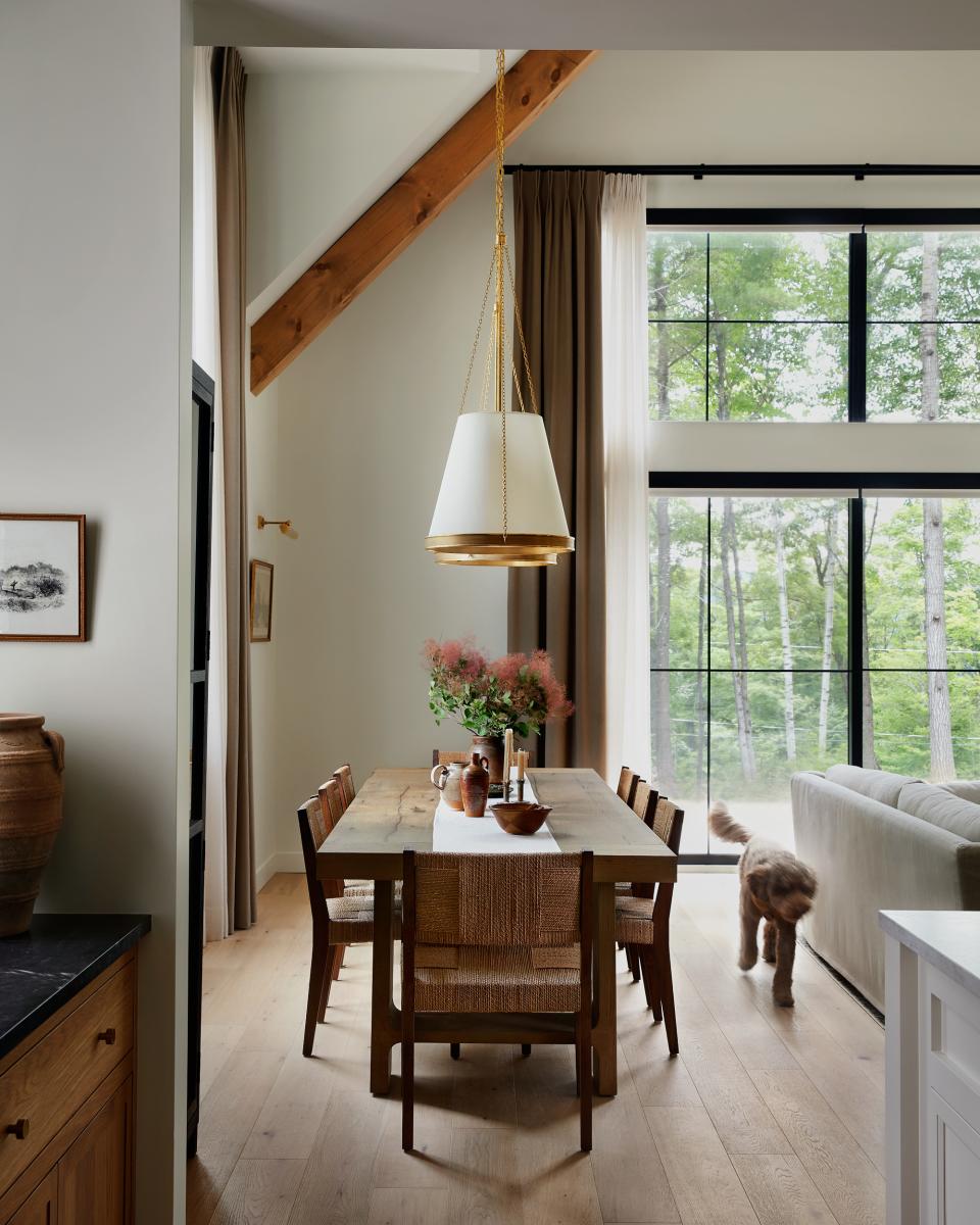 Érigée sur une structure à aire ouverte avec plafonds cathédrales, la demeure s’ouvre généreusement sur son environnement grâce aux immenses fenêtres et aux larges portes coulissantes situées à l’arrière de la maison. Ce sont elles qui inondent les espaces de lumière naturelle, créant une continuité apaisante avec la nature extérieure. À l’avant, les grandes portes doubles en bois massif apportent également une belle luminosité, tout en offrant une chaleur classique et intemporelle dès l’entrée.