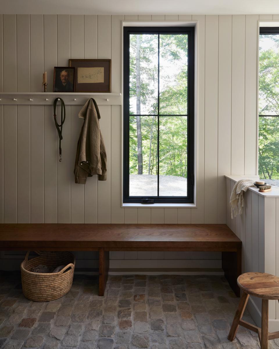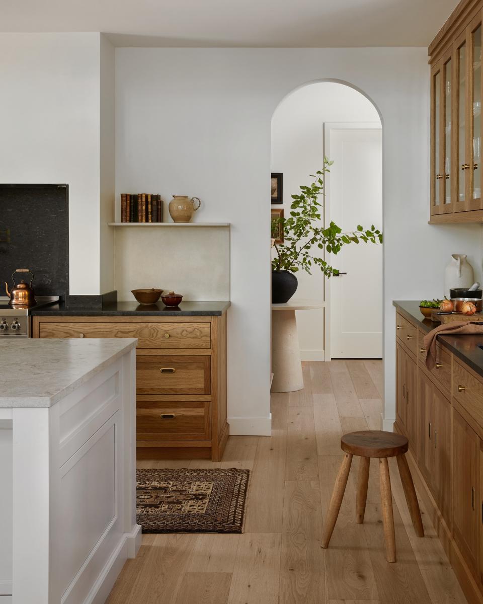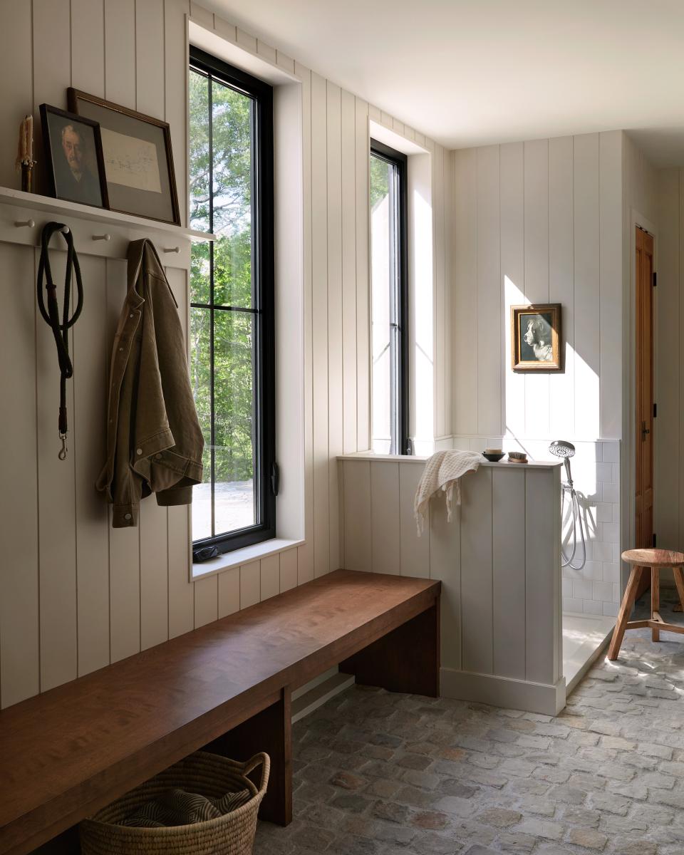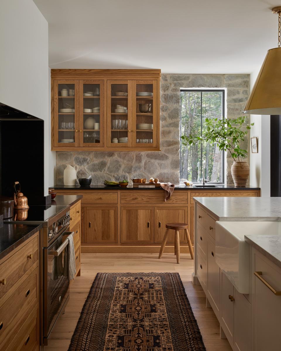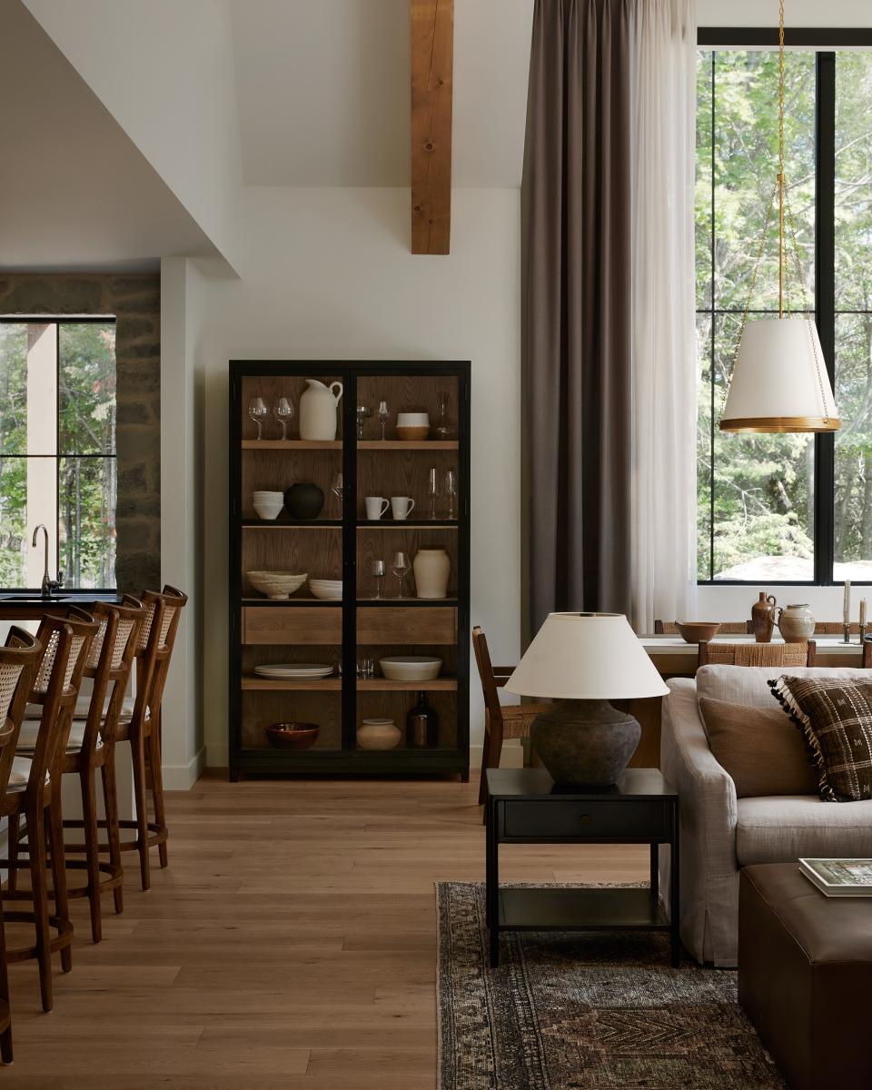 La cuisine moderne en bois massif conjugue fonctionnalité et esthétisme, tandis que le salon, sobre et épuré, met en valeur des poutres apparentes qui accentuent l’élégance naturelle du lieu. Une mudroom pensée pour sa fonctionnalité vient répondre aux besoins du quotidien, tout en s’inscrivant dans l’esthétique générale.