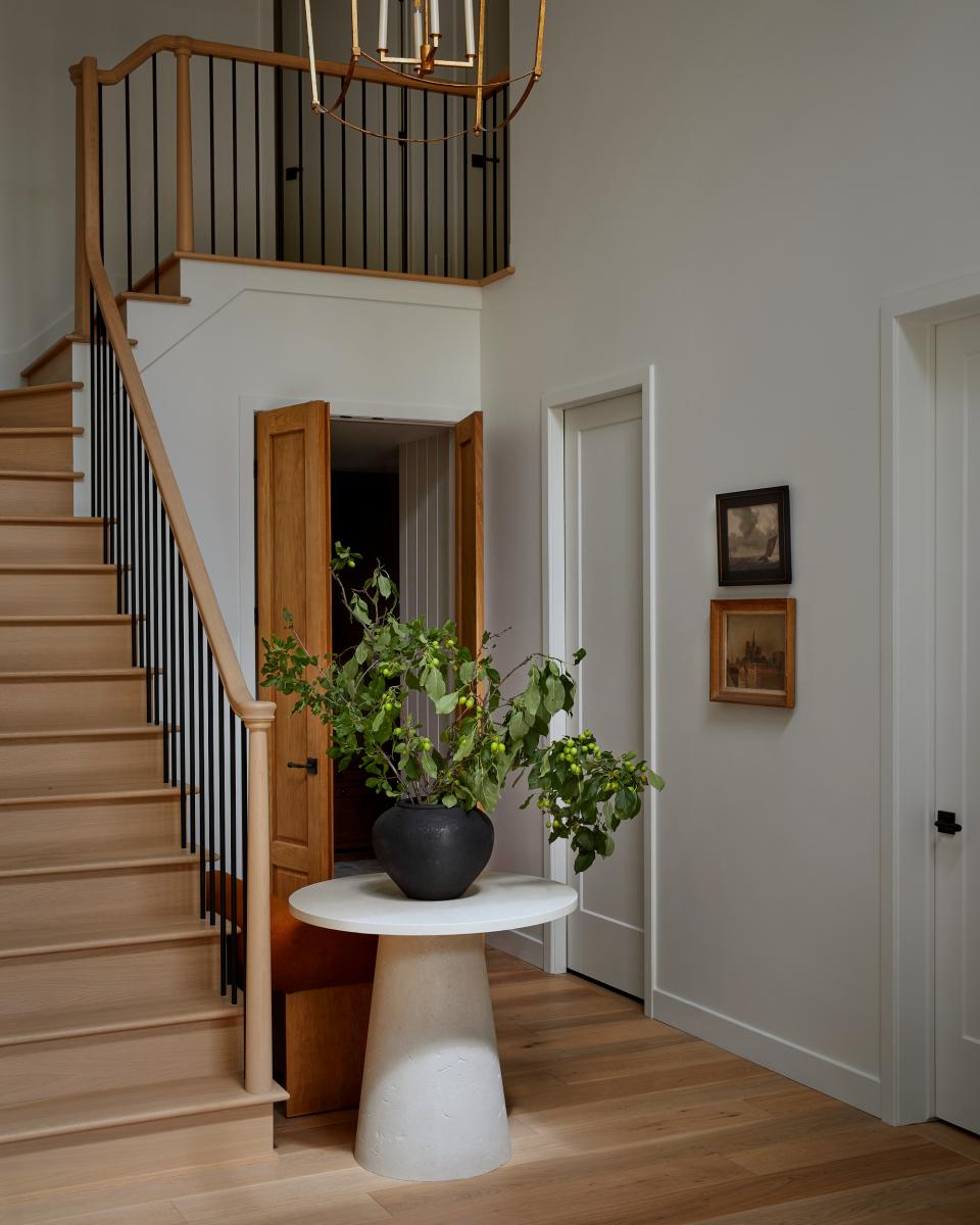 L’escalier, spacieux, ouvert et baigné de lumière, relie les deux niveaux dans un mouvement fluide, sous un plafond cathédrale qui accentue l’impression de grandeur et d’ouverture. En l’absence de sous-sol, des rangements sur mesure ont été intégrés de façon discrète, préservant ainsi la pureté et la cohérence du design.
