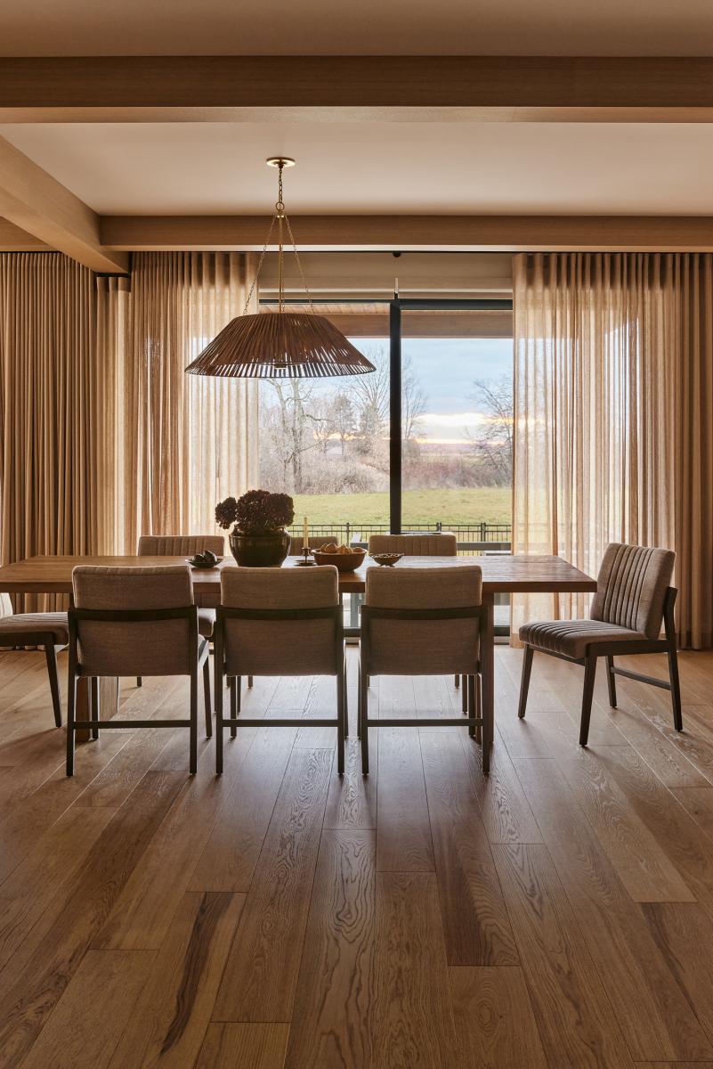 L’aire de vie ouverte, pensée dans une logique de continuité spatiale, est sublimée par une fenestration abondante qui capte la lumière naturelle à toute heure de la journée. Celle-ci devient un véritable élément architectural, révélant la richesse des matériaux et soulignant la géométrie simple mais éloquente de l’ensemble.
